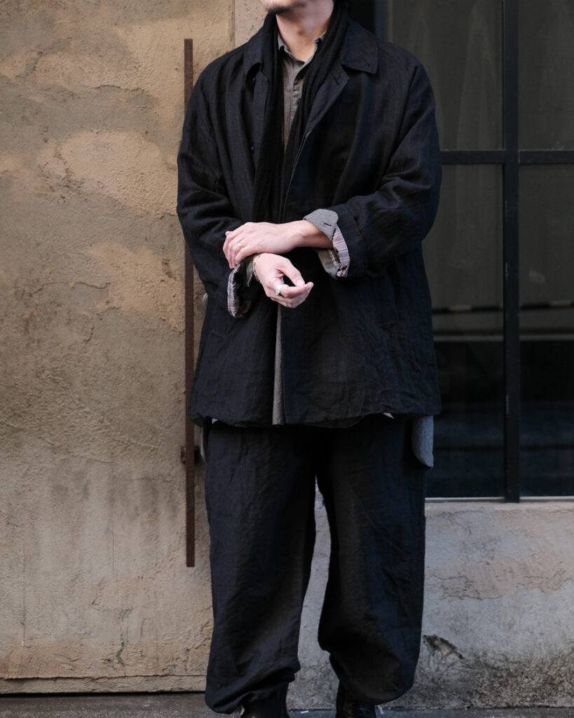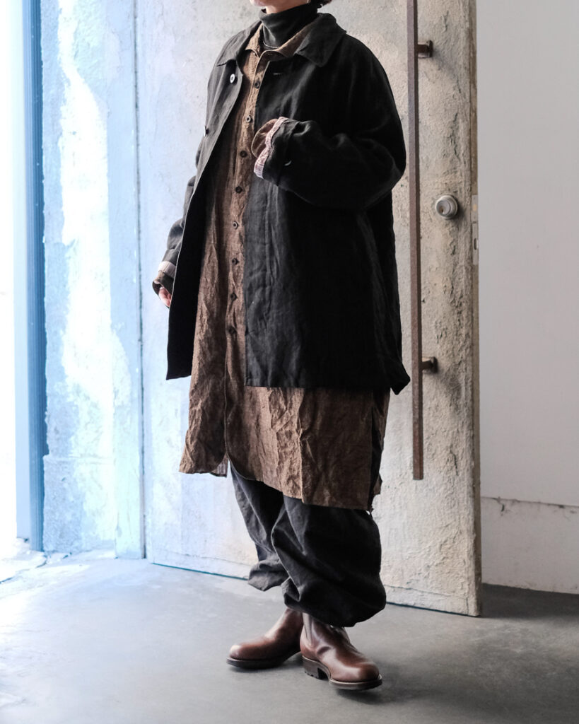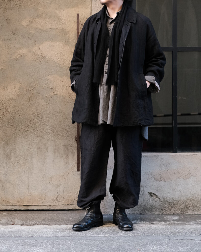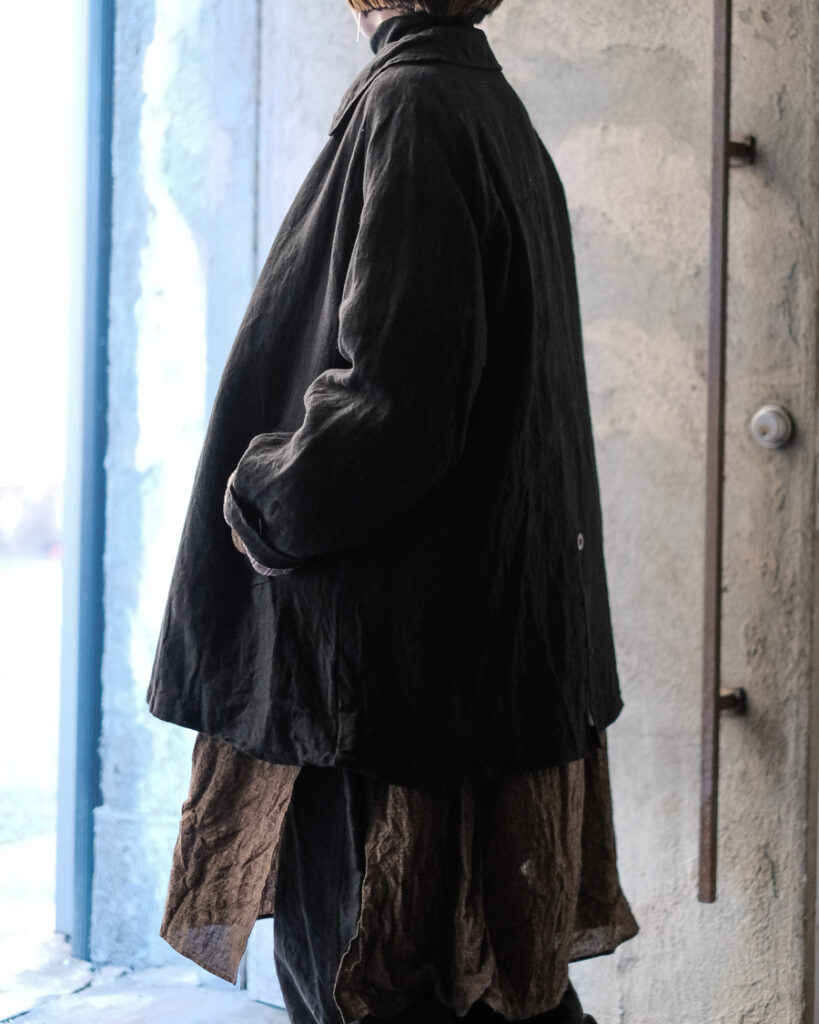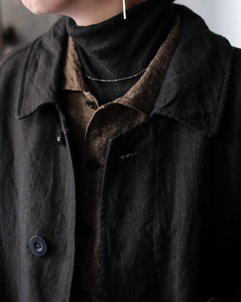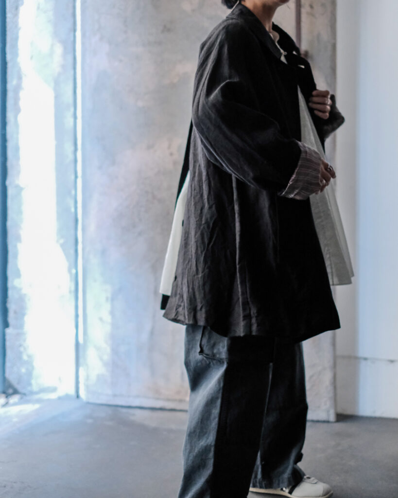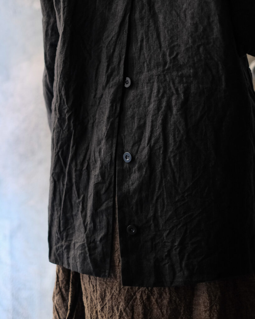 リネン100% 色合いもとても深い色調の黒。強撚糸のハリやコシも感じつつ、着れば着るほどにしなやかな揺らぎ、落ち感も感じます。