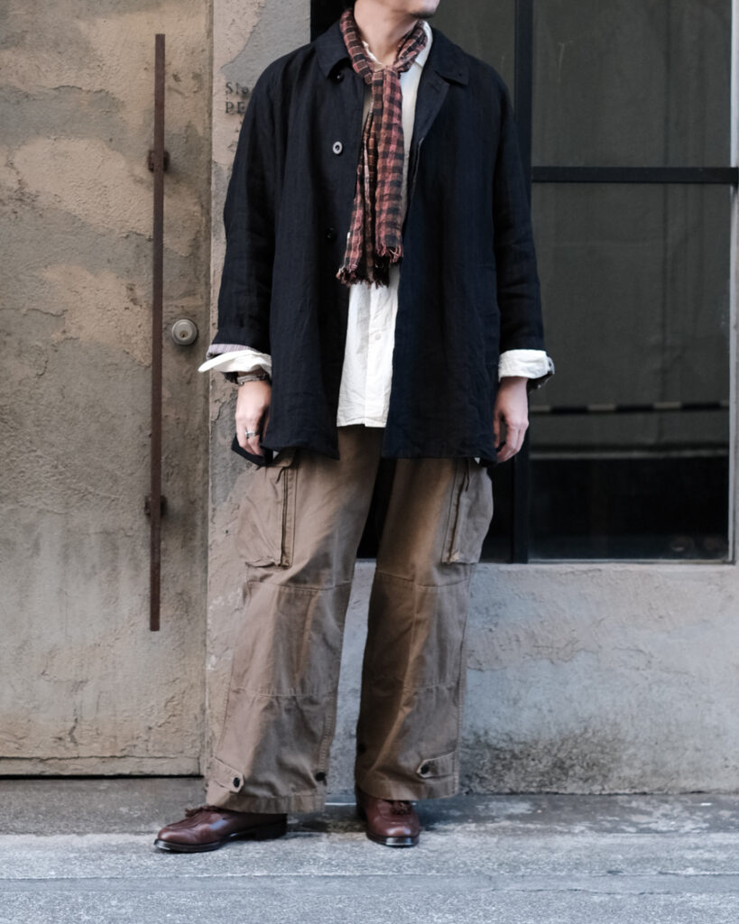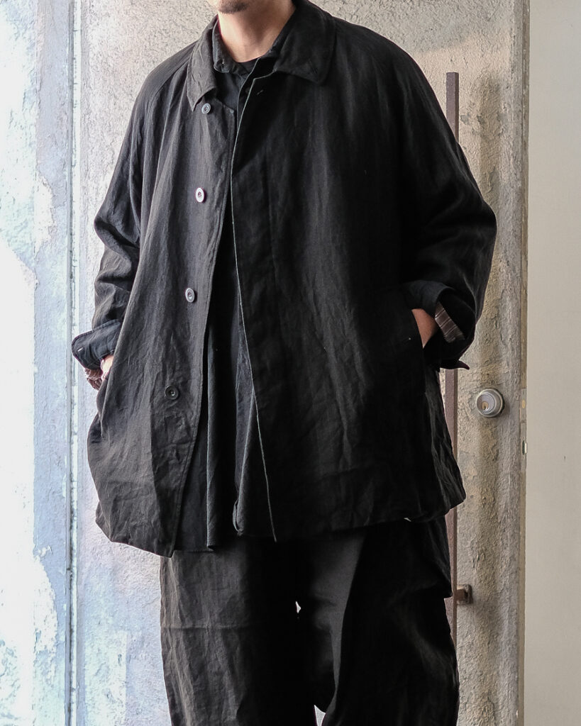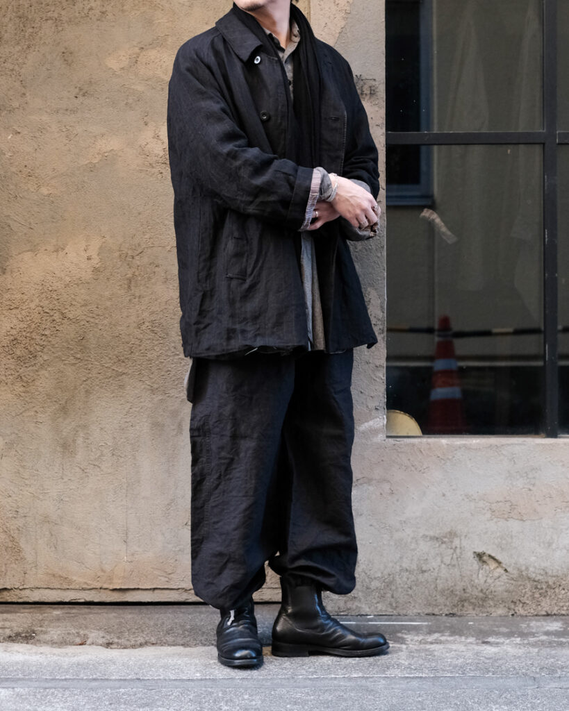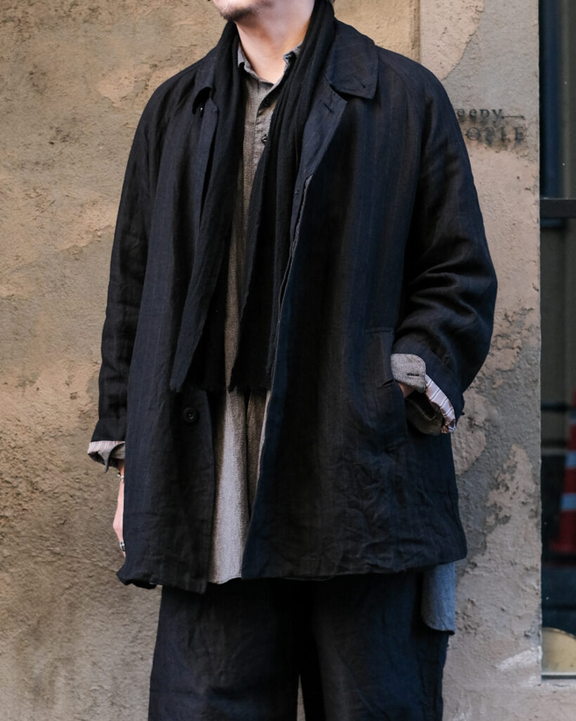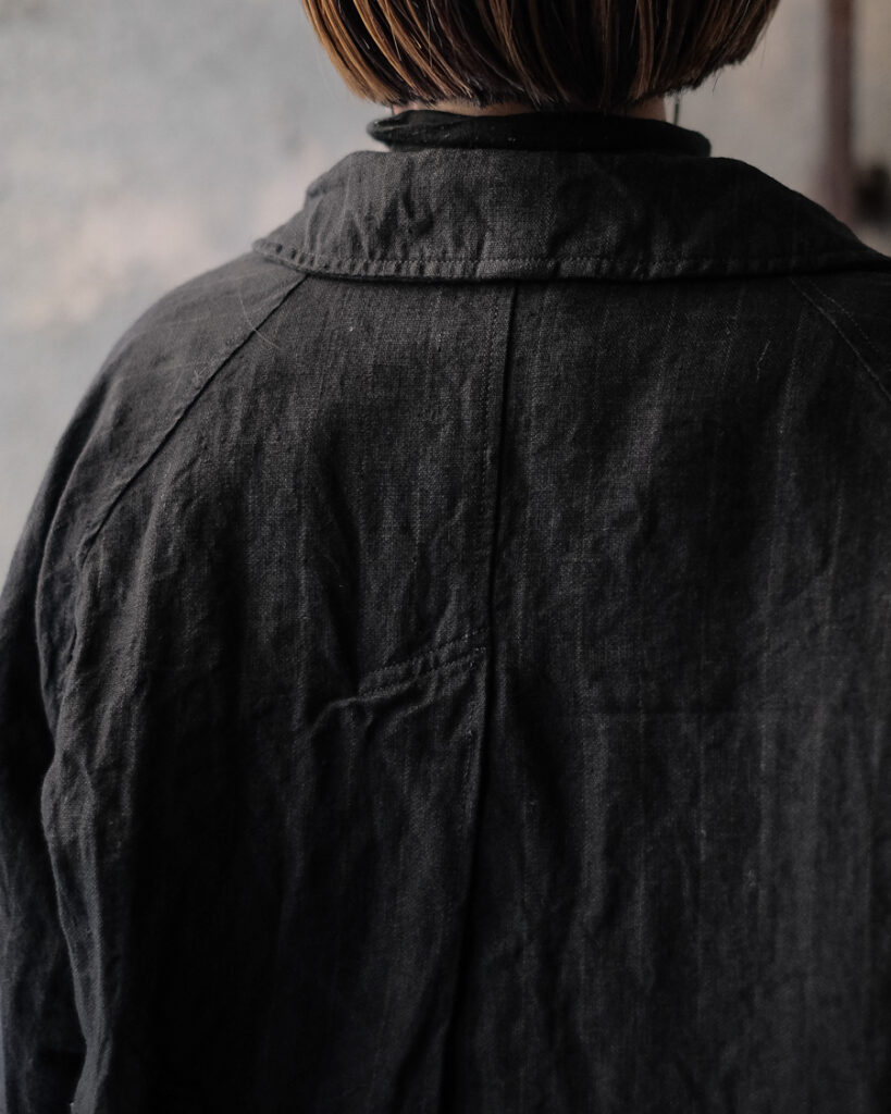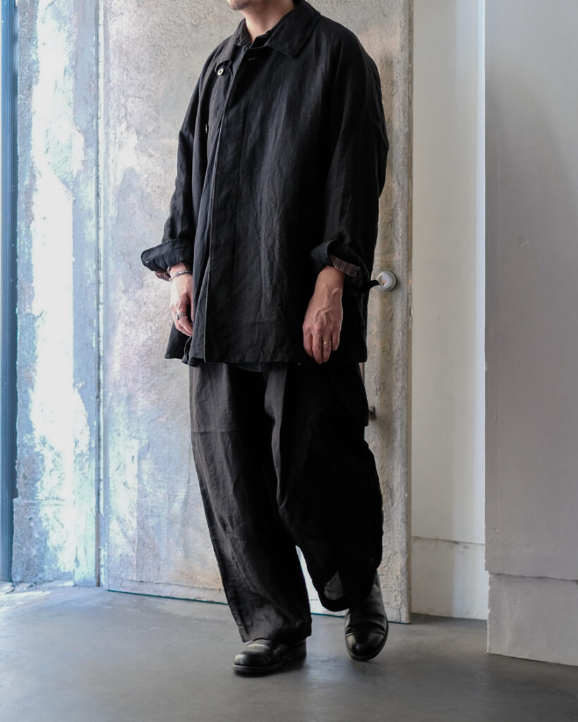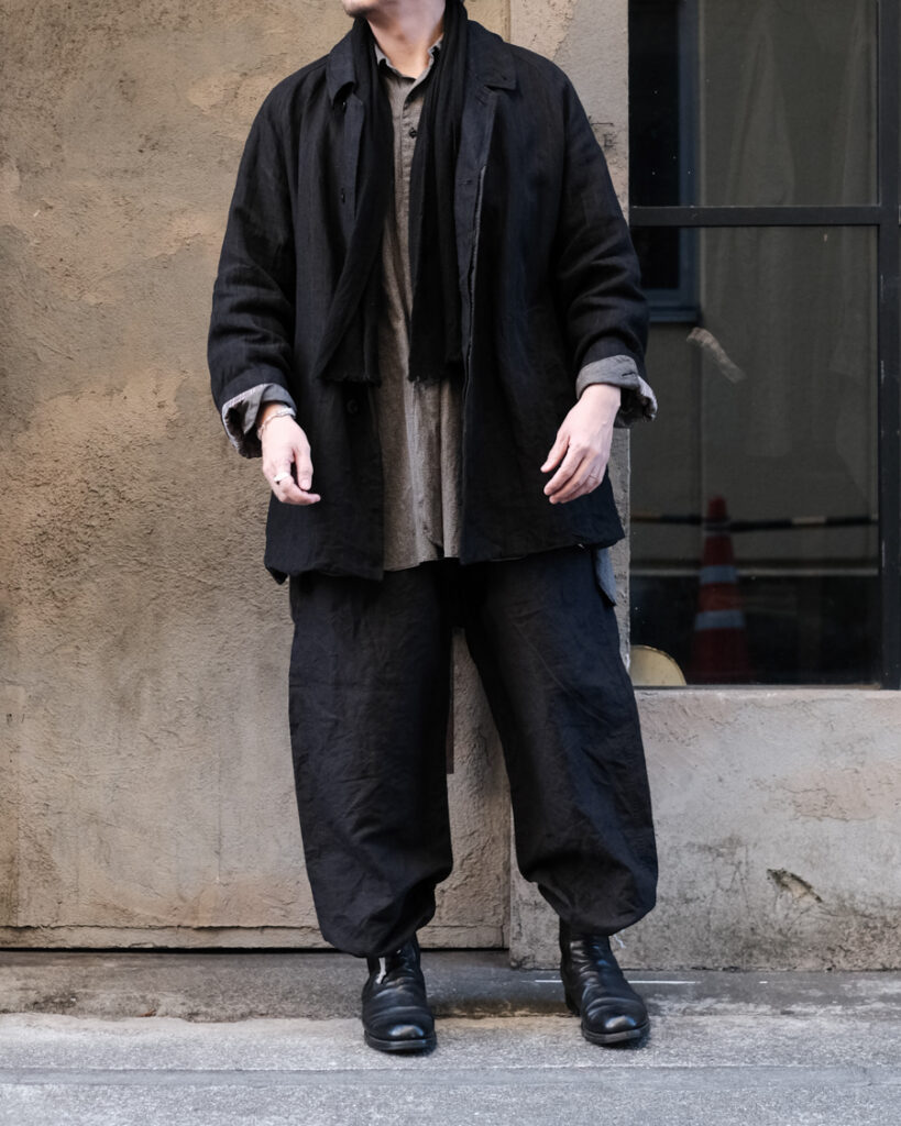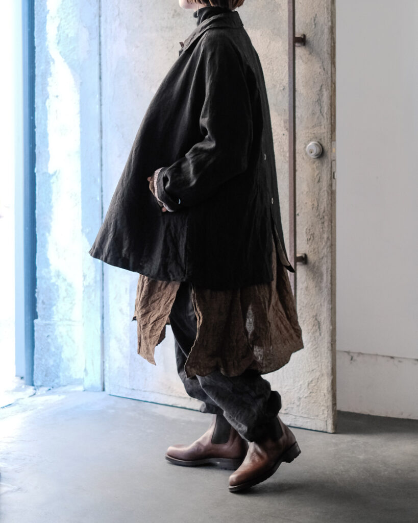リネン100% 色合いもとても深い色調の黒。強撚糸のハリやコシも感じつつ、着れば着るほどにしなやかな揺らぎ、落ち感も感じます。