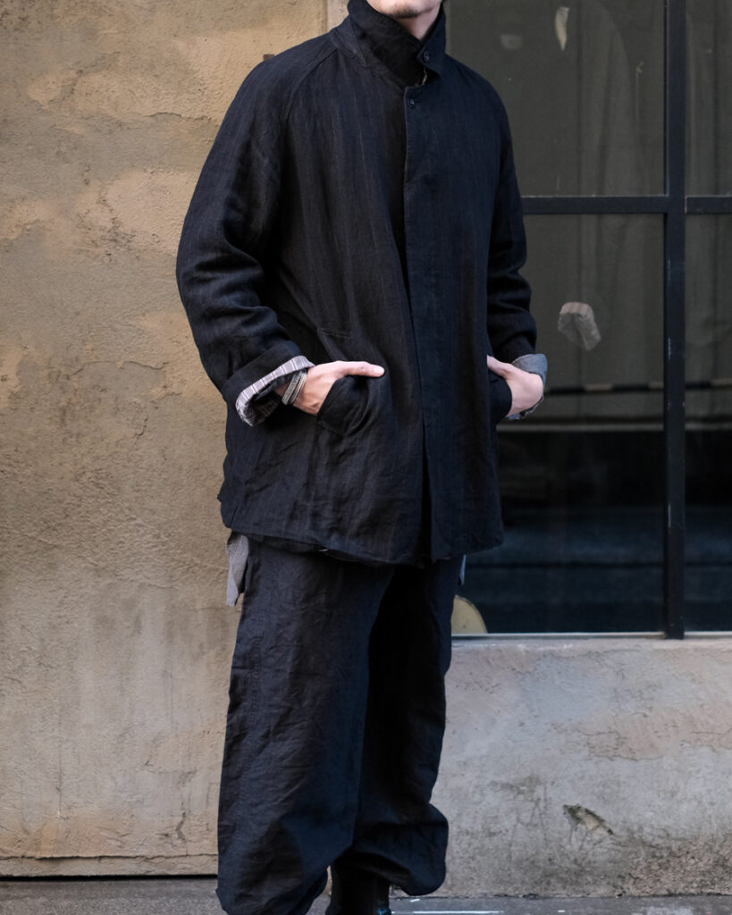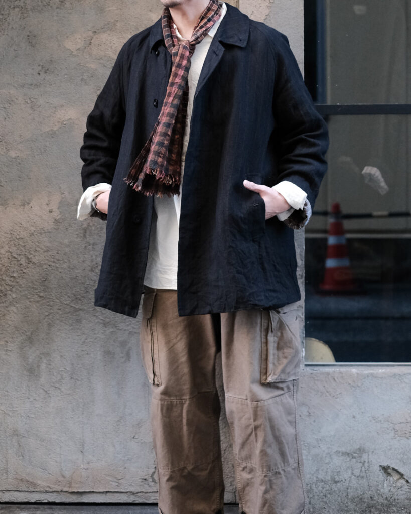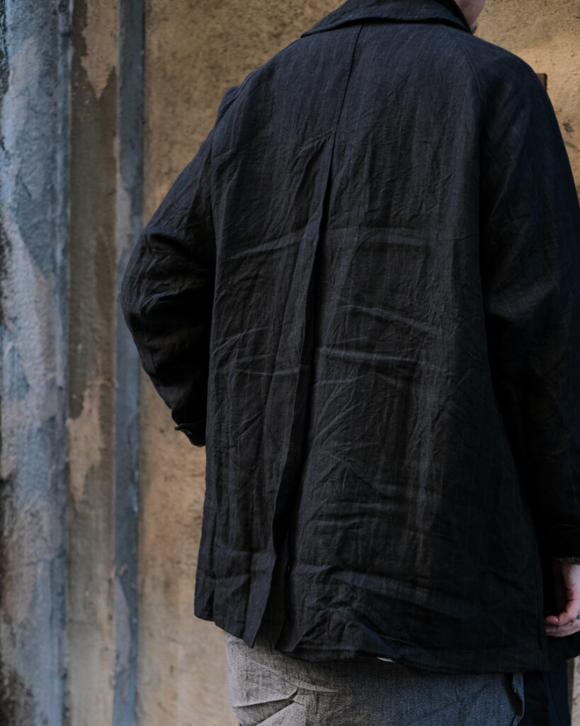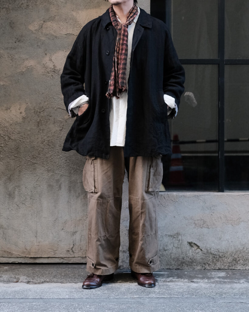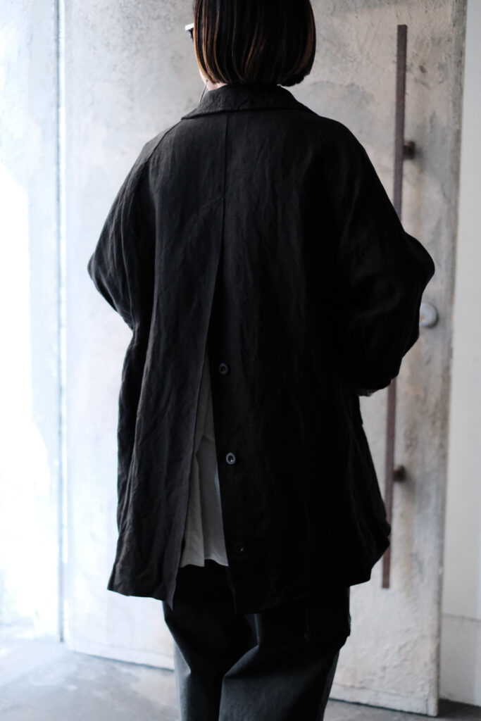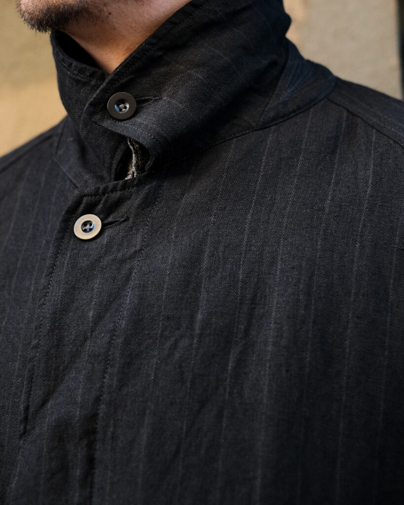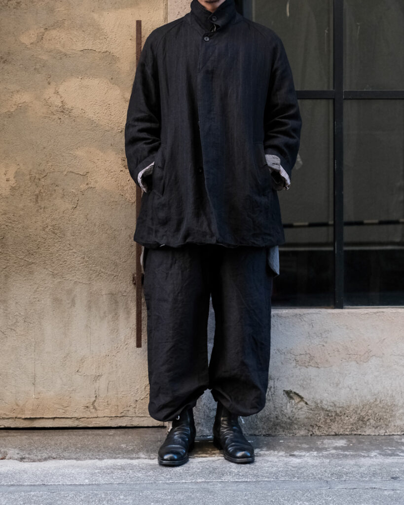 リネン100% 色合いもとても深い色調の黒。強撚糸のハリやコシも感じつつ、着れば着るほどにしなやかな揺らぎ、落ち感も感じます。