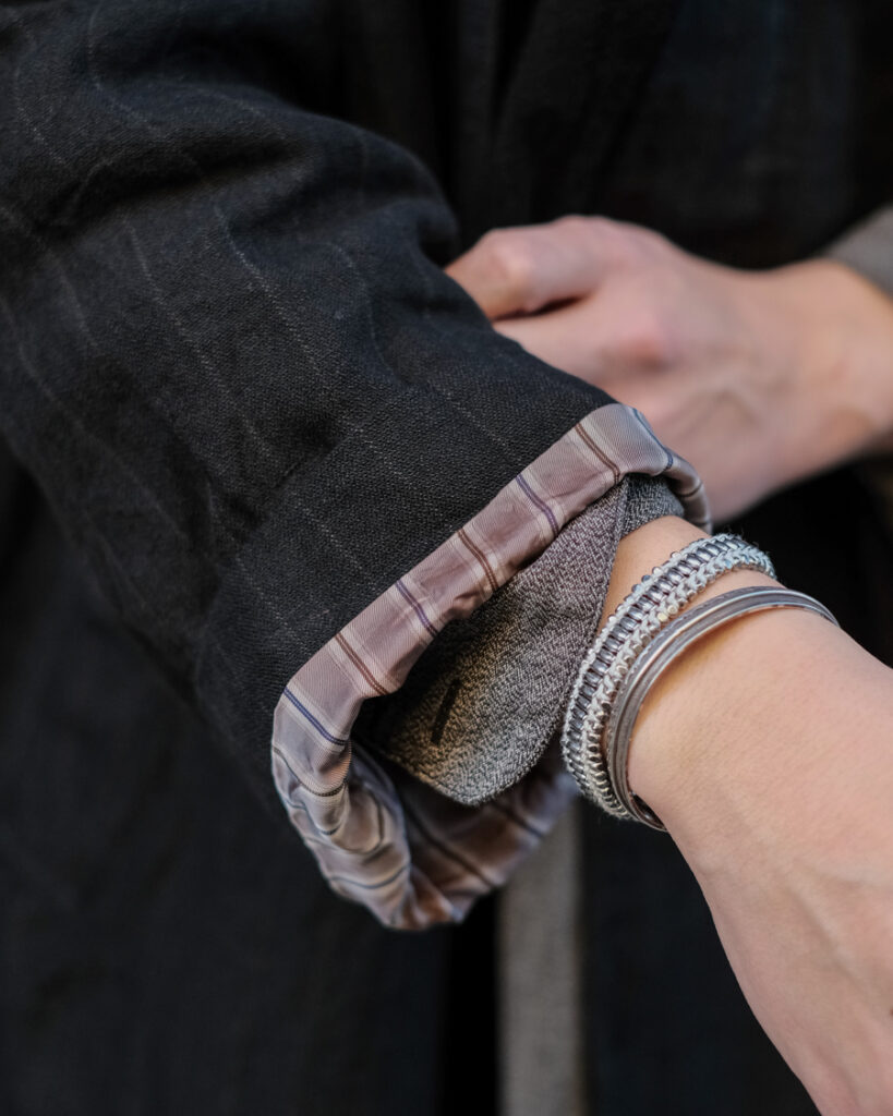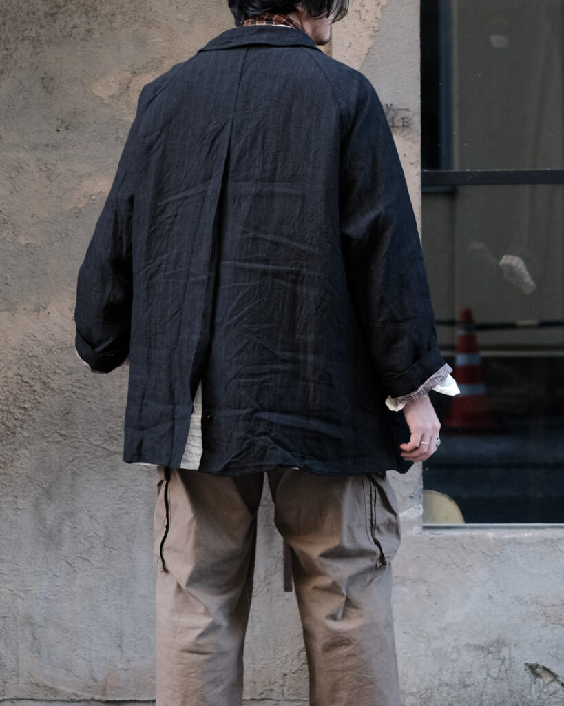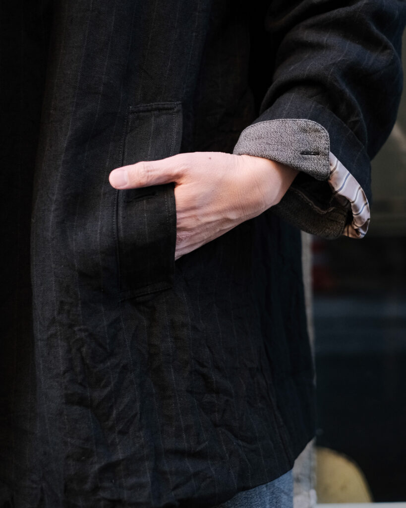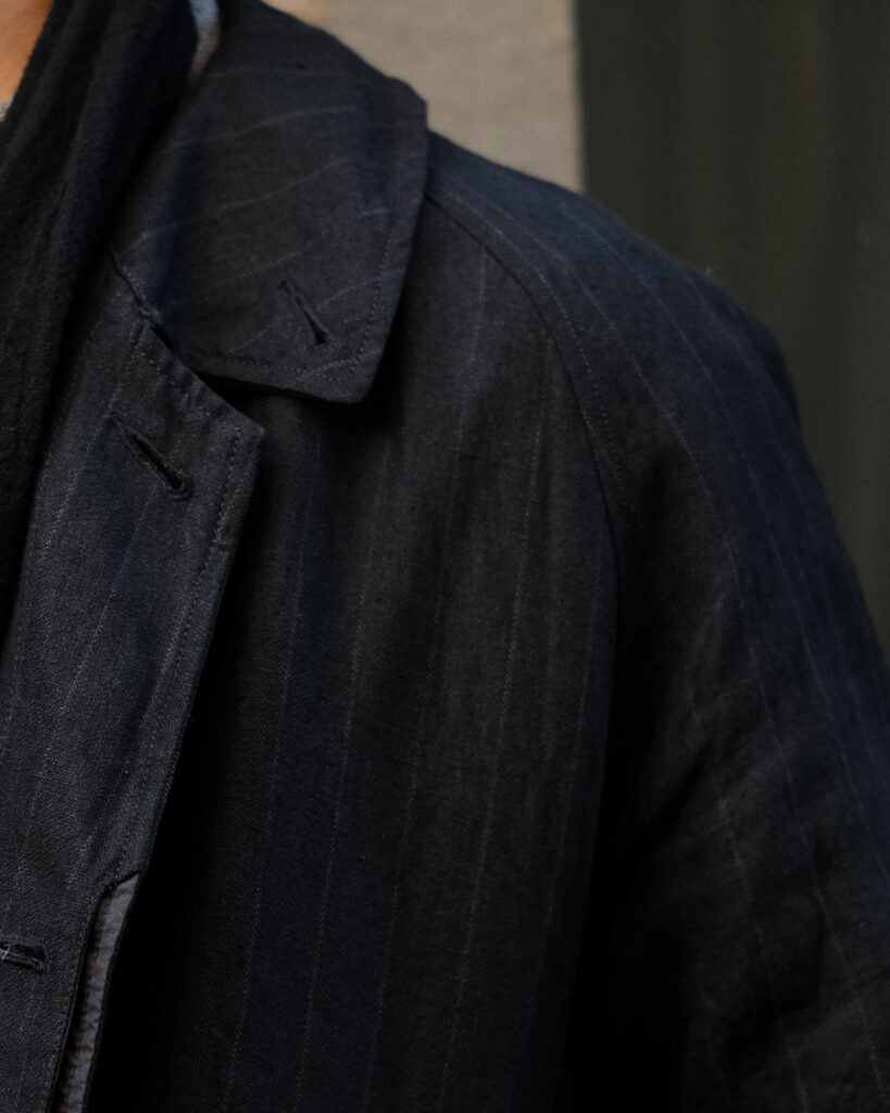 そして洋服の印象を最も左右する生地の表情がまた素晴らしく…. 強撚糸で織り上げられたストライプリネンヘリンボーン。 強撚糸のシャリッとした質感は昔から大好きなんですが、加えてとても艶やかで色気も感じる生地に仕上がっています。