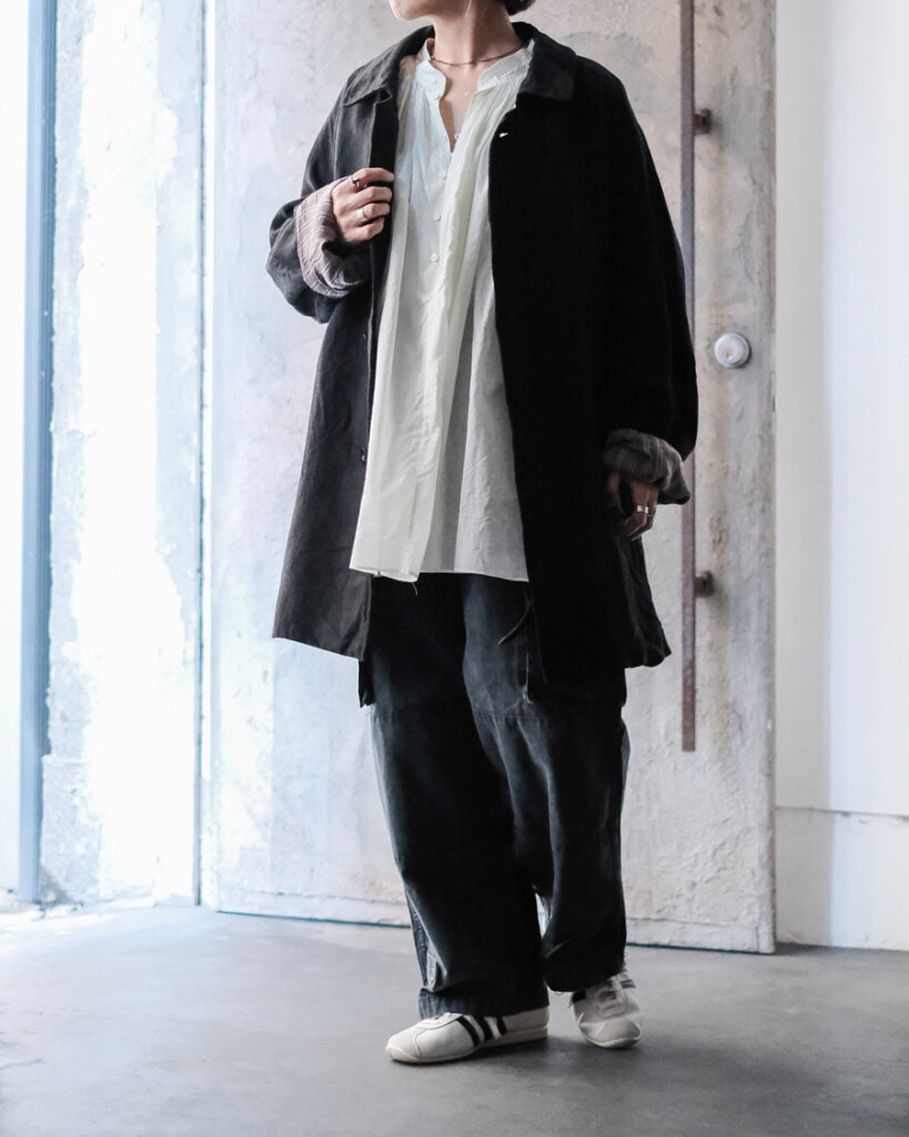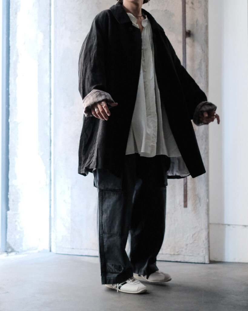 永遠のベーシックアイテム、ステンカラーコートもKLASICAの手に掛かるとここまで前衛的で魅力的な物に昇華されます。展示会で出会った時から個人的にも購入を即決したモデル。