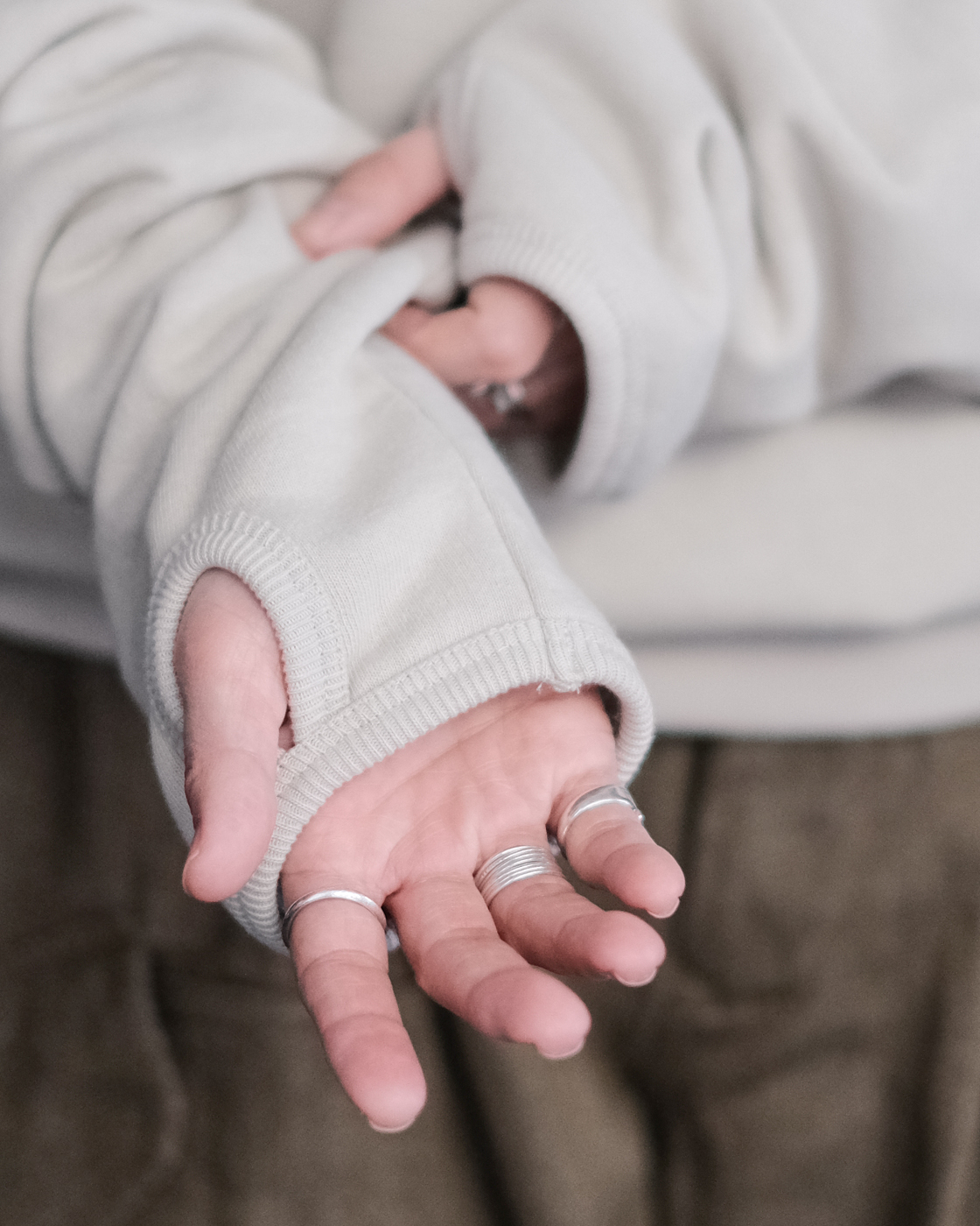 上からジャケットやコートを重ねた時の見え方や、手も温かく、一枚で着た時にもスタイルのアクセントになりますよね。