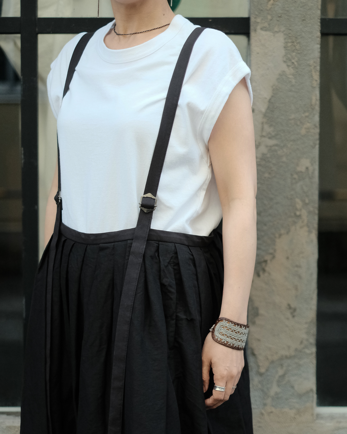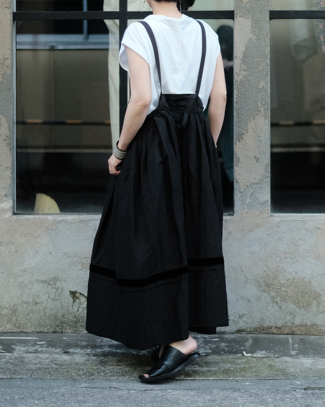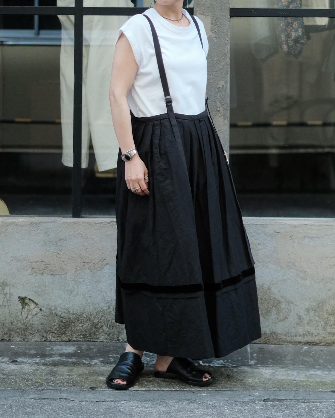 ロングスカートとしてはもちろん、紐をグッと上げてチュニックドレスのように着たり、そのバランスでボトムスにパンツを重ねて着たりと様々な着こなしを楽しんで頂けるサスペンダースカート。