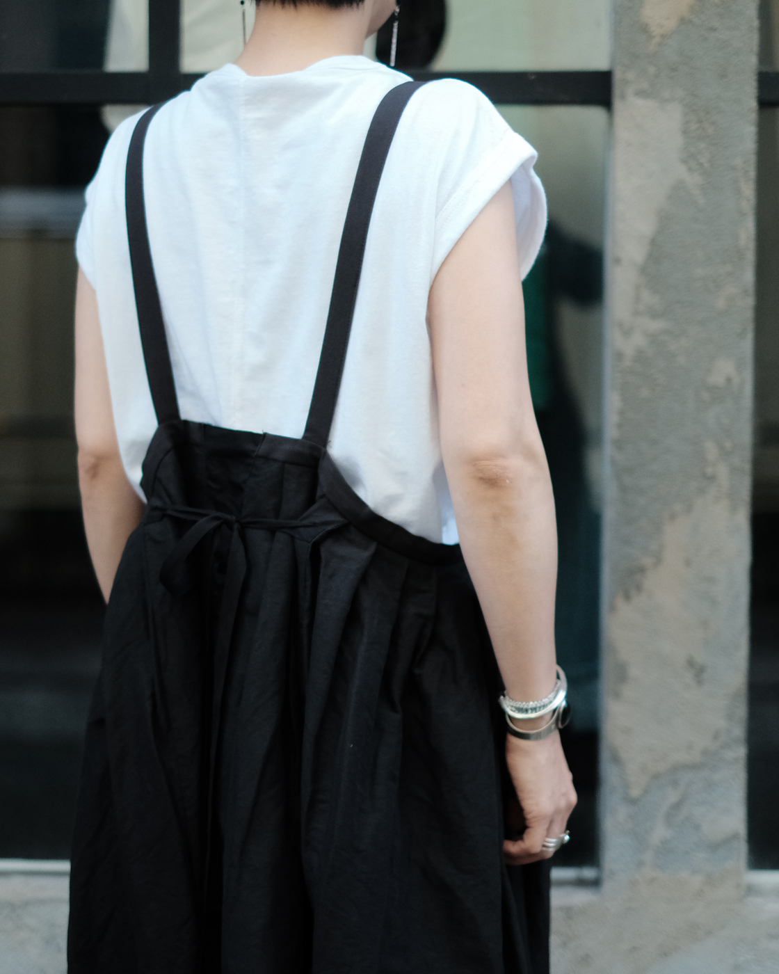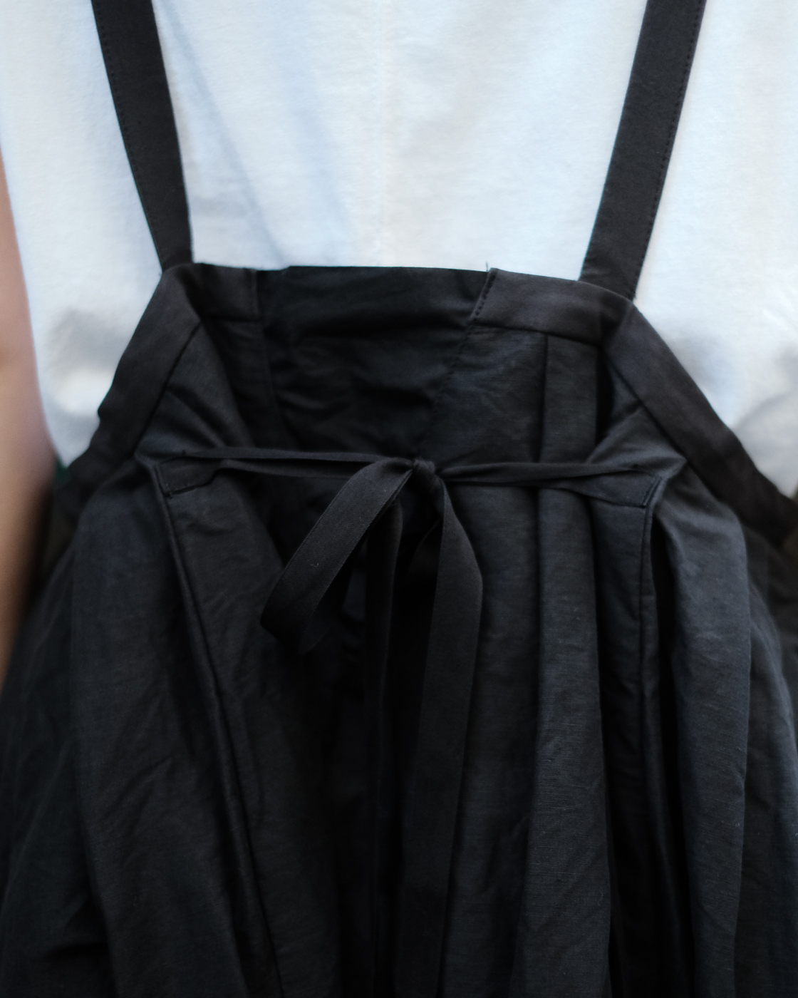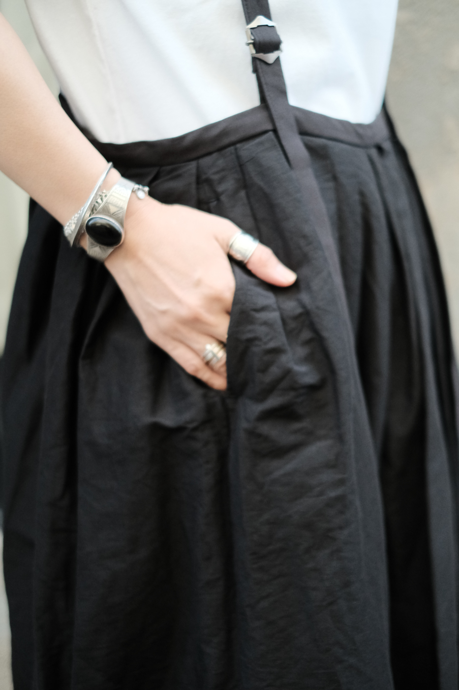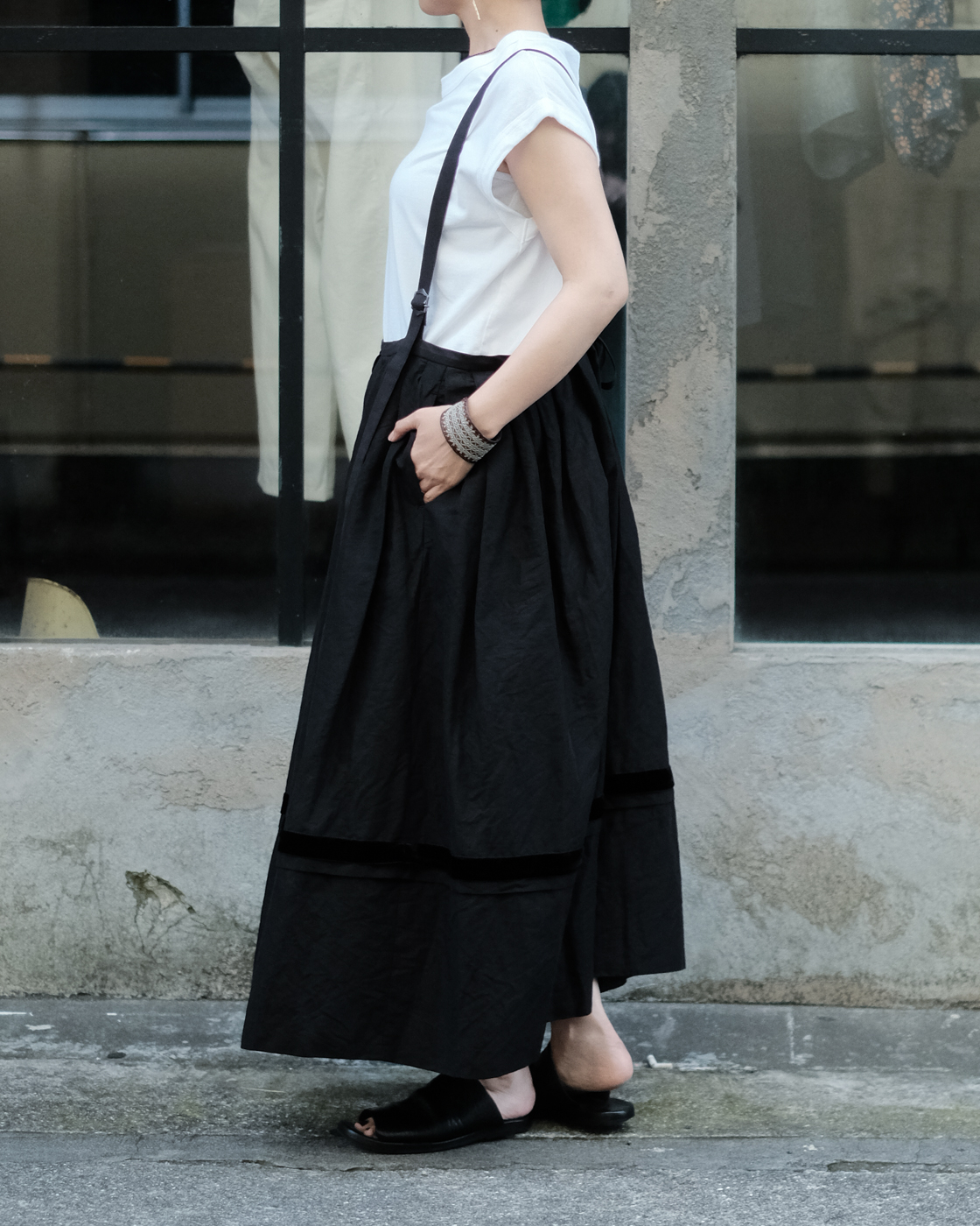 ロングスカートとしてはもちろん、紐をグッと上げてチュニックドレスのように着たり、そのバランスでボトムスにパンツを重ねて着たりと様々な着こなしを楽しんで頂けるサスペンダースカート。