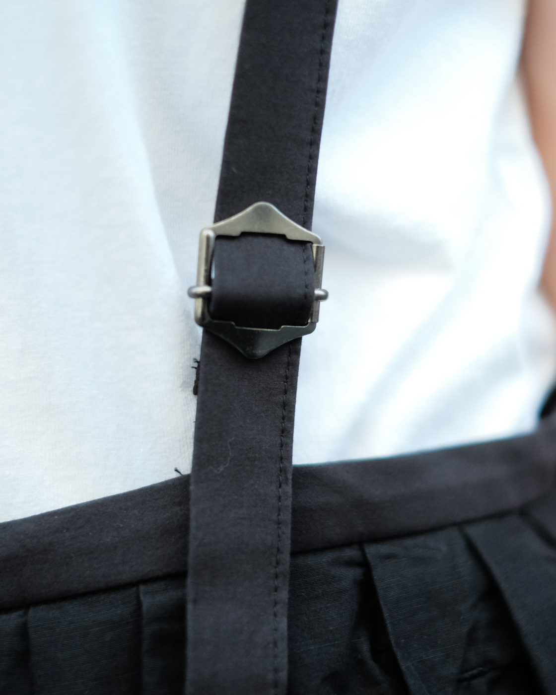 細めな吊り紐部分で長さを調節して頂けるので、お好みのバランスで着て頂けます。