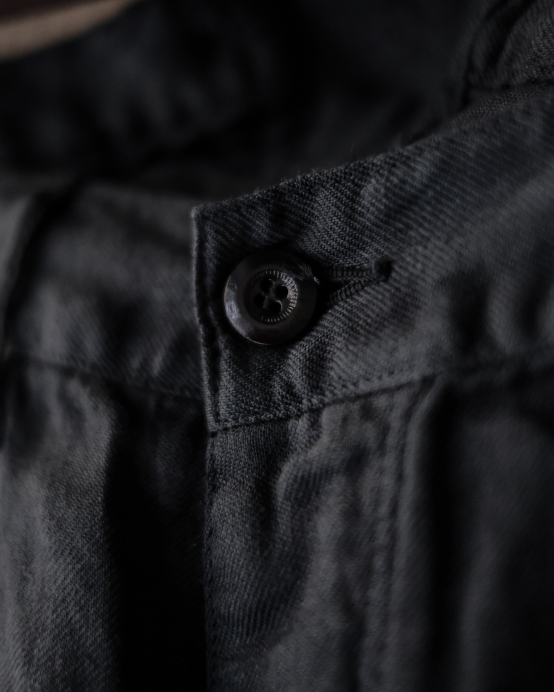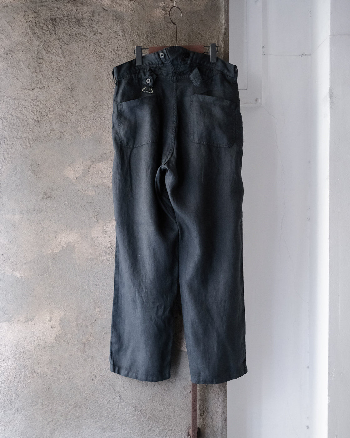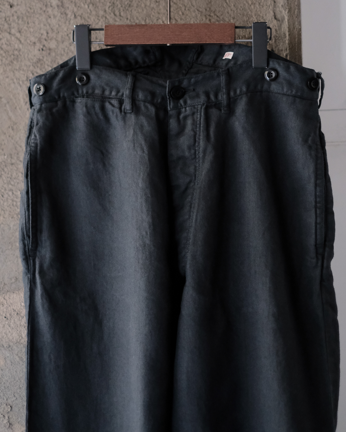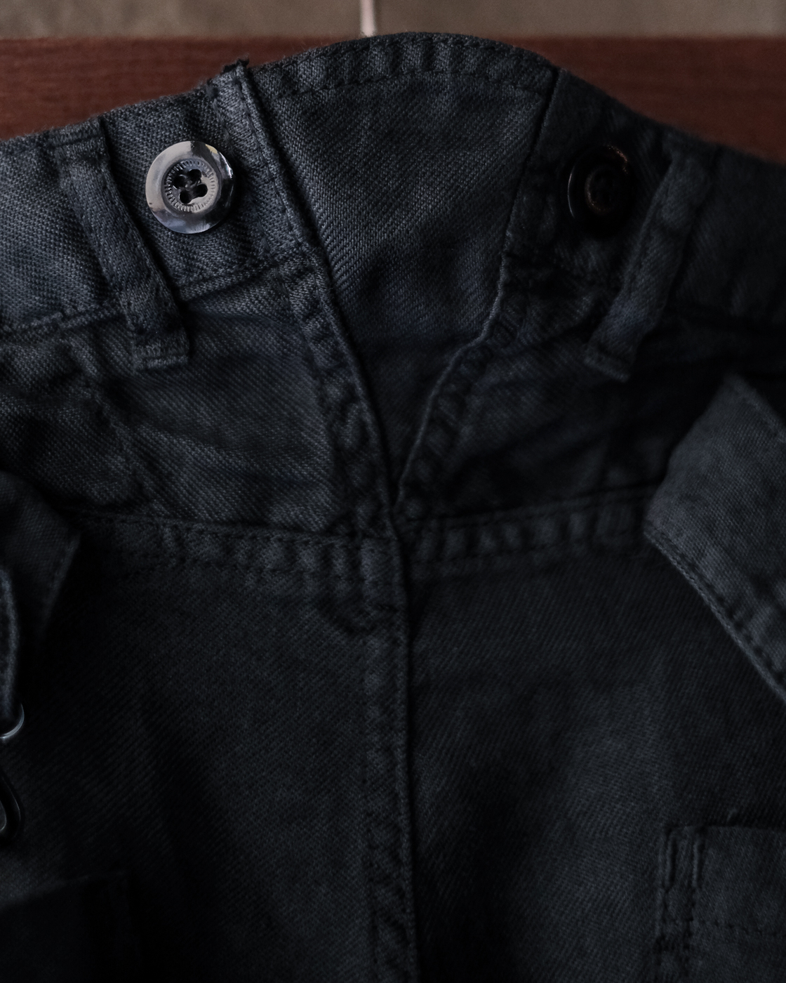 1930’sフランス海軍の作業用ドラウザーがベースとなり、元々サスペンダーでの吊り穿きするような仕様の為、ウエスト部分にサスペンダー釦が取り付けられています。