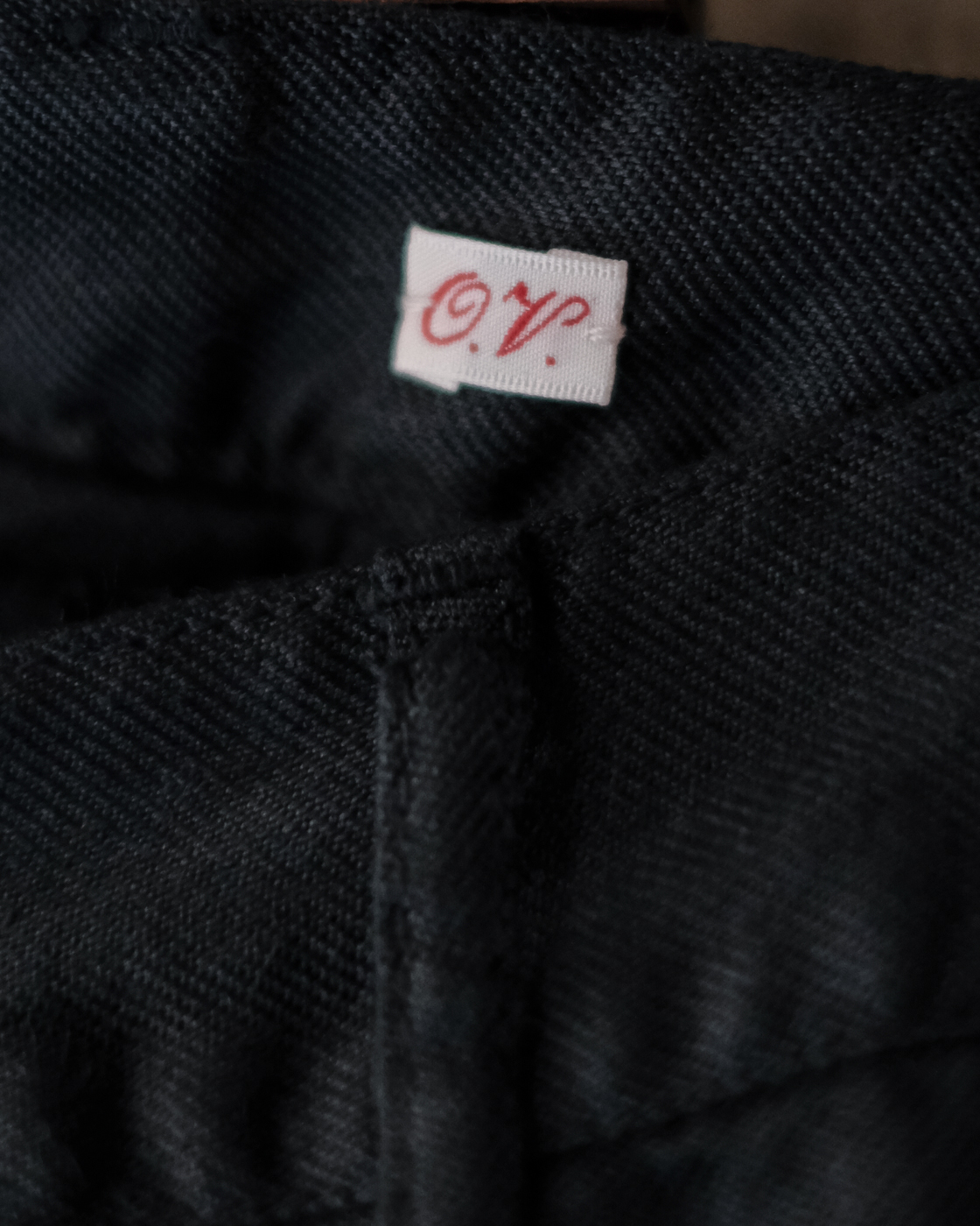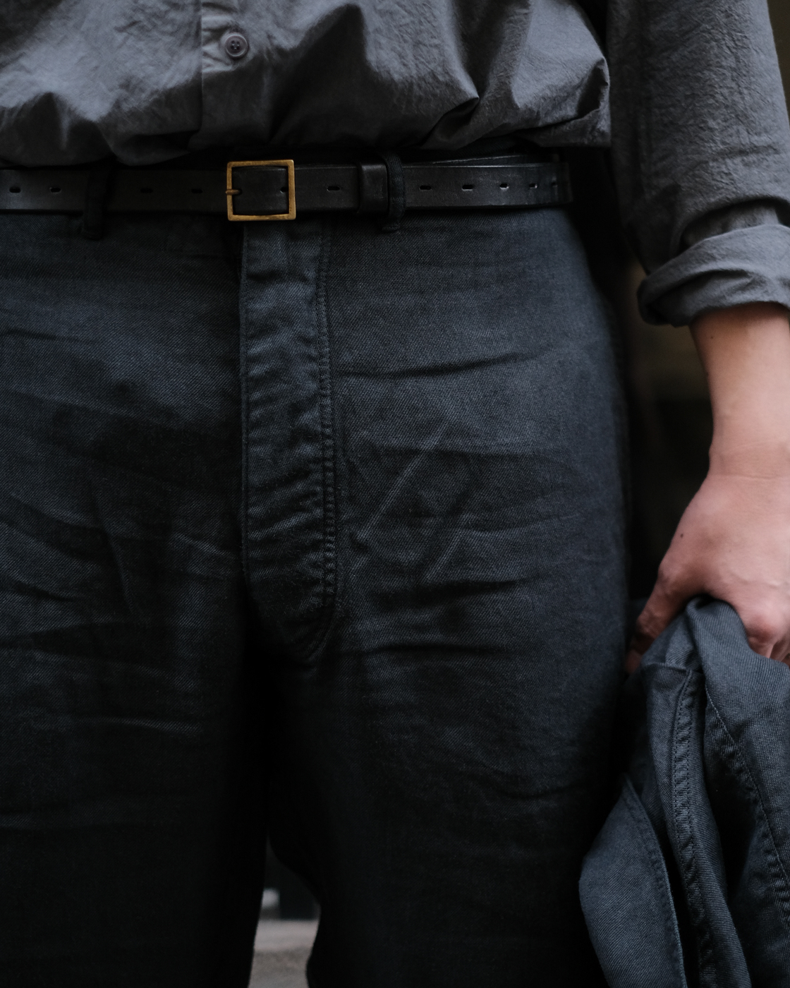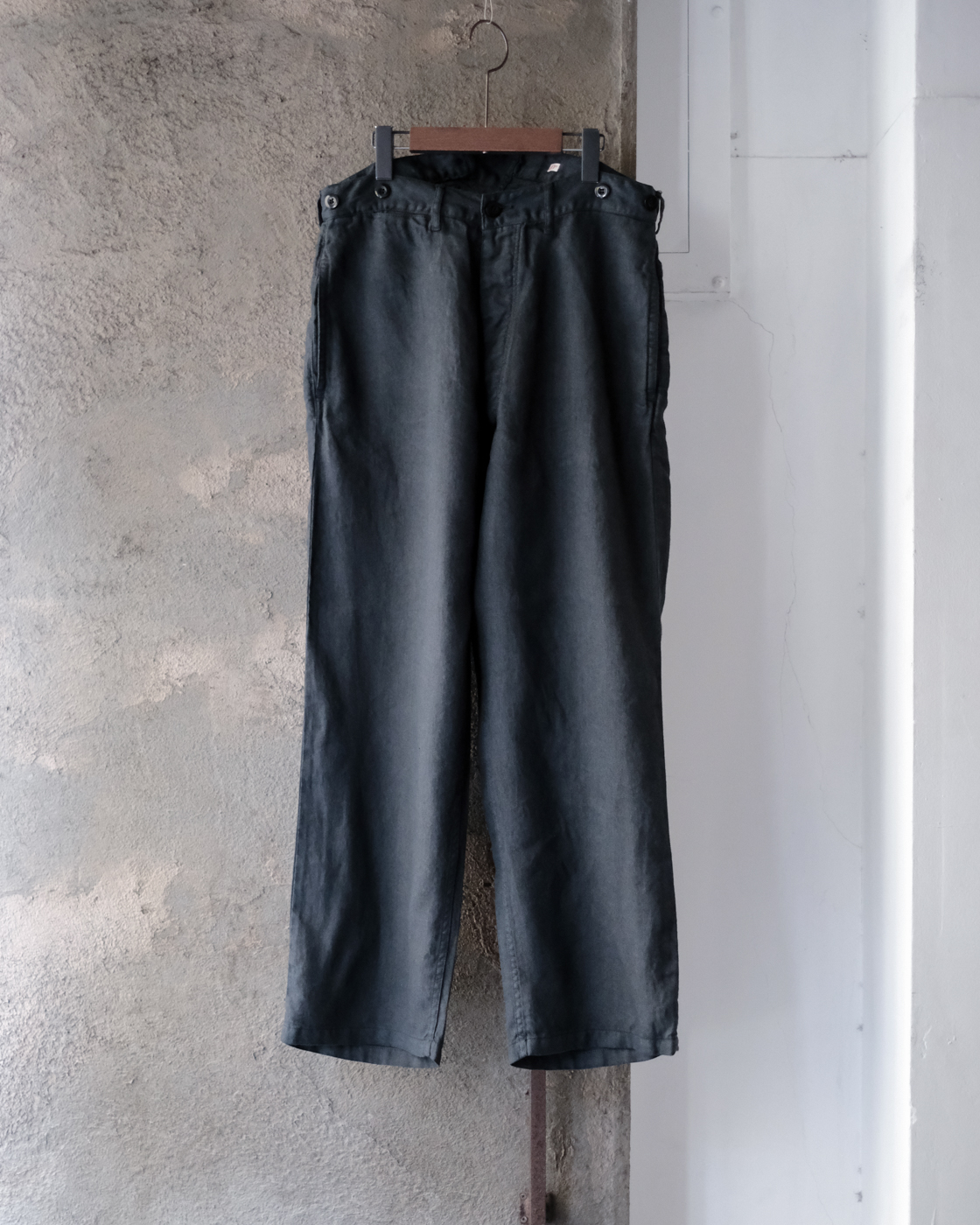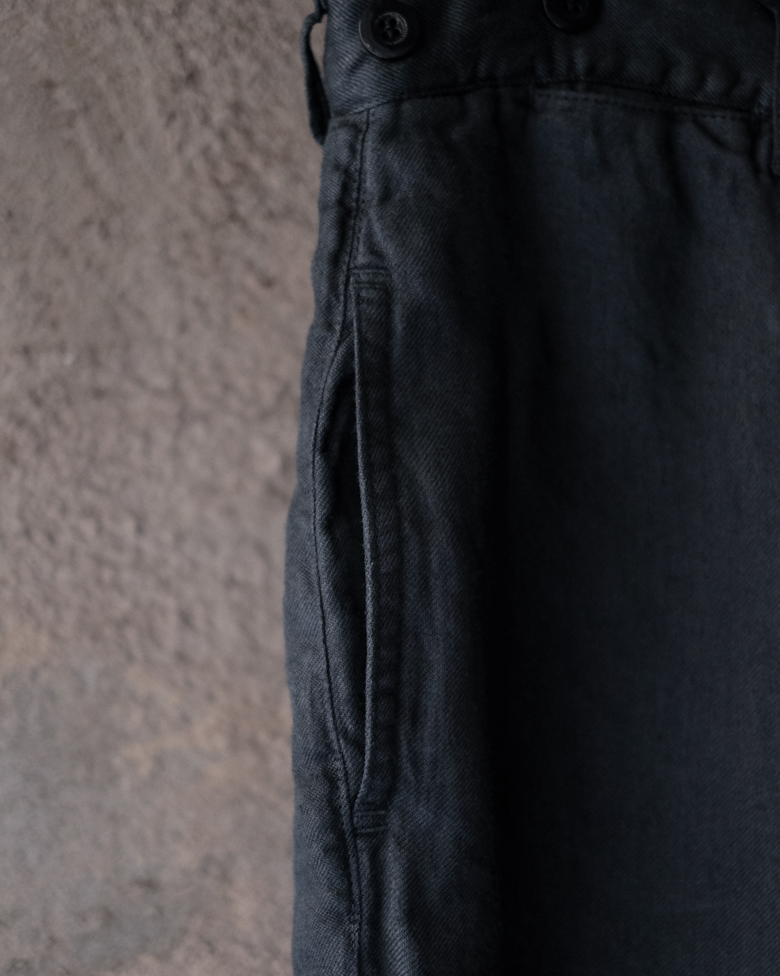 1930’sフランス海軍の作業用ドラウザーがベースとなり、元々サスペンダーでの吊り穿きするような仕様の為、ウエスト部分にサスペンダー釦が取り付けられています。