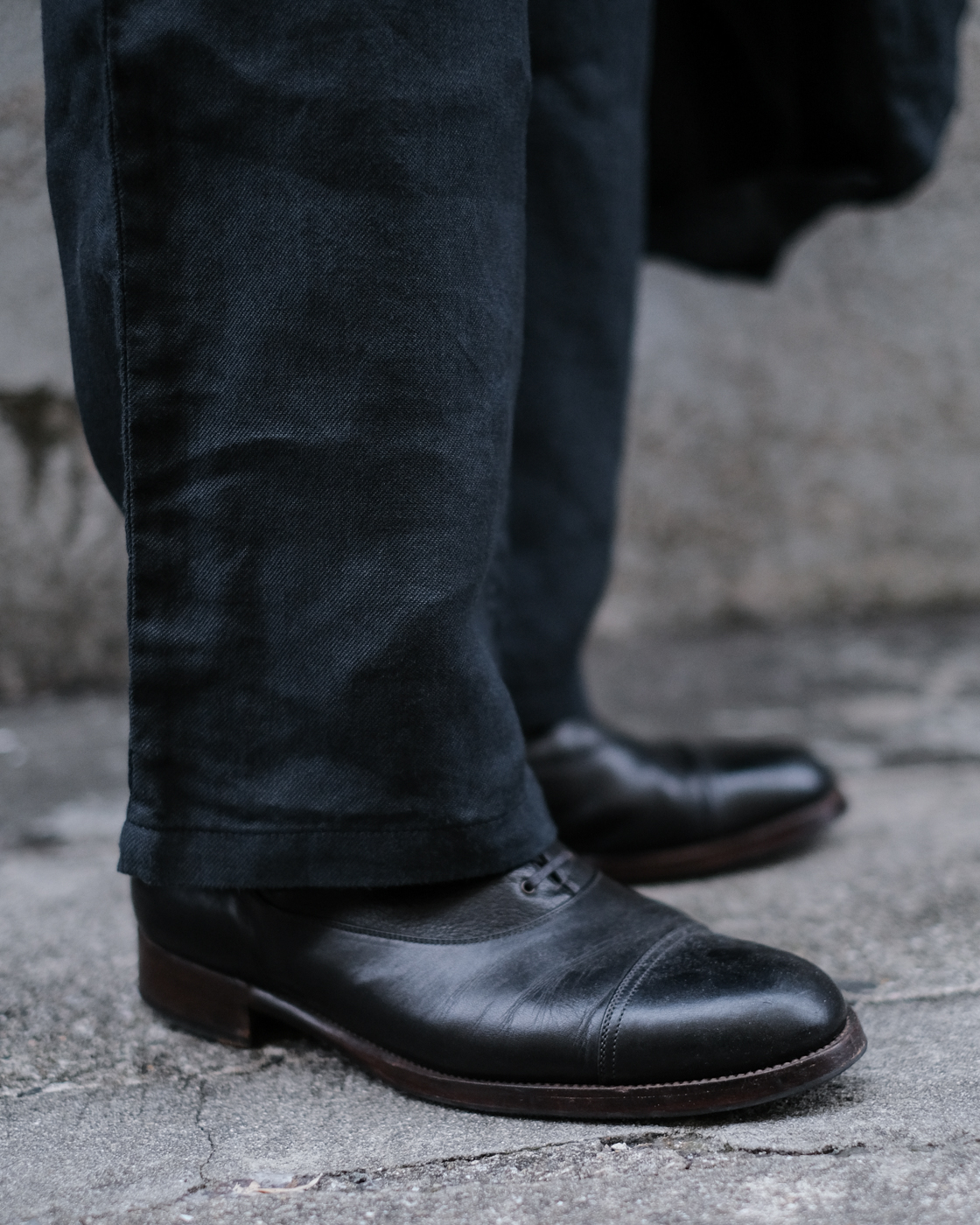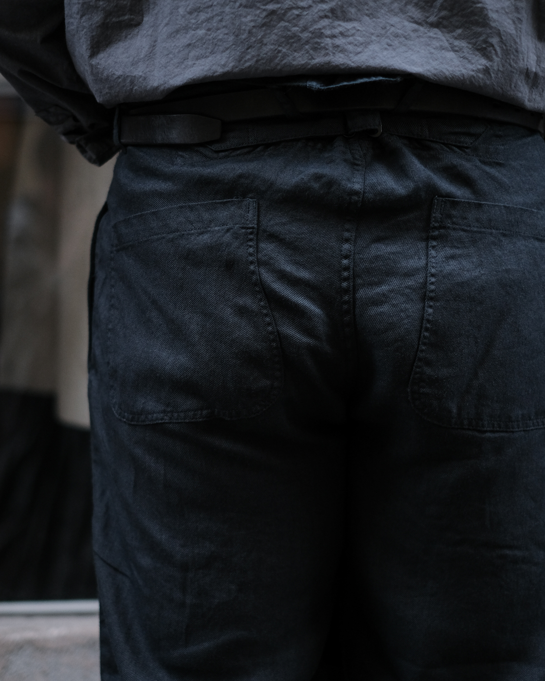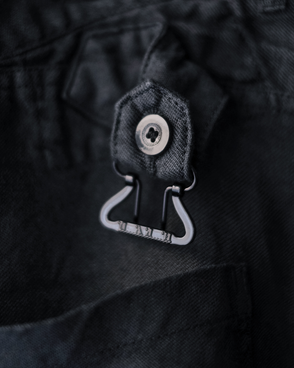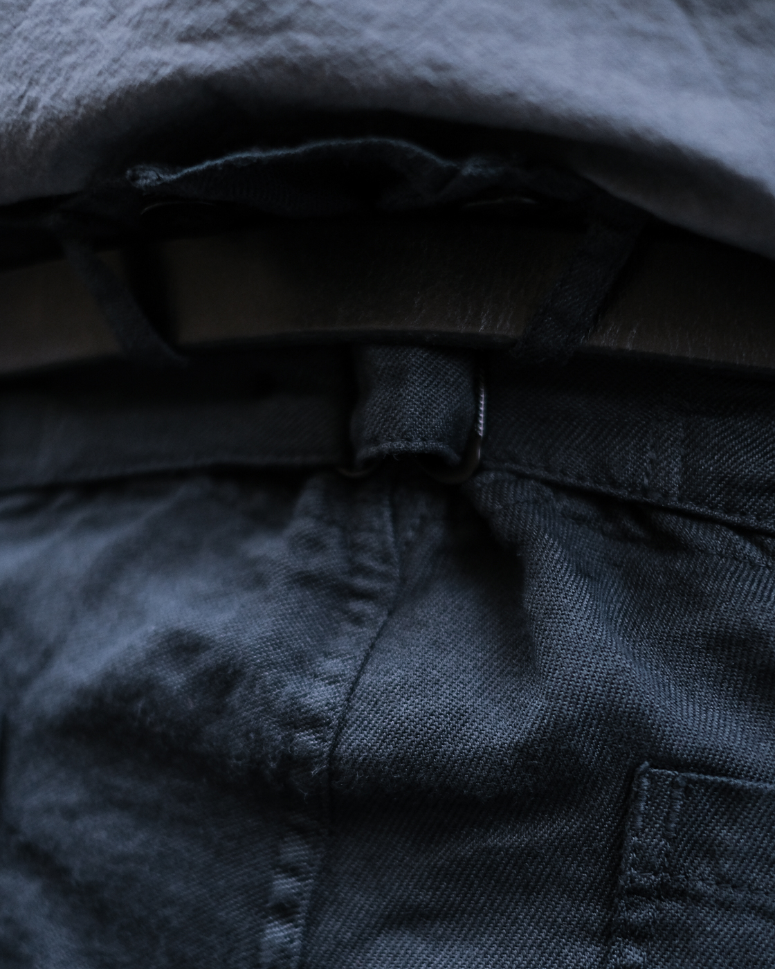 1930’sフランス海軍の作業用ドラウザーがベースとなり、元々サスペンダーでの吊り穿きするような仕様の為、ウエスト部分にサスペンダー釦が取り付けられています。