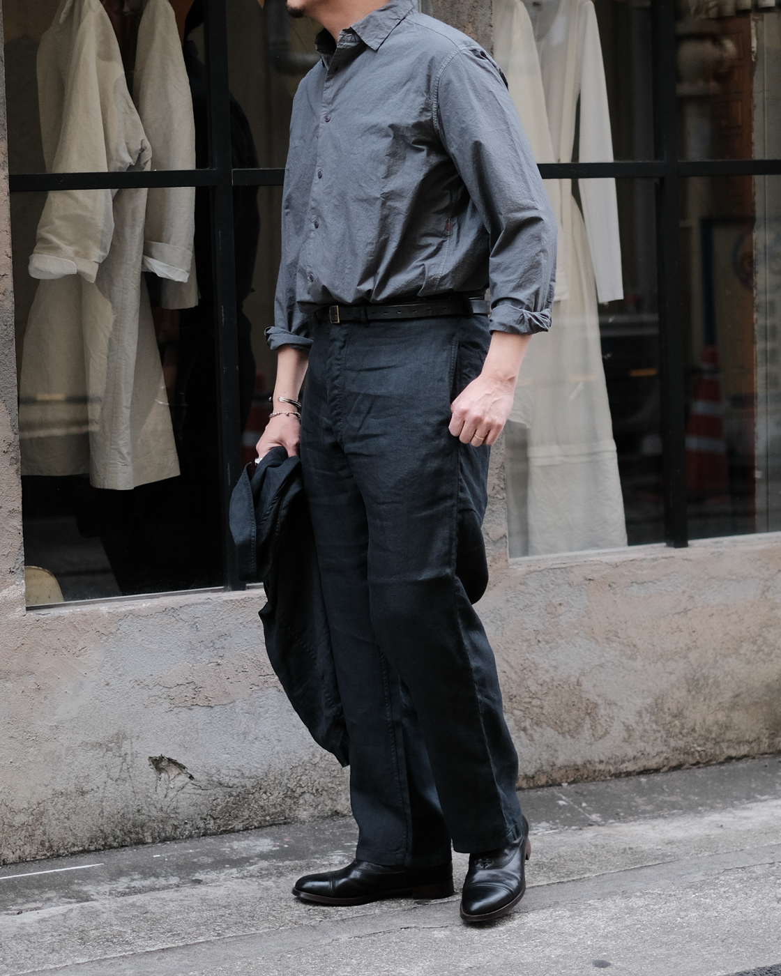 リラックス感のある穿き心地ながら、落ち感が綺麗なパンツは足をすっきりと見せてくれる。
