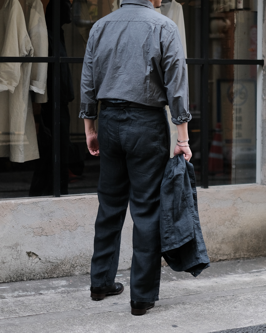 今回は双糸のラミーをゆるいテンションで織りあげて製作されたOUTILオリジナルツイル素材。