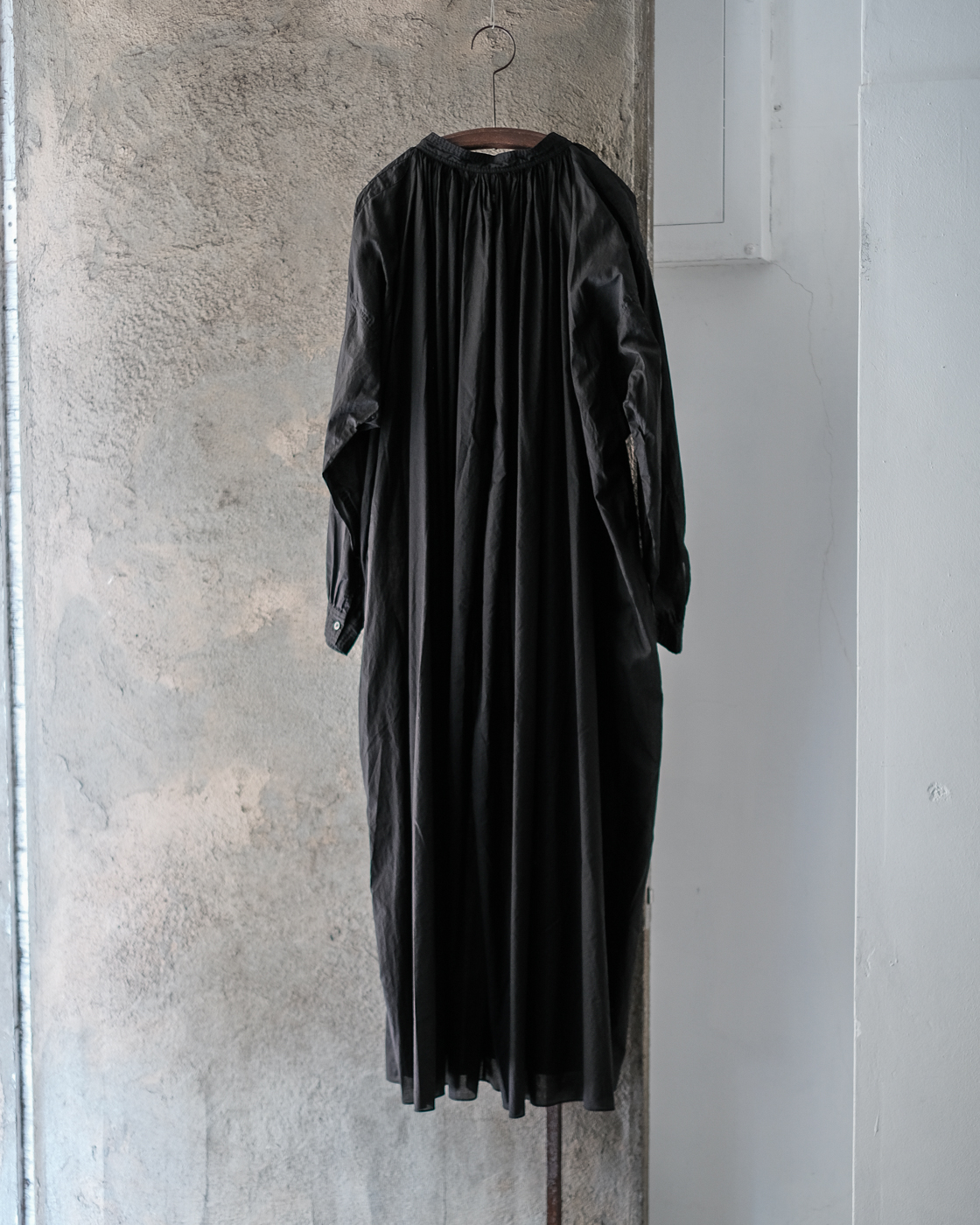 19世紀の古いスモックをベースに製作された細やかなギャザーに丁寧な縫製に思わず目が止まる、存在感のあるロングドレス。