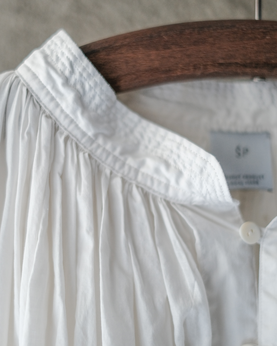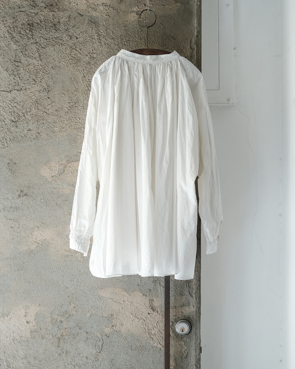 19世紀の古いスモックをベースに製作された細やかなギャザーに丁寧な縫製に思わず目が止まる、存在感のあるブラウス。