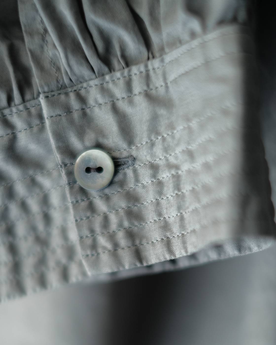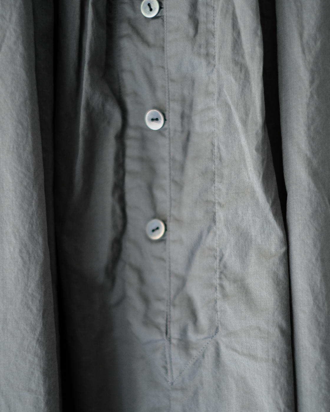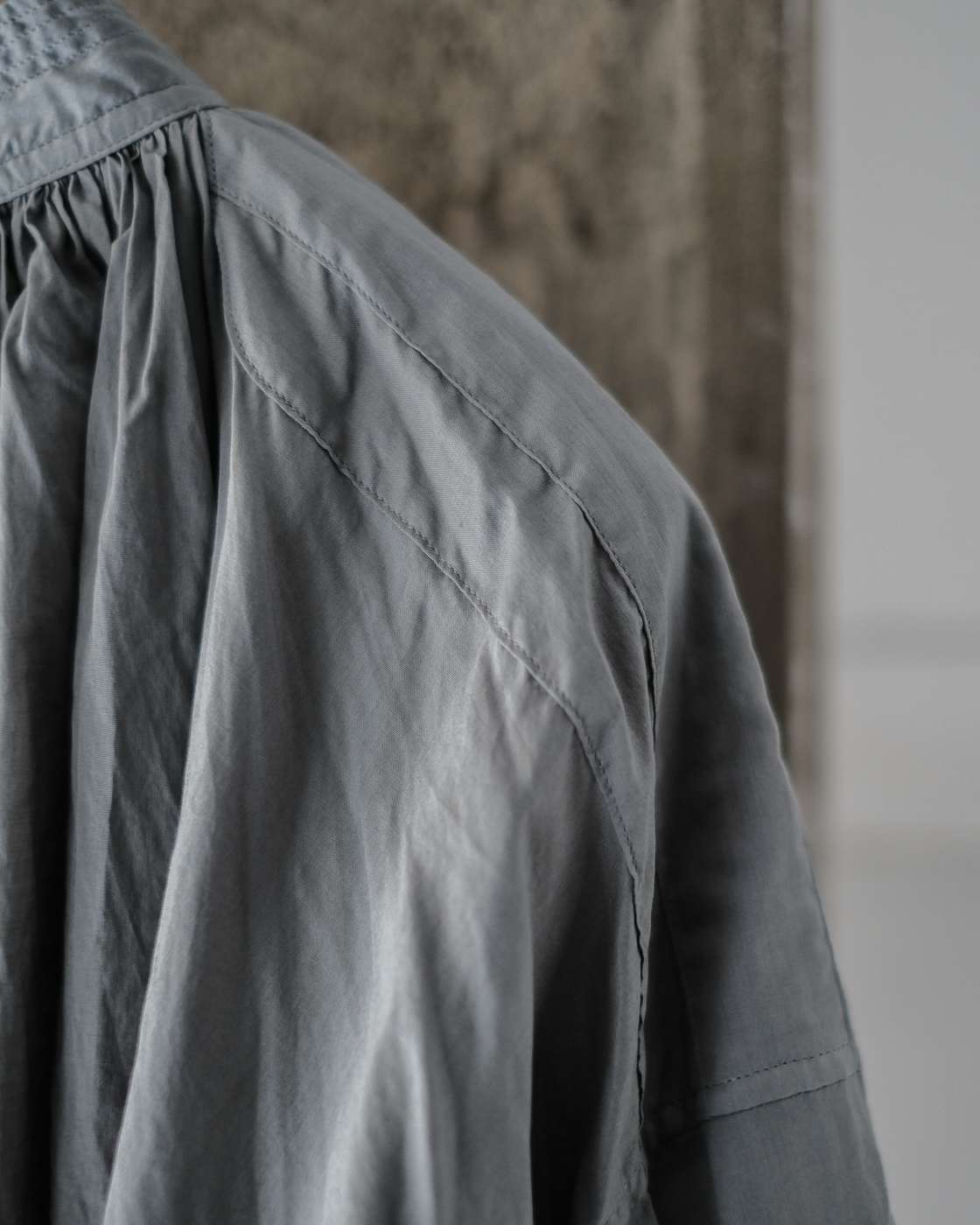 肩の直線的なパターンや脇下のガゼット、首周りに施された細やかで繊細なギャザーなど
