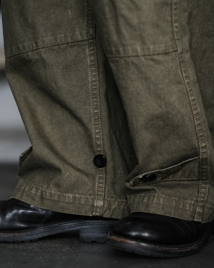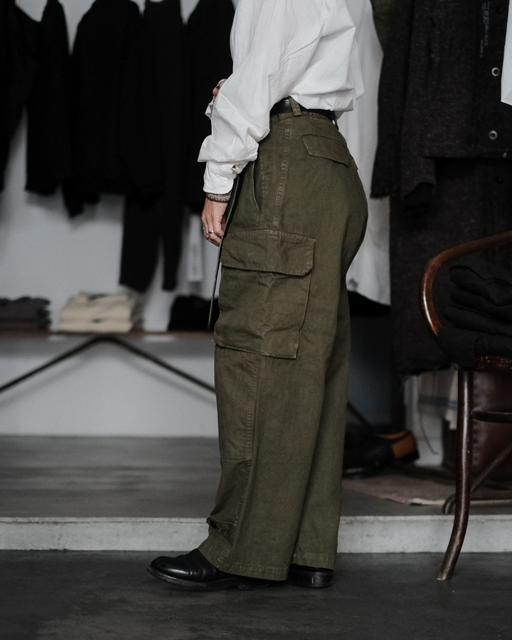 形はM47の後期タイプをベースに。後期型と言えば元々のオリジナルはヘリンボーン生地ですが、敢えてキャンバス生地で製作しているところがOUTILらしい。