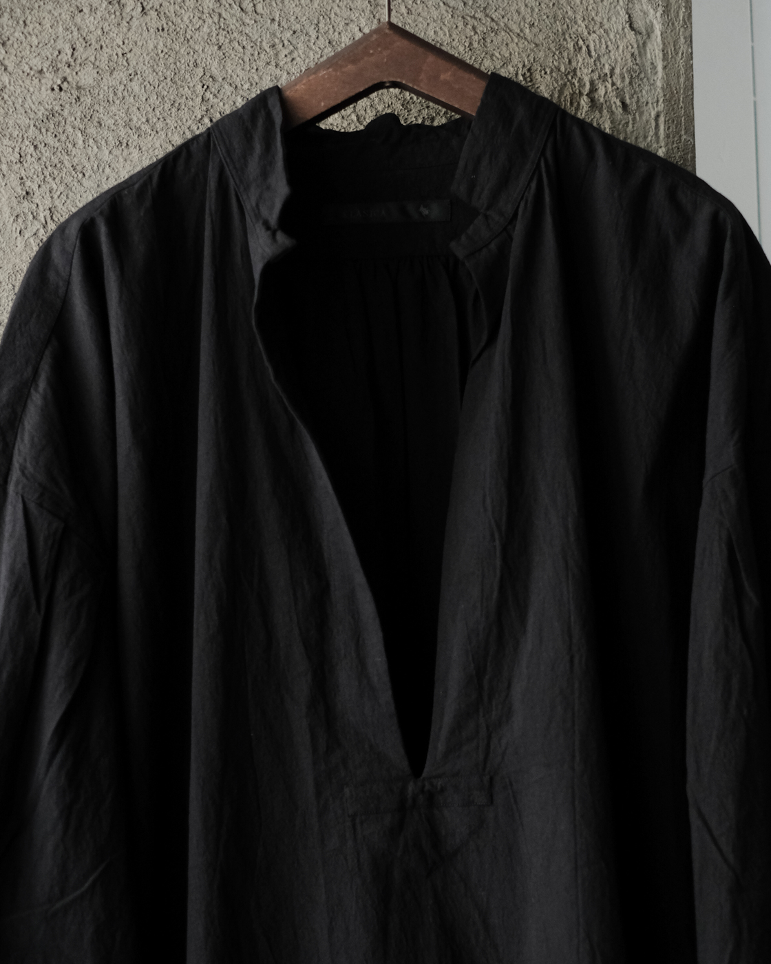 深めに開いたフロント部分が印象的なチュニック丈のプルオーバータイプのブラウス。