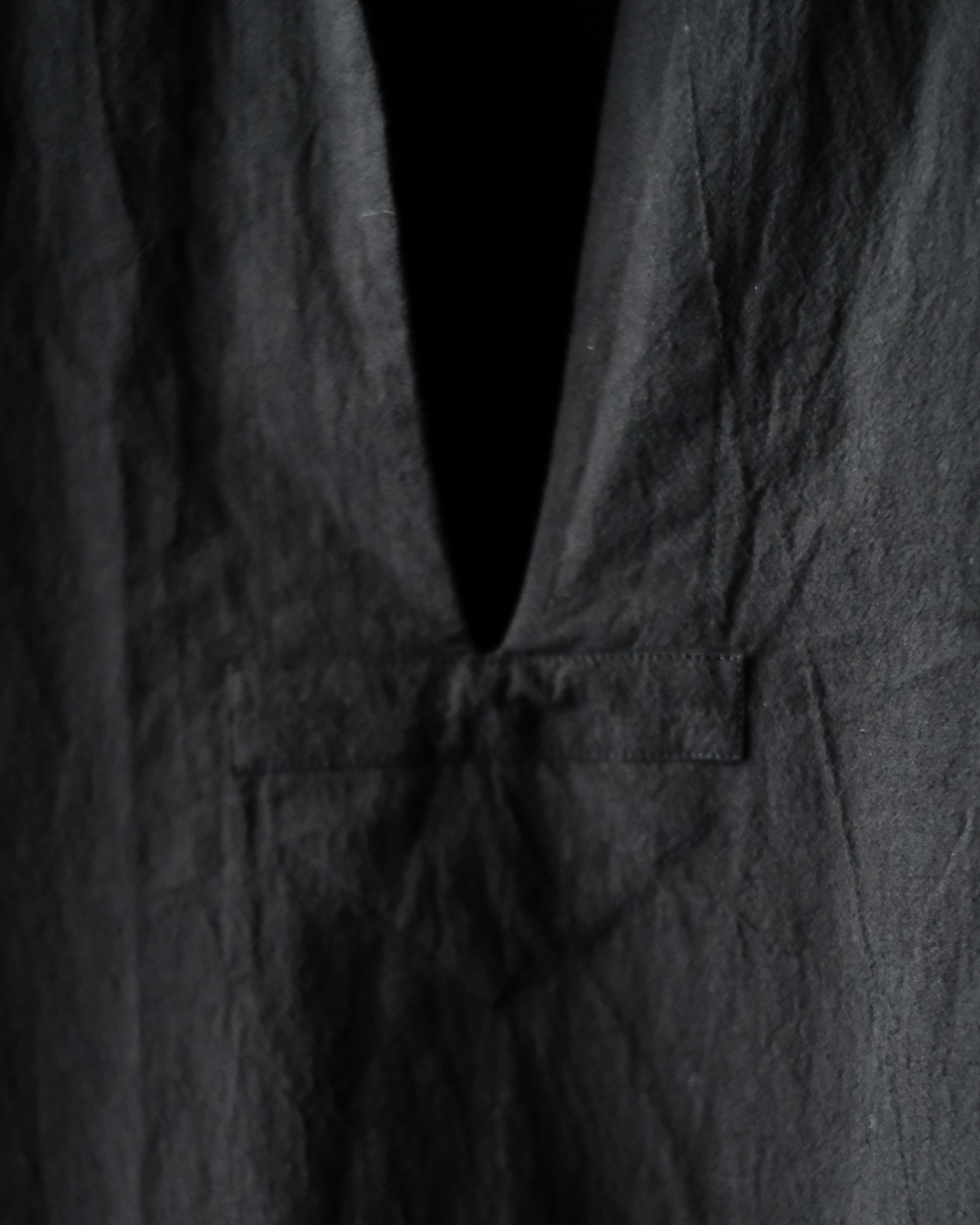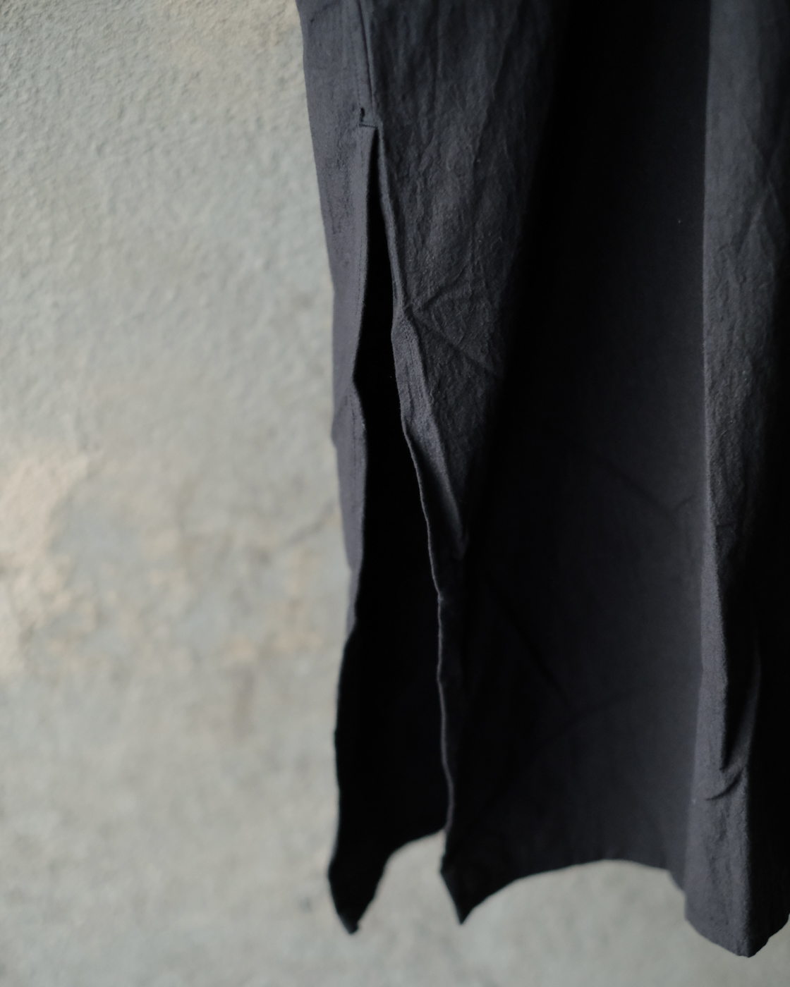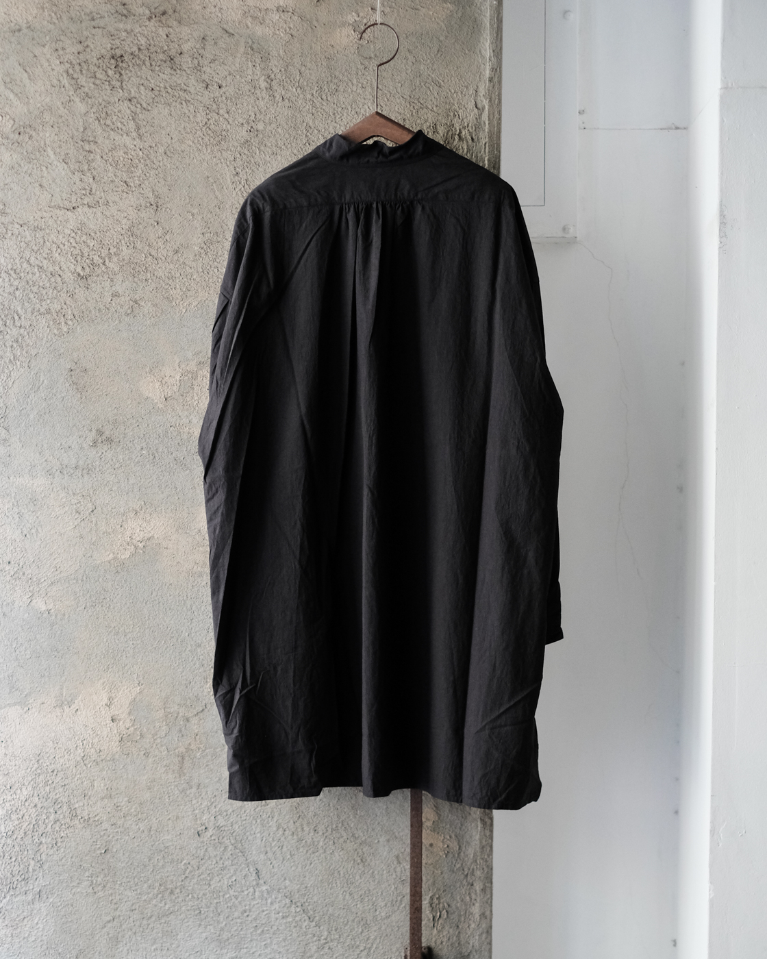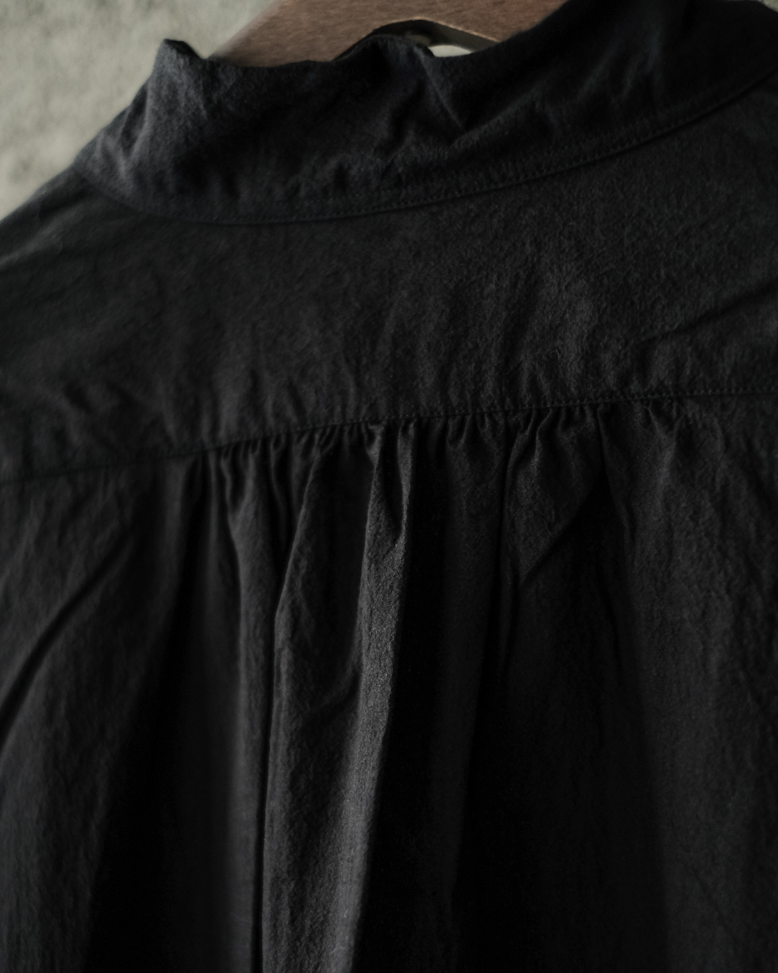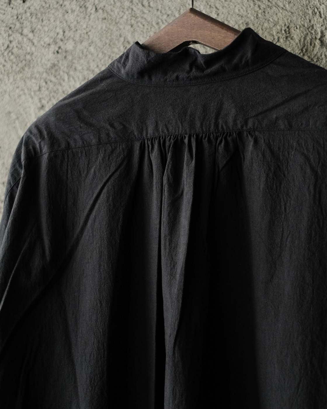 強撚糸40番手の繊細な生地を昔ながらの洗いと乾燥をかけることで強いテクスチャーを生み出しており、ぽこぽことした表情豊かな生地が大変魅力的。