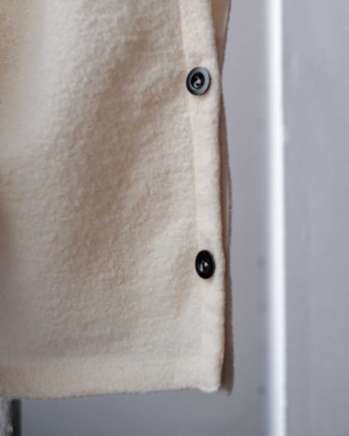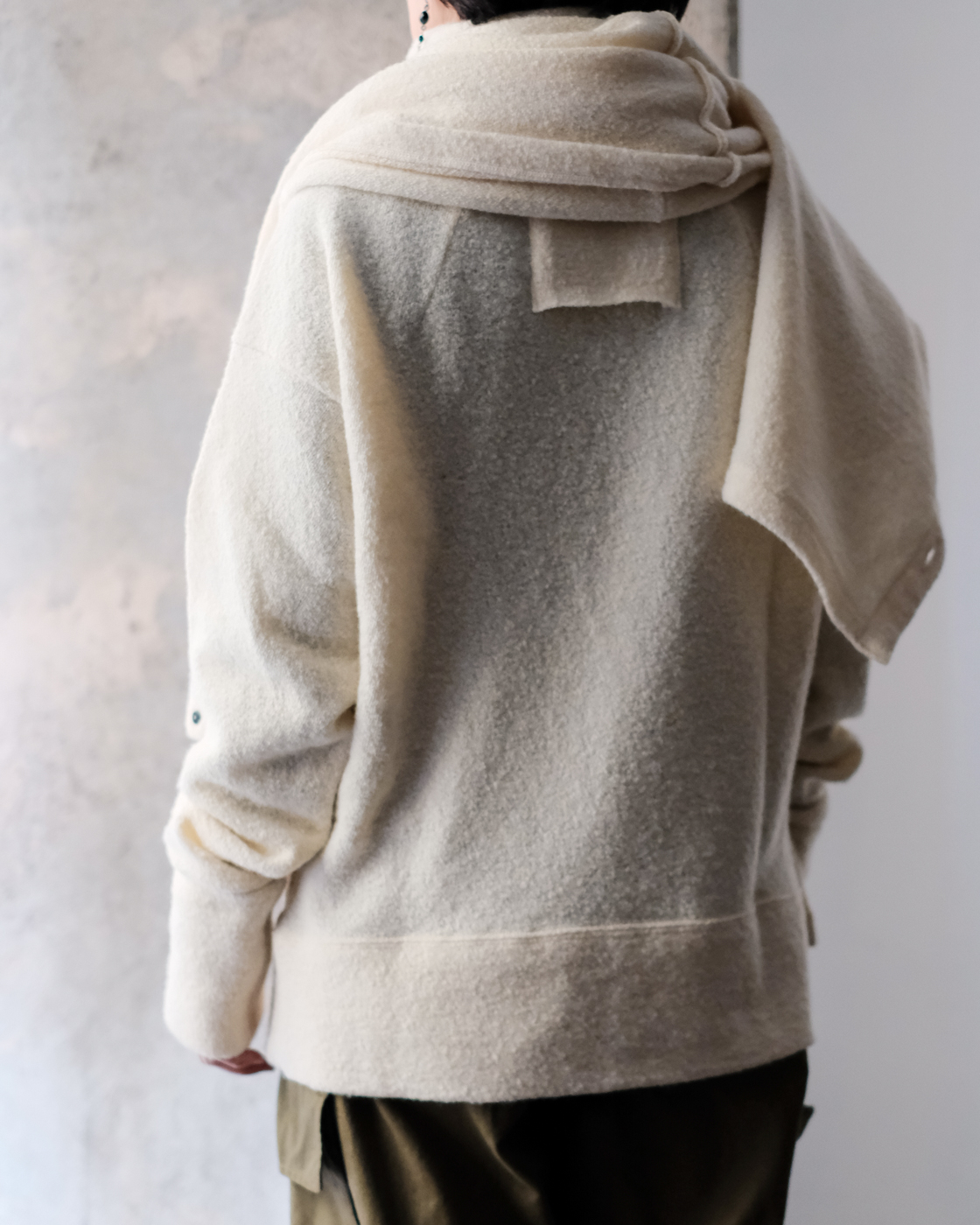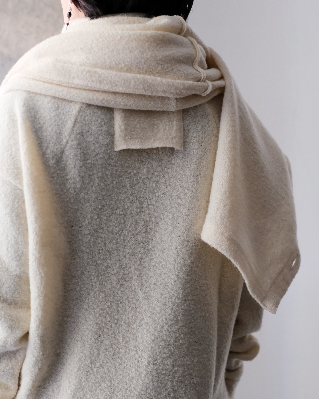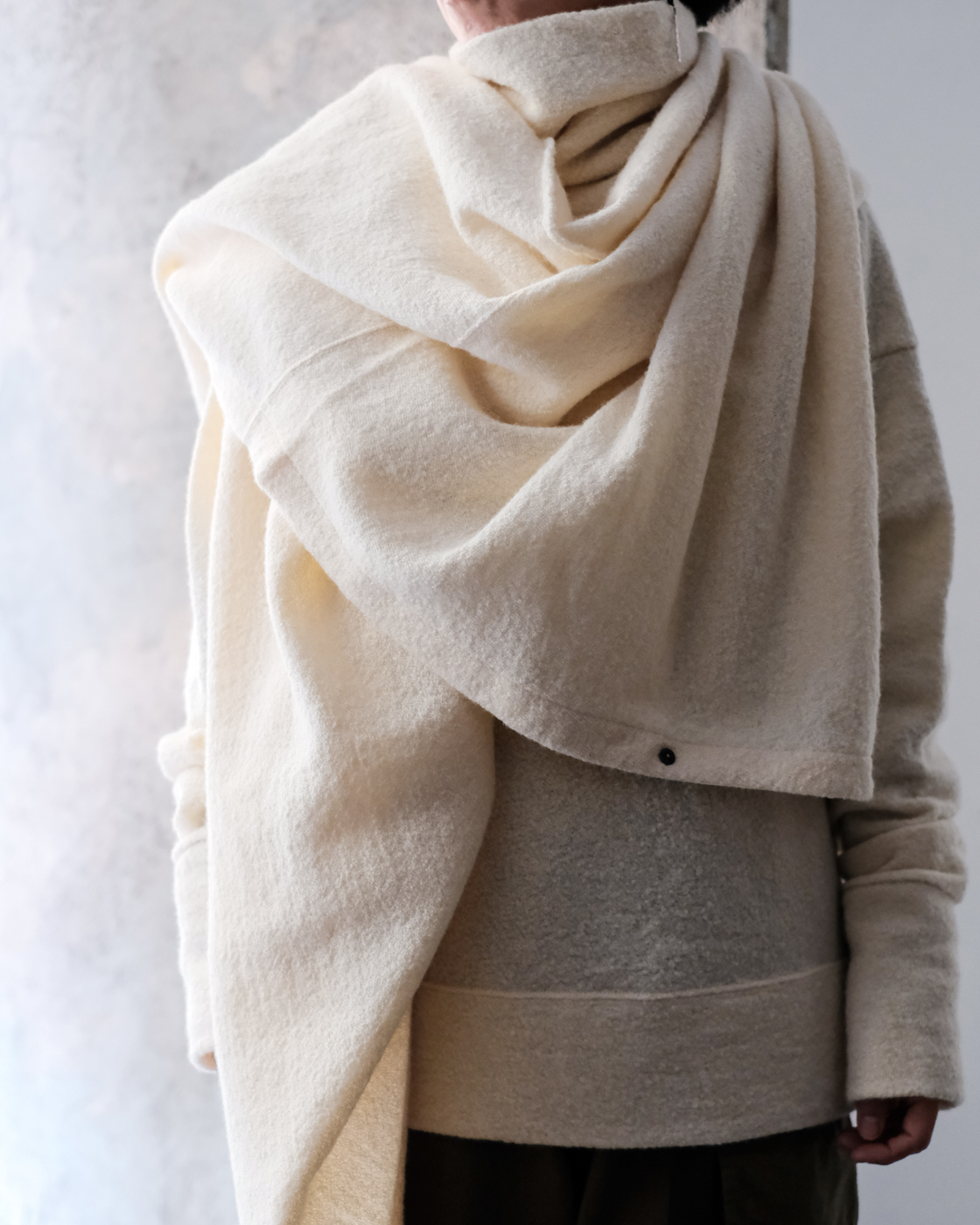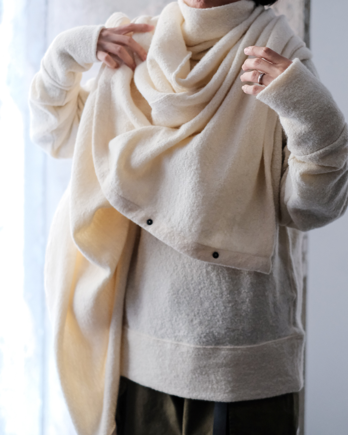 ボタンを外すと大判のストールのような使い方も出来、用途やスタイルによって巻き方を変えて。