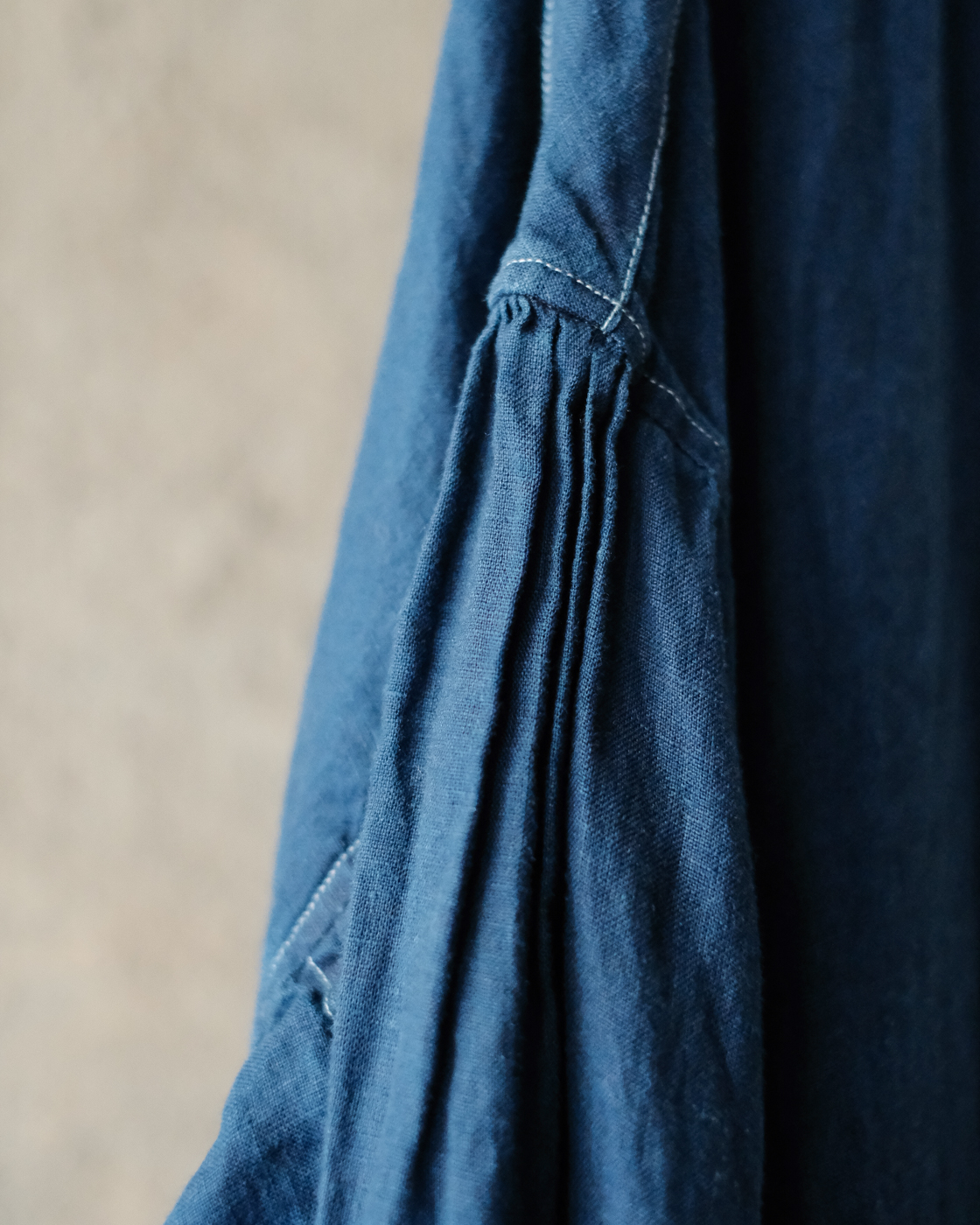 肩のパターンや脇下のガゼットに首周りに施されたギャザーなど、