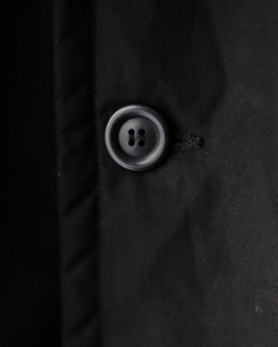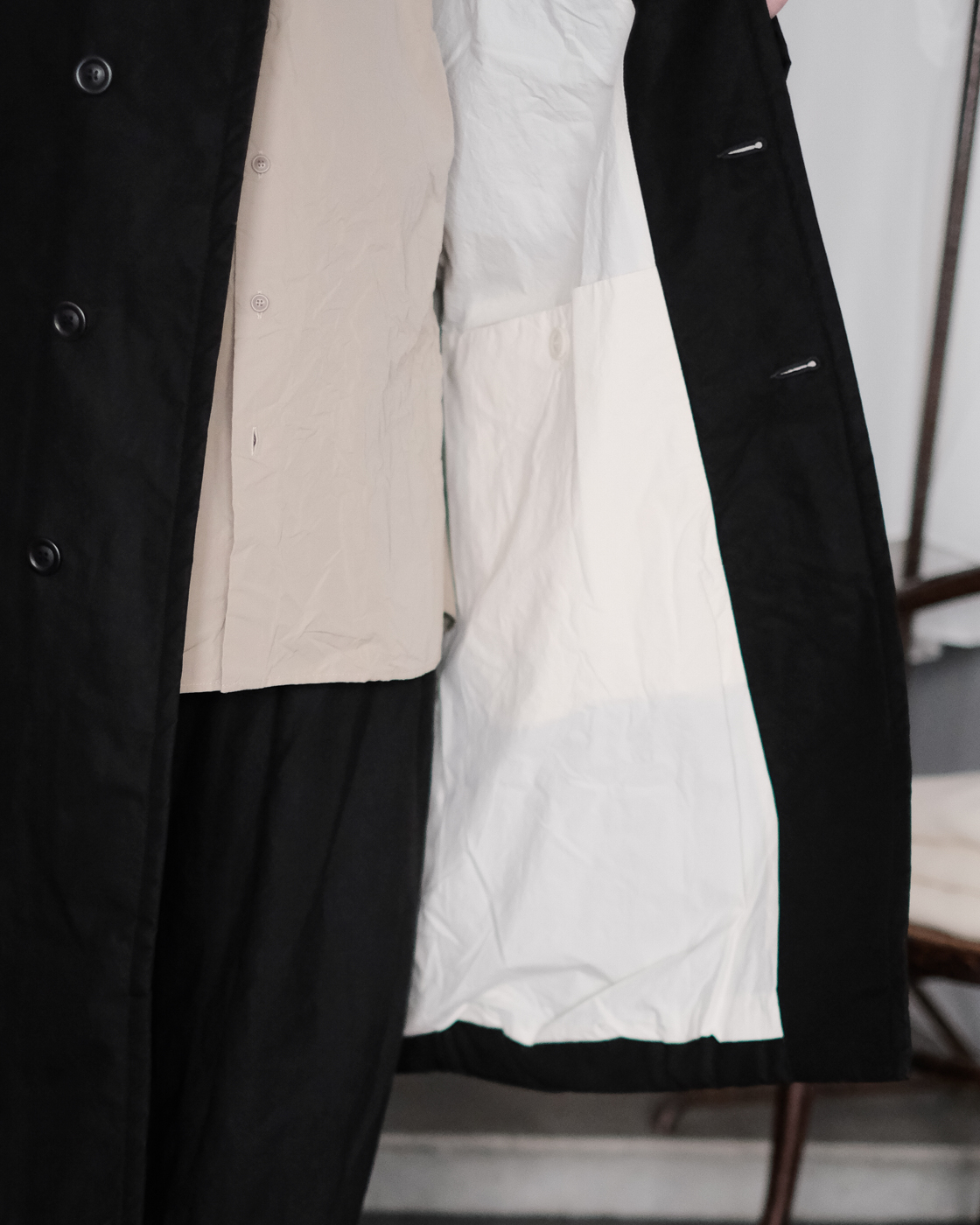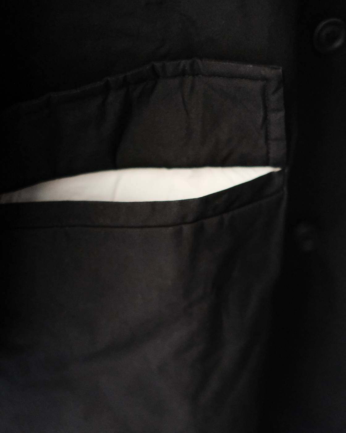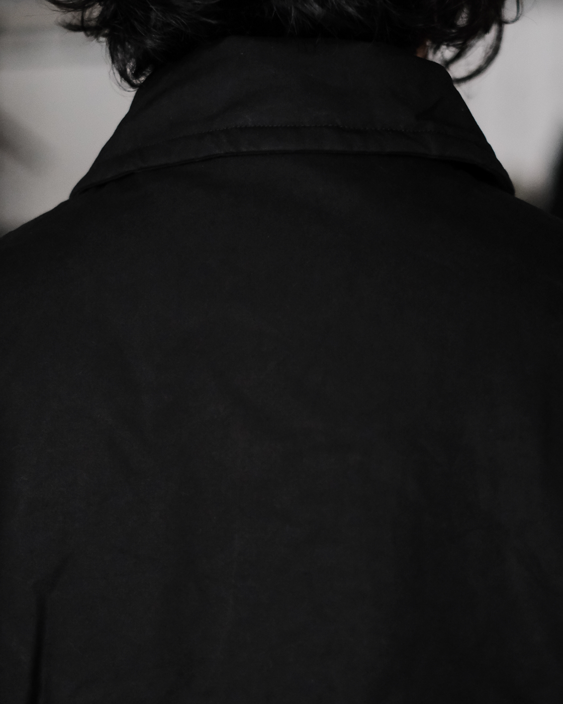 乾燥したワックス加工を施した、マットな表面を持つ緻密な綿のキャンバス生地を贅沢にたっぷりと使用したコート。