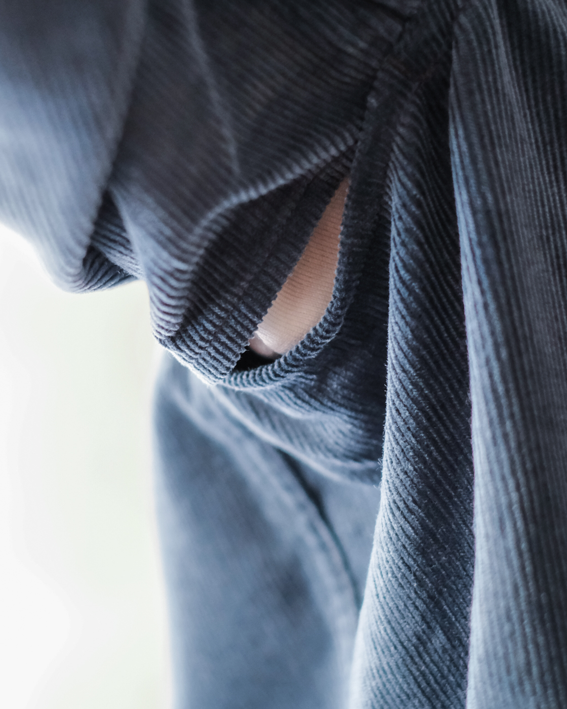 通常のコーデュロイ生地に比べて打ち込みが多く高密度に織り上げられており、デニムのような風合いのある経年変化が楽しみな素材。