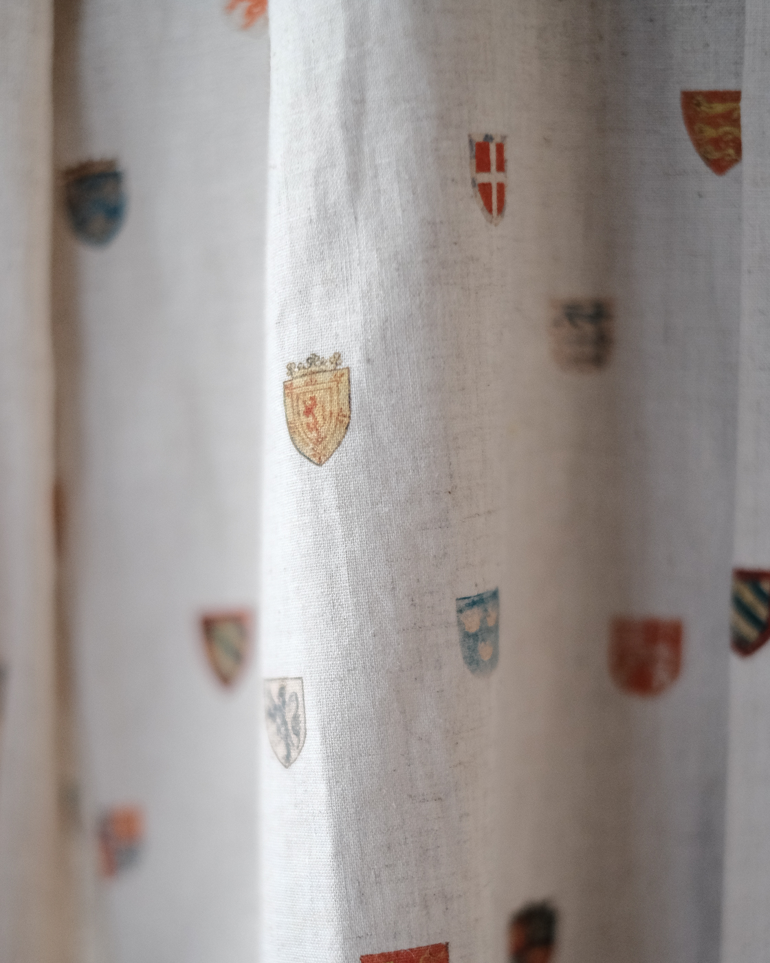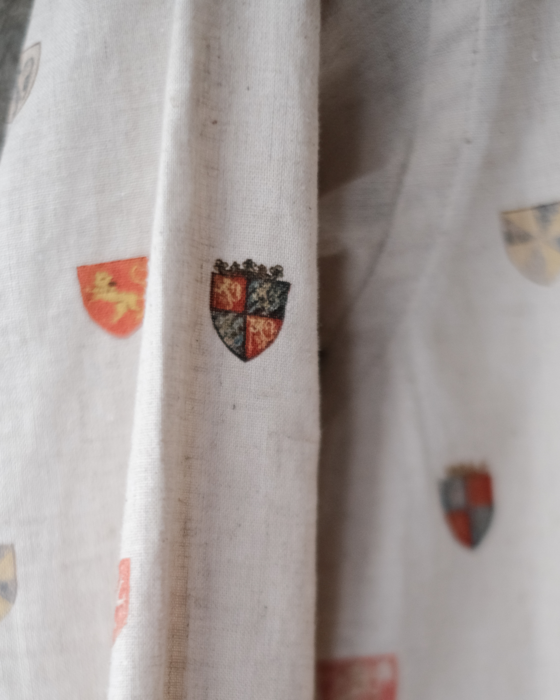 色もデザインも異なる紋章がプリントされていて掠れたような表情は、まるでアンティークの生地を彷彿させます。