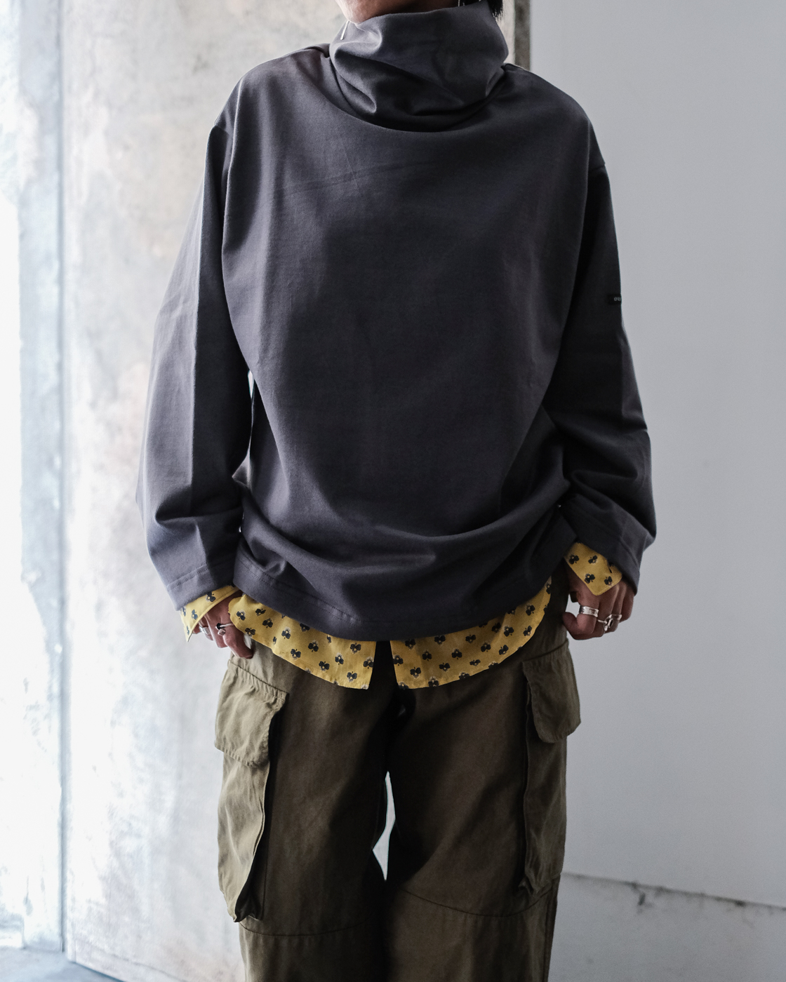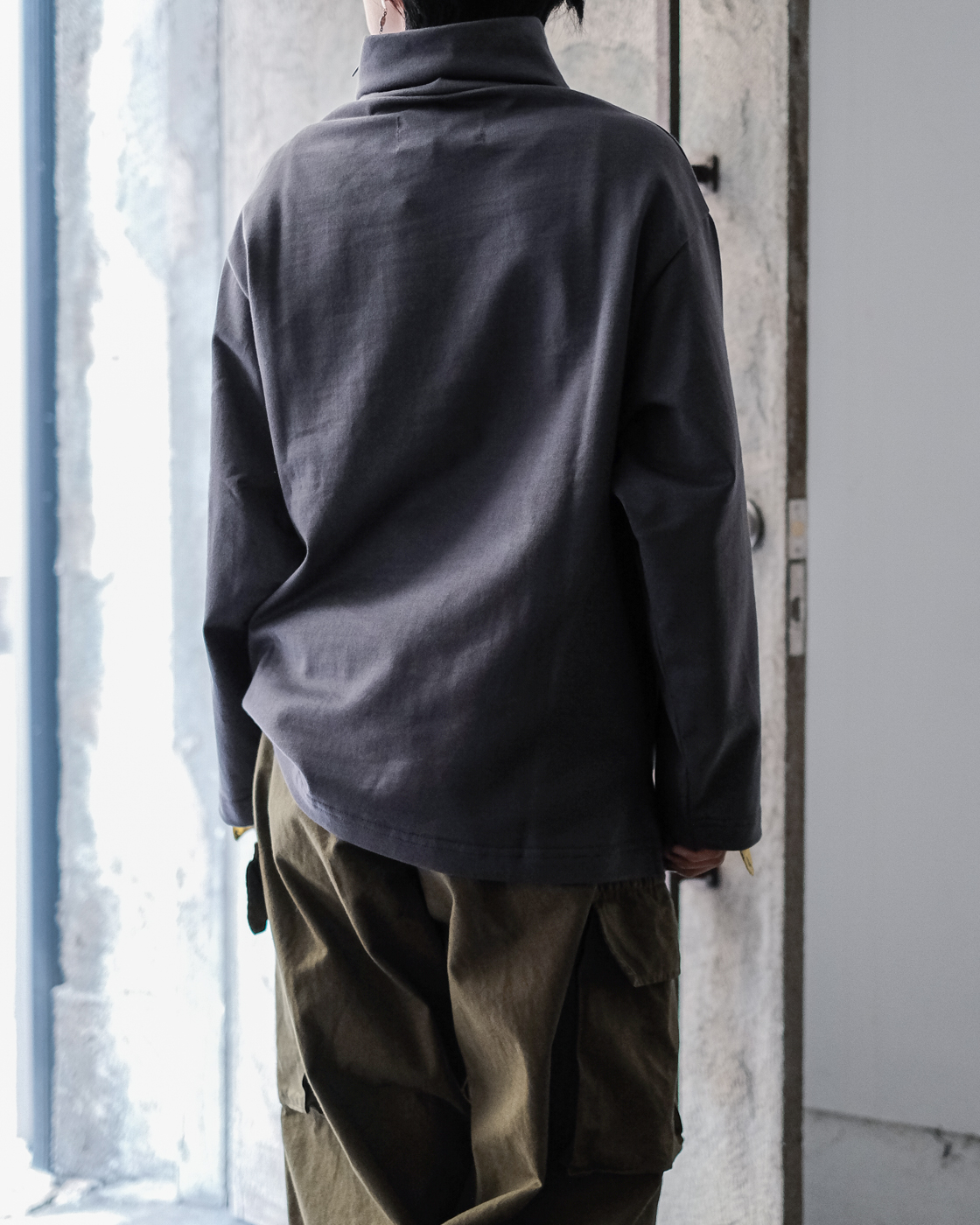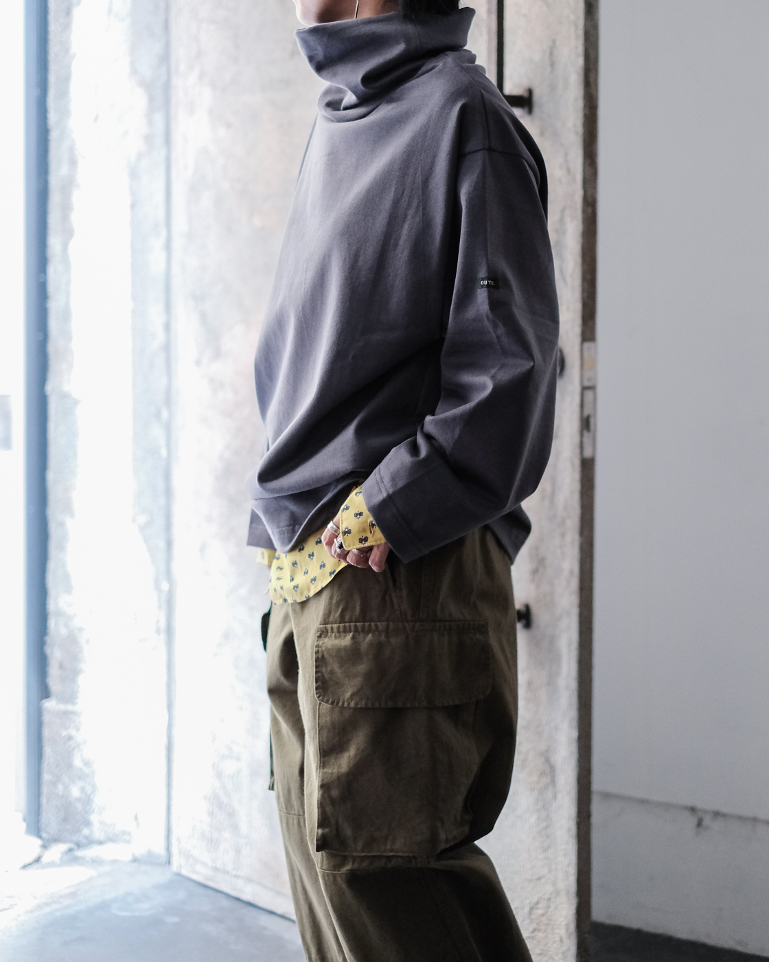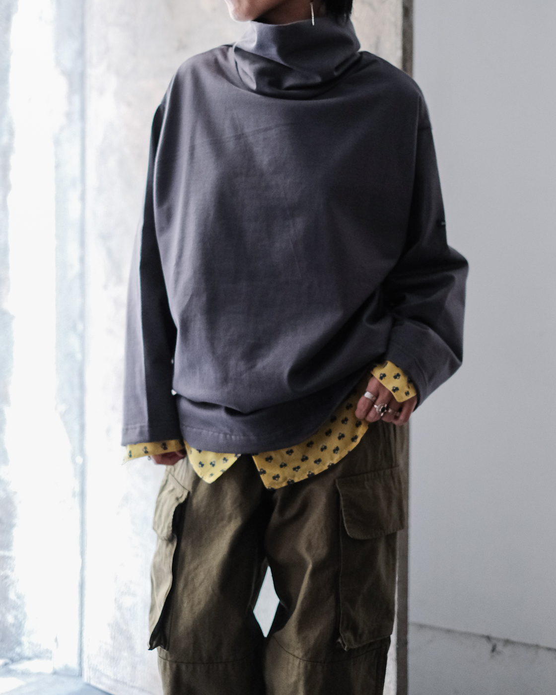 特徴的なボリュームあるタートル部分がこのカットソーをより印象付け、全体的にリラックス感があり、コンパクトなサイズバランスがとても気に入っています。