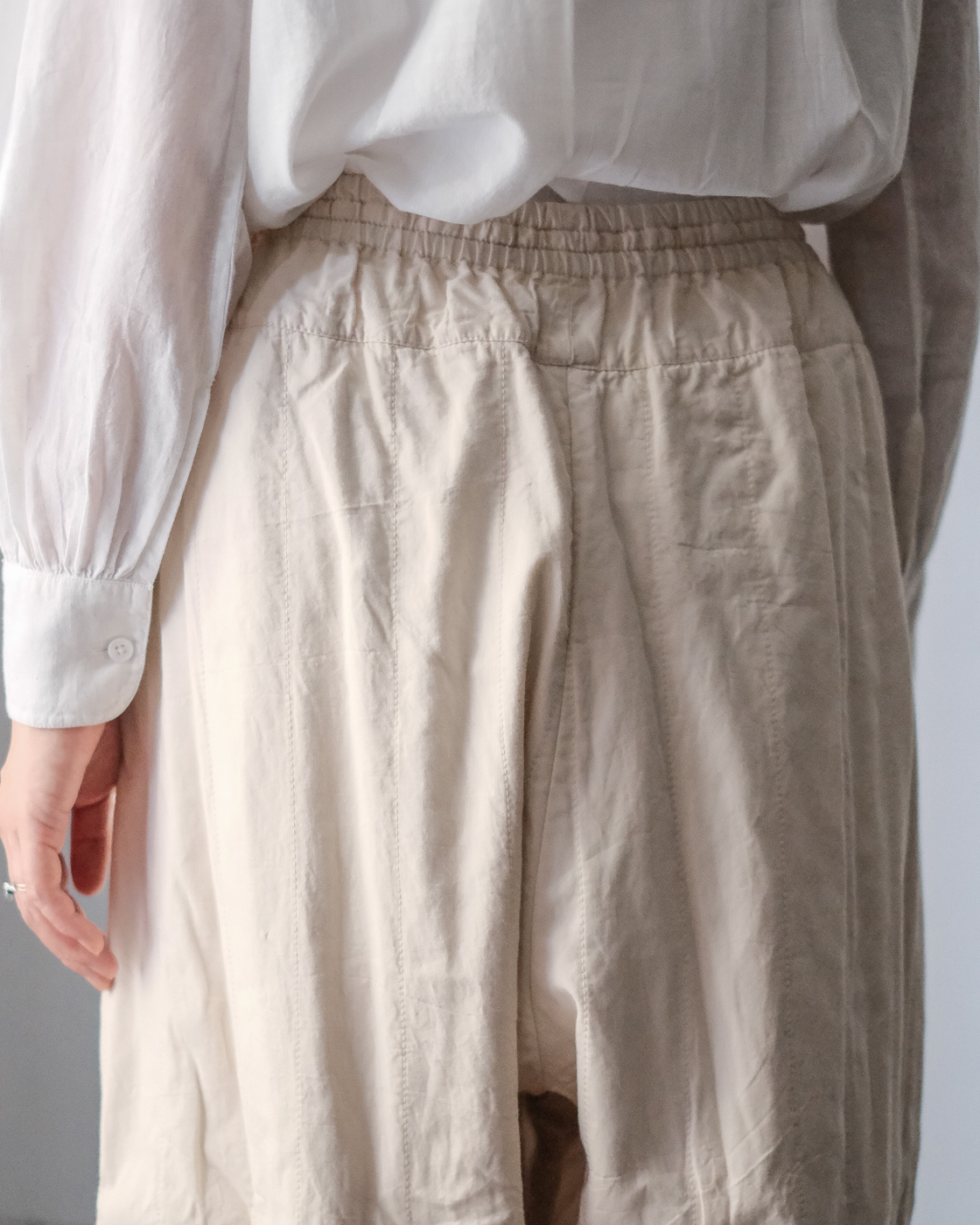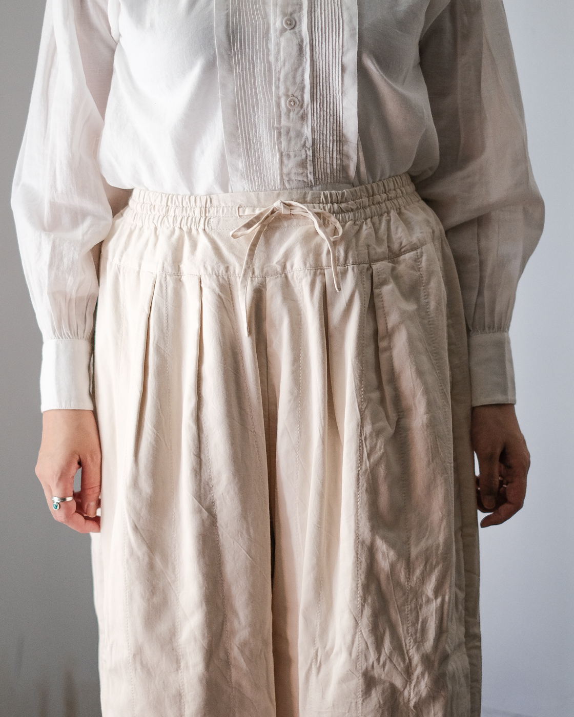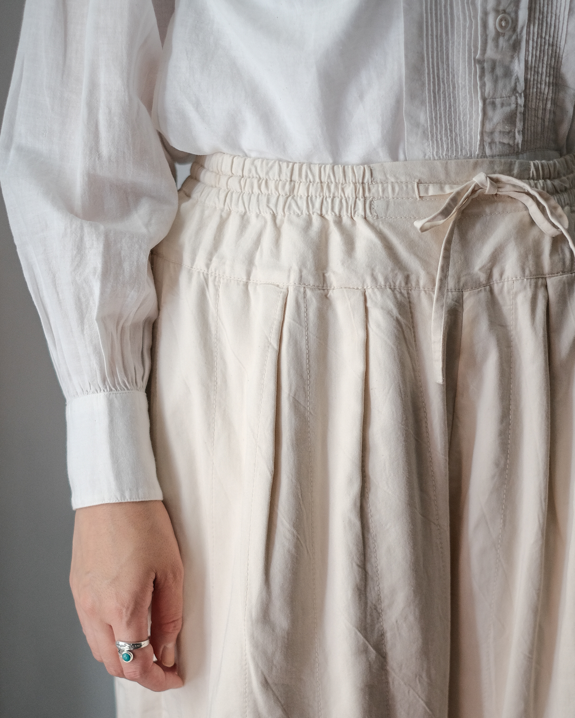 デンマーク出身のテキスタイルデザイナー、ベス・ニールセンは、手織りのテキスタイルへの情熱を追求するため、2003年にKhadi and Coを設立しました。彼女は30年以上にわたり、インド中を旅し、最も熟練した職人を探し求めてきました。 インドのテキスタイル工芸の豊かな伝統を探求する長い旅を通して、彼女はカディの深い文化的意味を理解するようになりました。カディは質素な綿織物であり、インド独立運動の象徴でもあります。 手紡ぎ、手織りの布であるカディは、ベス・ニールセンにとって長年のインスピレーションであり、まさに彼女のライフワークです。ガンジーの自立のメッセージを受け継ぐ彼女は、職人技と手織りの生地が不可欠であると確信しています。 手紡ぎの糸は紛れもなくオーガニックな品質を備えています。衣服を軽くし、通気性に優れ、独特の柔らかさで肌を優しく包み込みます。