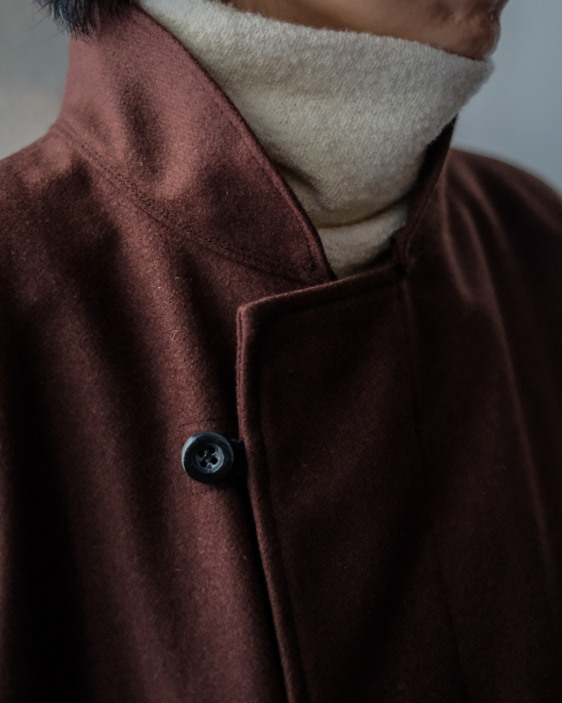 特徴的な小さめのラウンド仕様の襟元に、トグルではなくOUTILオリジナルの3つボタンがすっきりと。