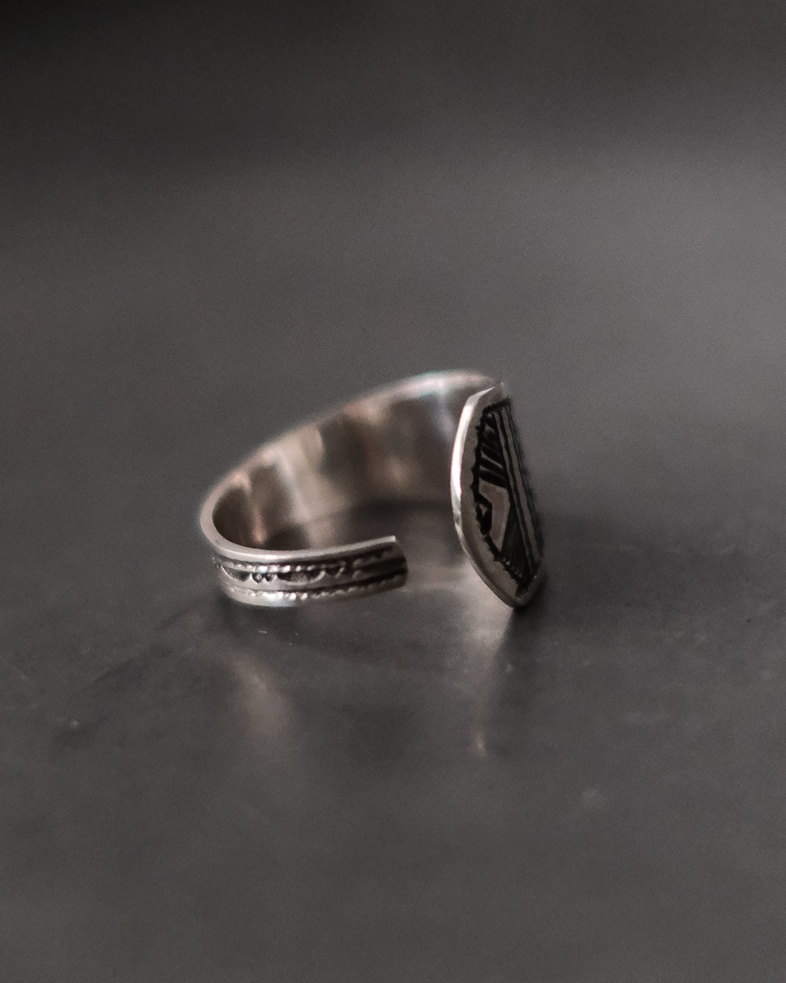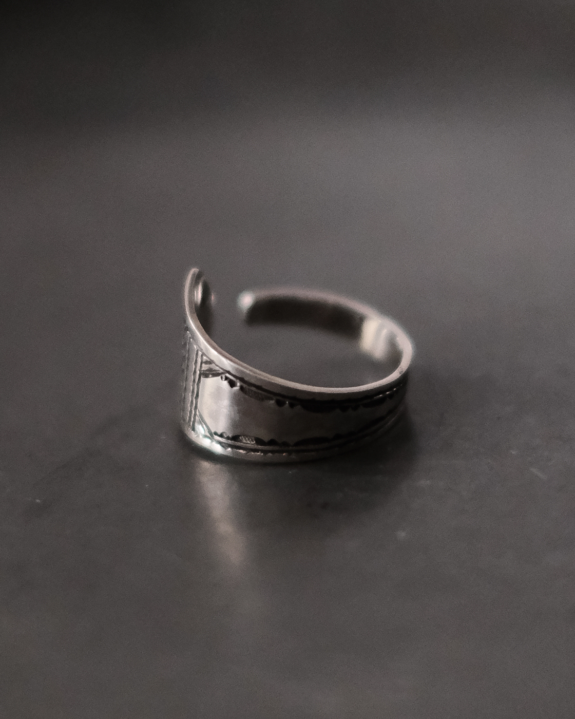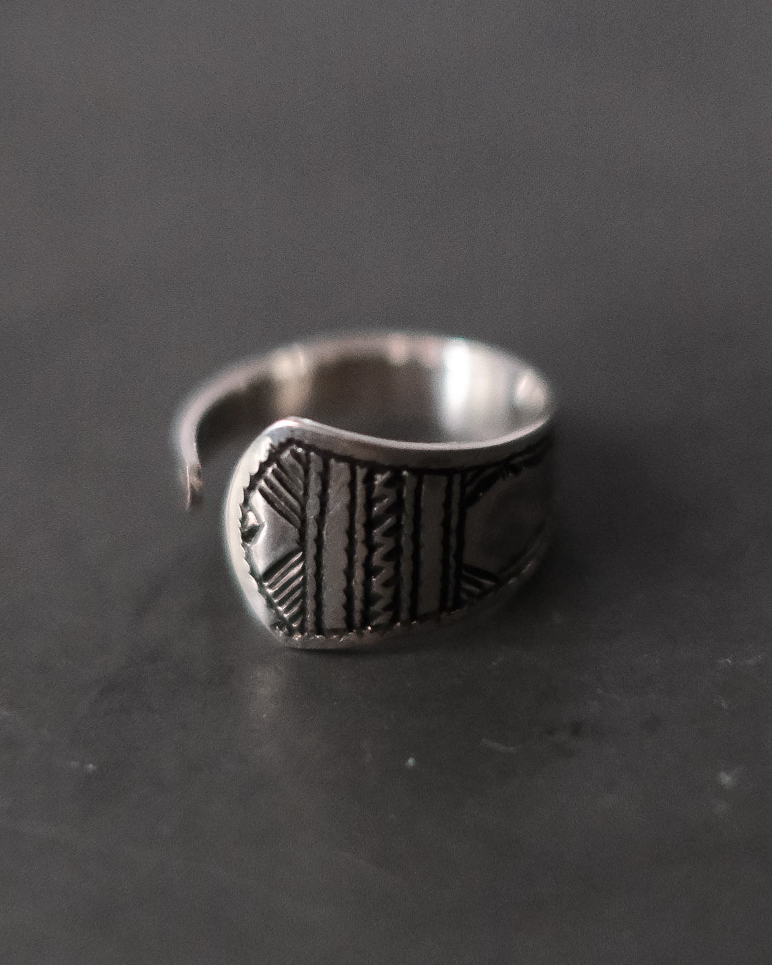 一刀一刀手彫りで彫られた柄が相まって、存在感のあるリング。