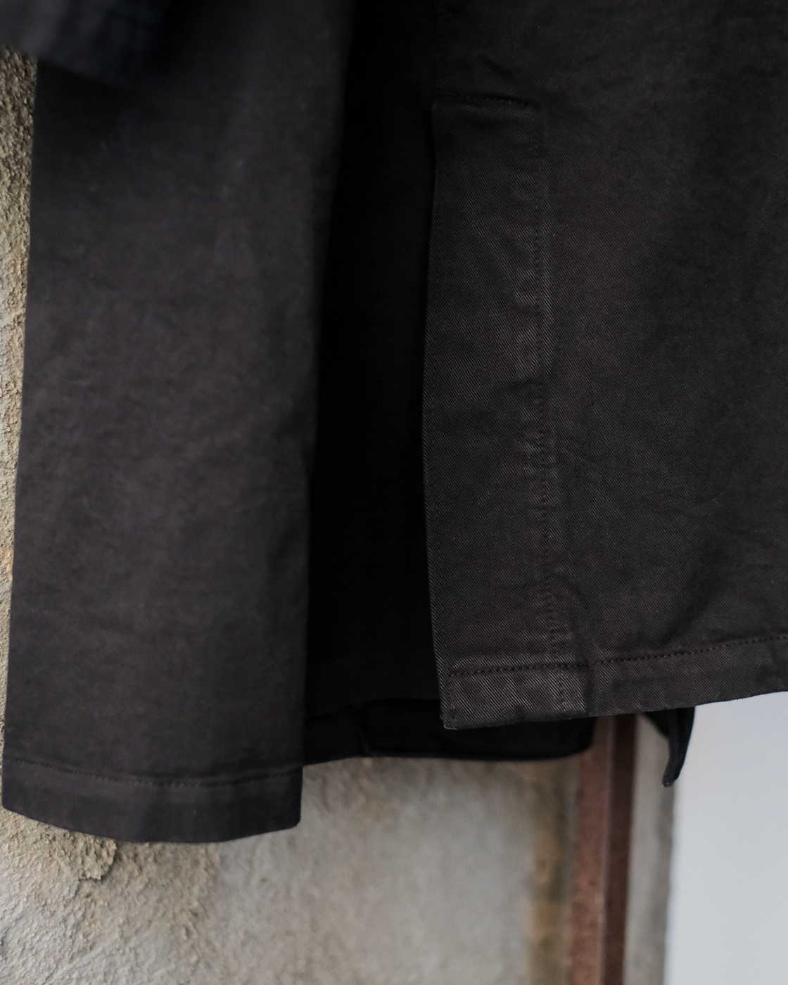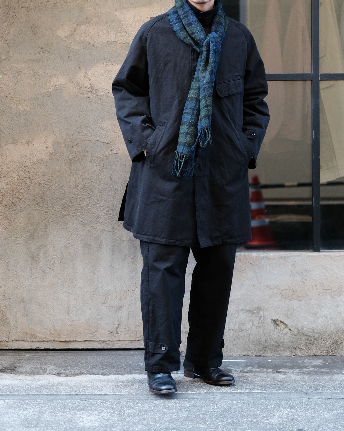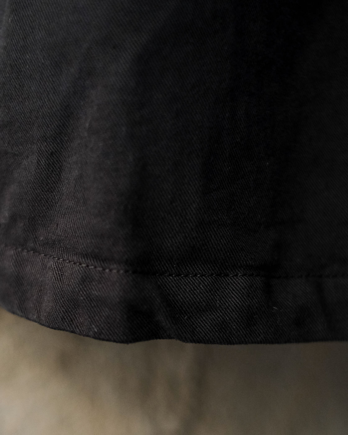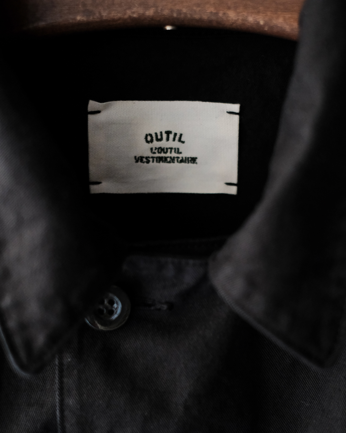 黒を着たい。そしてミリタリーワークを上品に。というのは常にうちのテーマになっていますが、一般的なベタっとした平面的な黒では無く、立体的で表情のある黒が良いです。OUTILの生地は無骨な中にエレガントさもあり、奥行きがあるとても良い表情をしています。