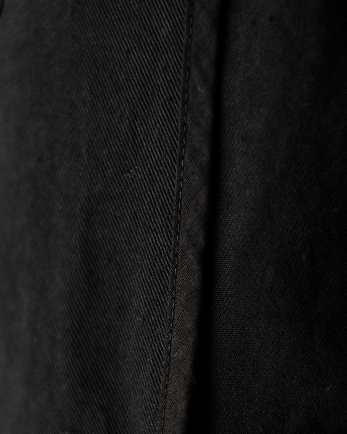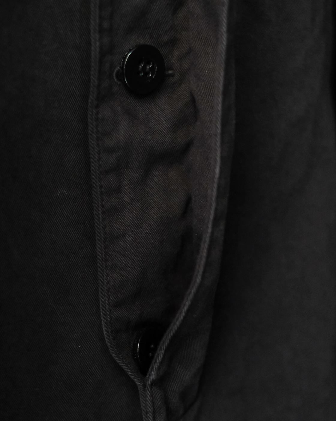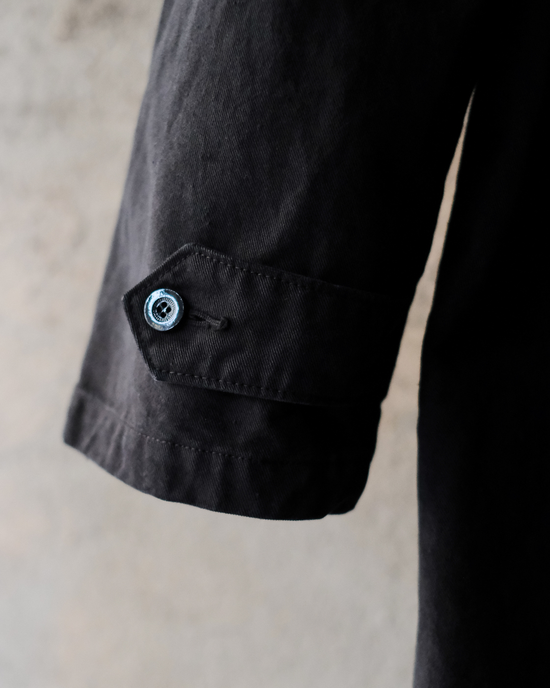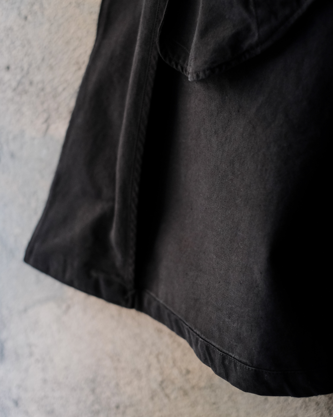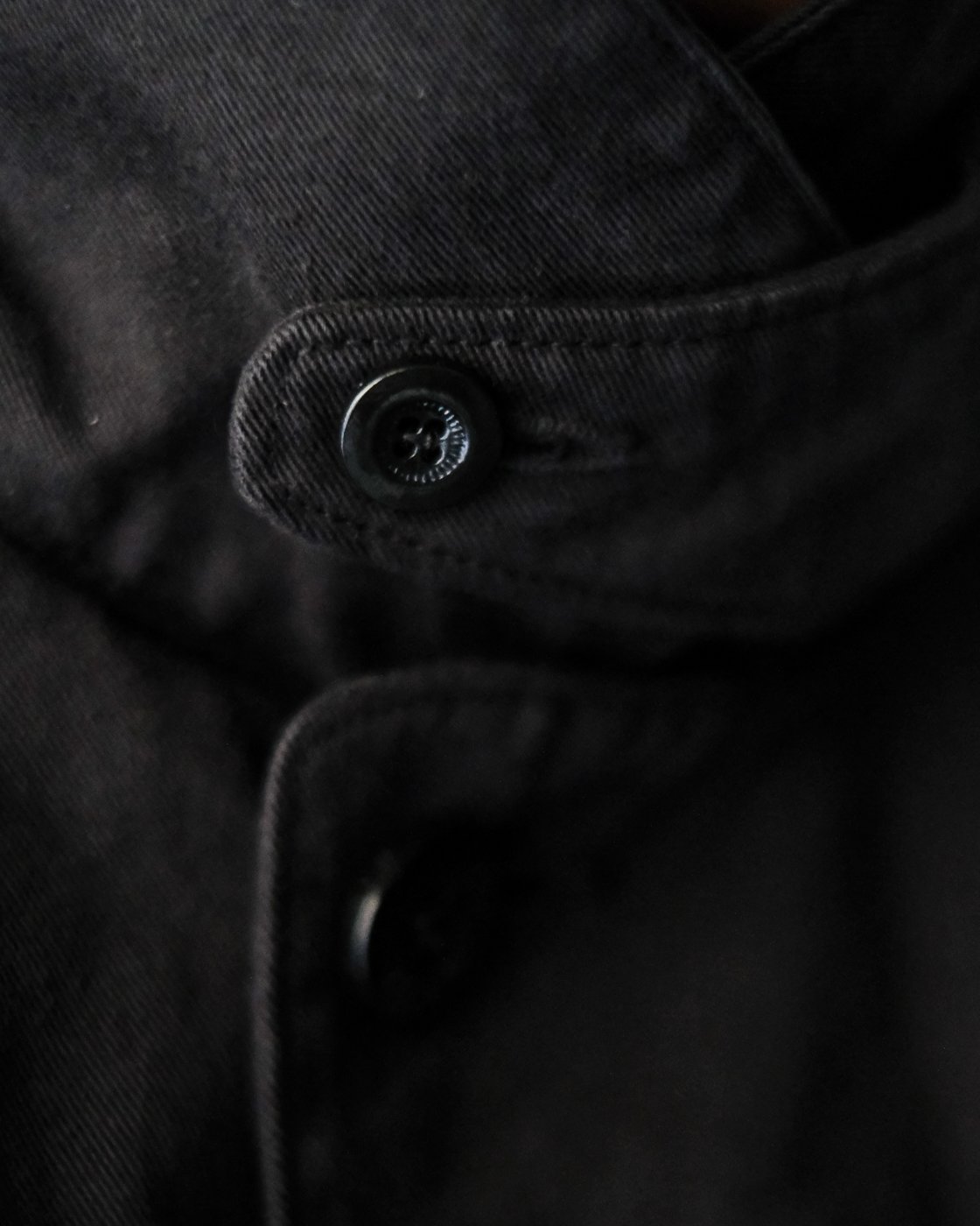 黒を着たい。そしてミリタリーワークを上品に。というのは常にうちのテーマになっていますが、一般的なベタっとした平面的な黒では無く、立体的で表情のある黒が良いです。OUTILの生地は無骨な中にエレガントさもあり、奥行きがあるとても良い表情をしています。