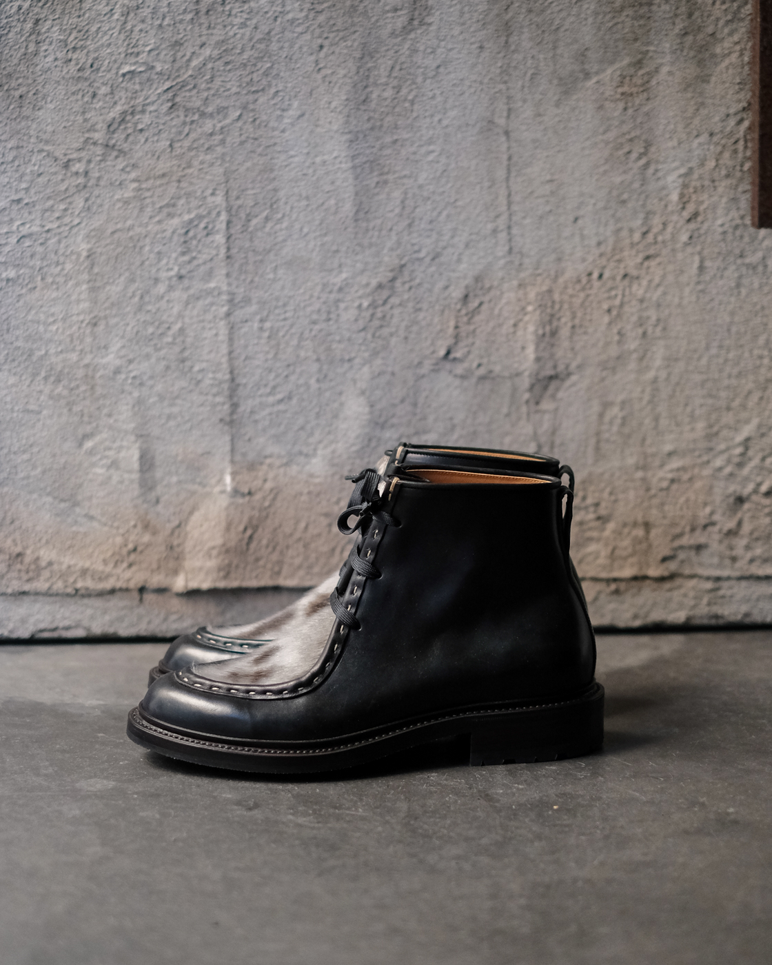 通常チロリアンブーツはアンクル丈のカントリーな印象のものが一般的ですが、ハイカットでロガーブーツのような細い筒周りでストイックな印象に仕上げられたformeならではの一足。
