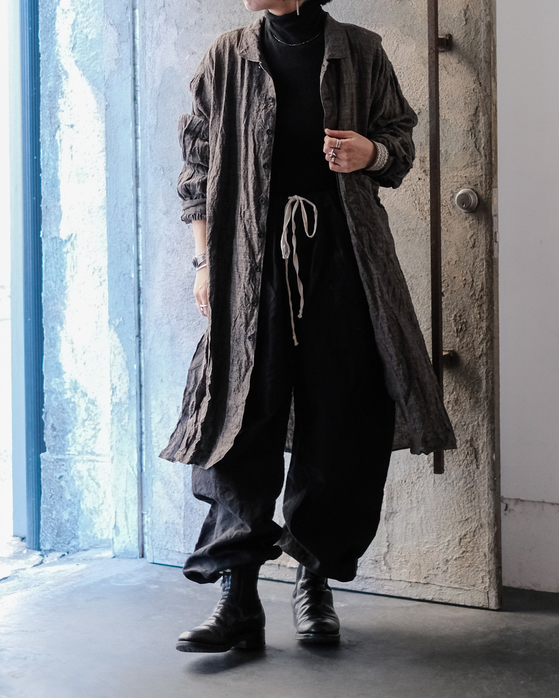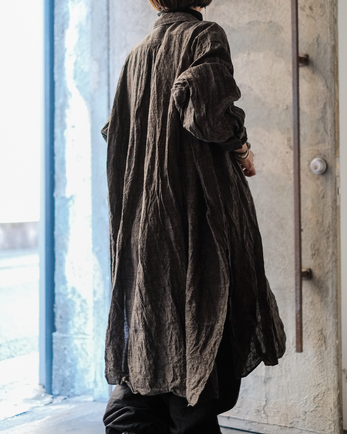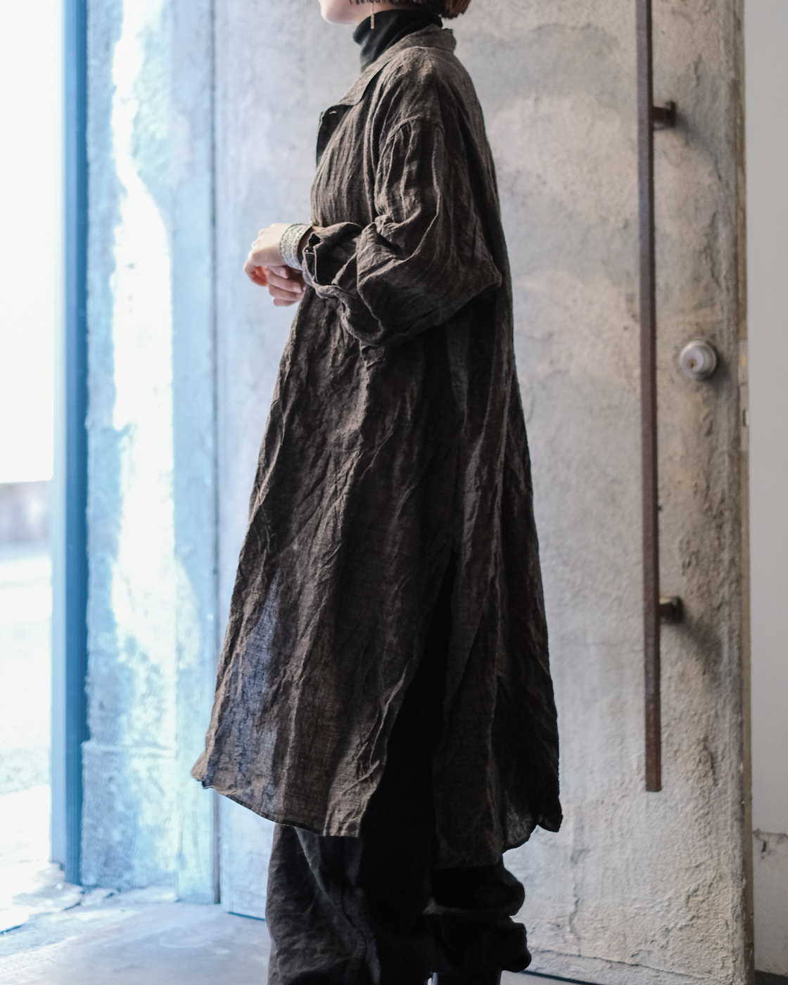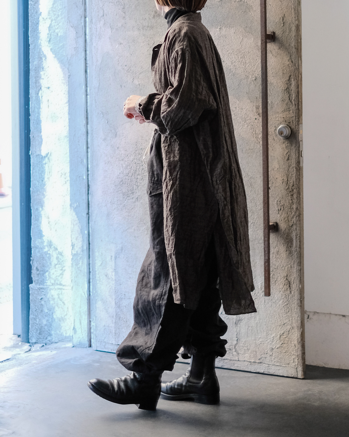 ロングシャツですが、まるでコートのような存在感。