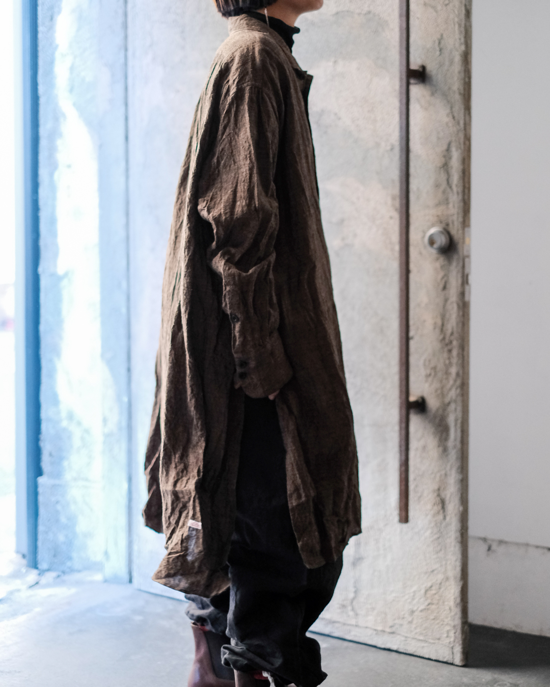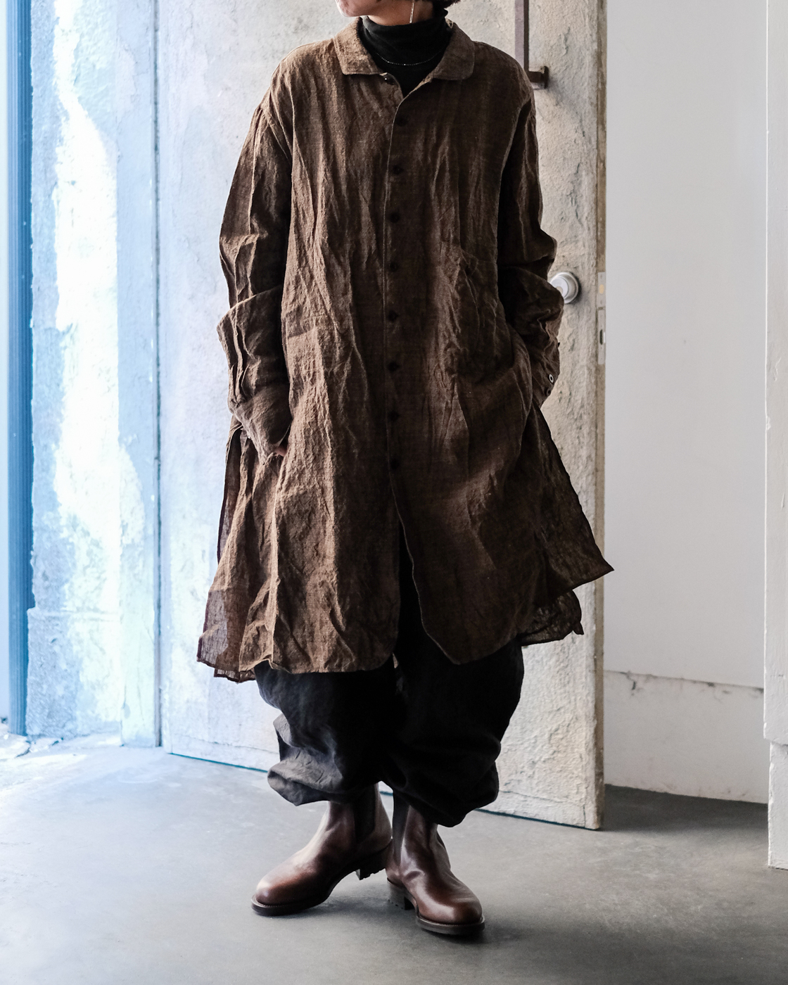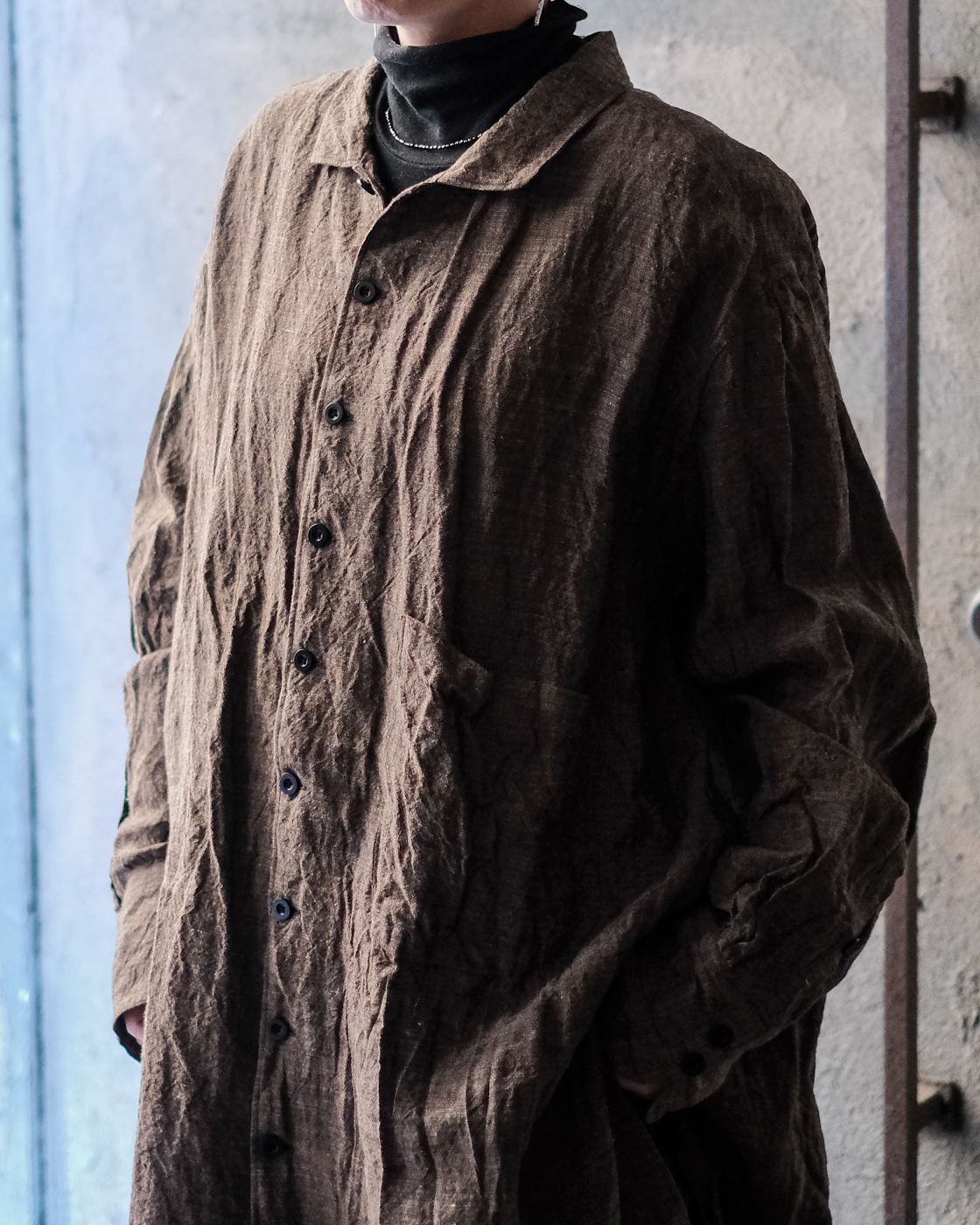 ロングシャツですが、まるでコートのような存在感。