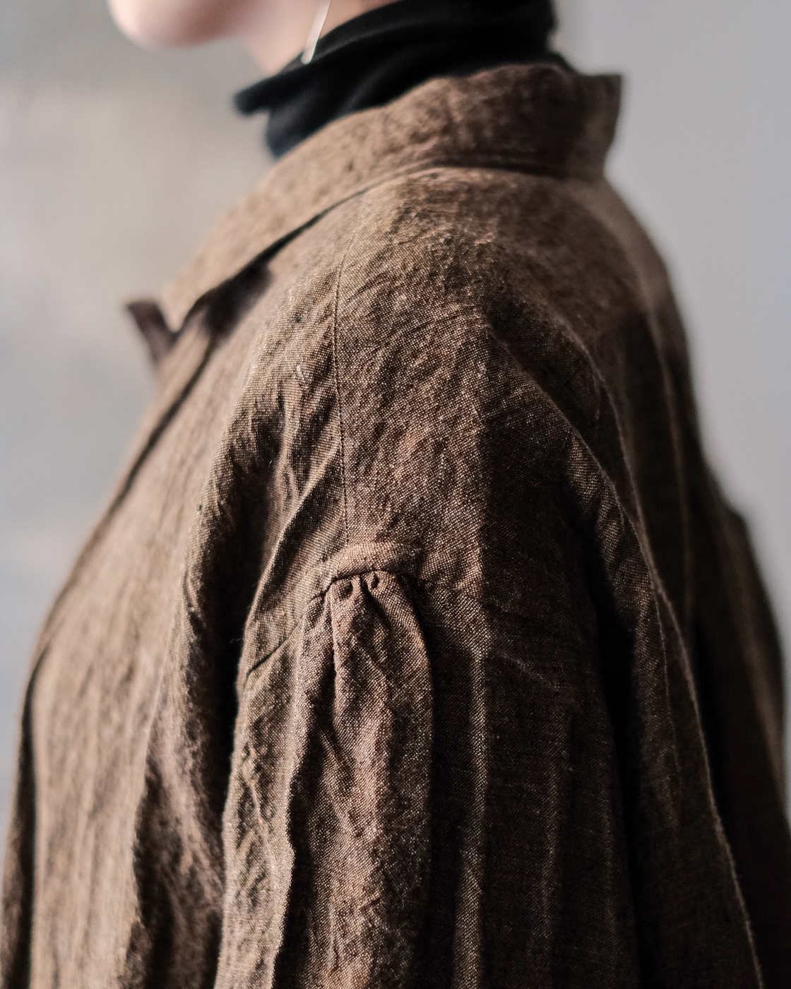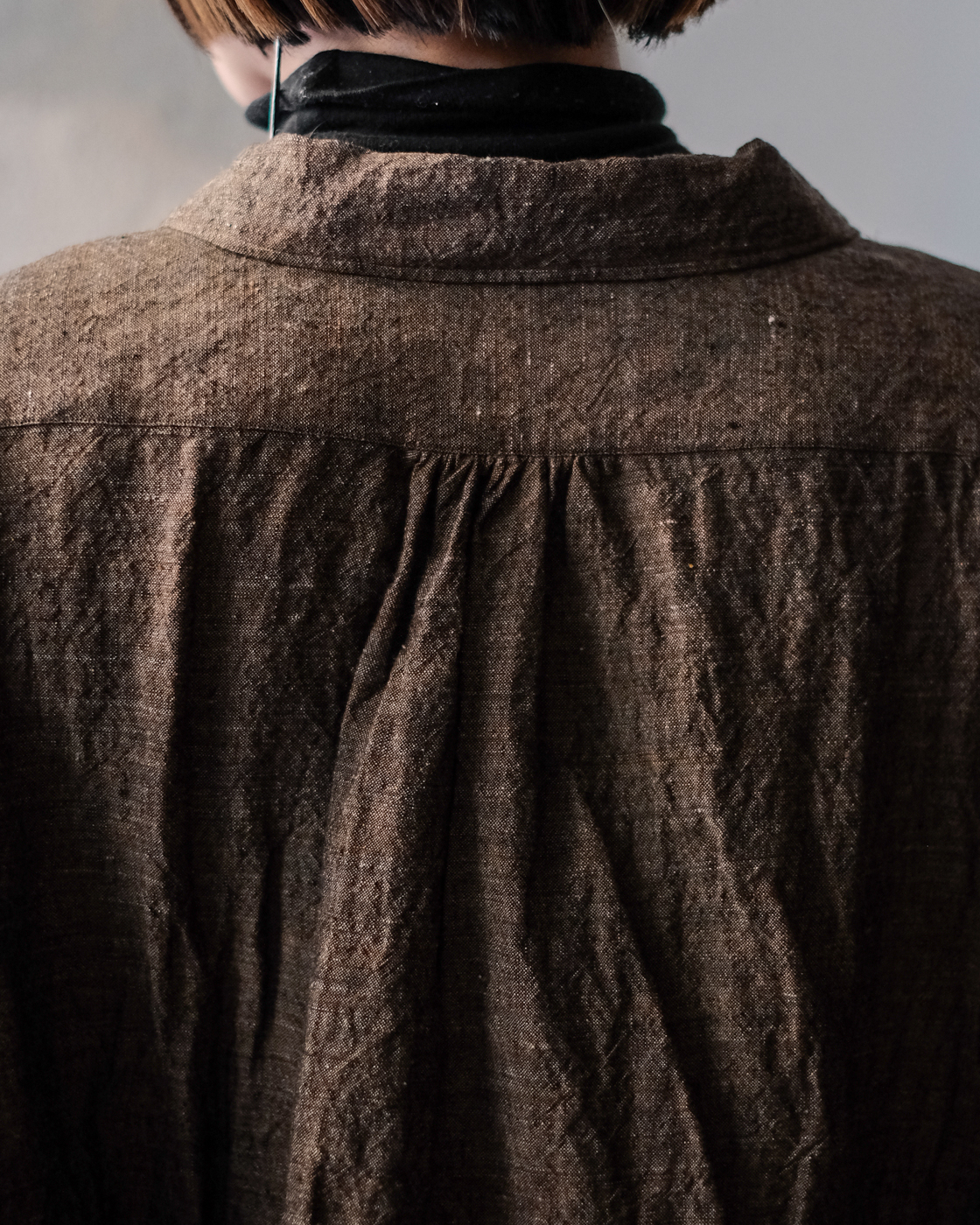 太番手糸をあまり詰めずにゆっくりと時間をかけて織り上げ、空気をはらんだ軽やかに仕上げた一着。
