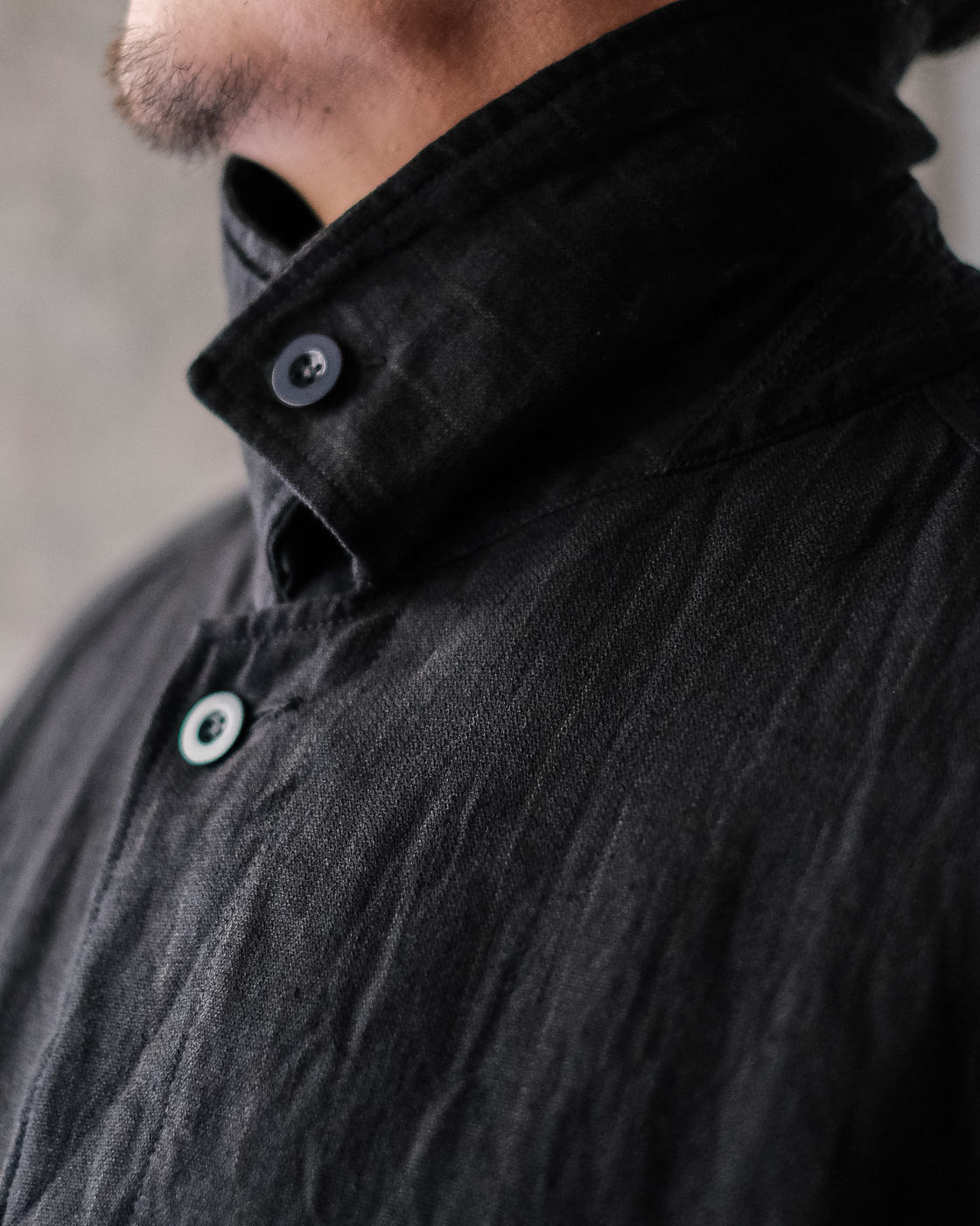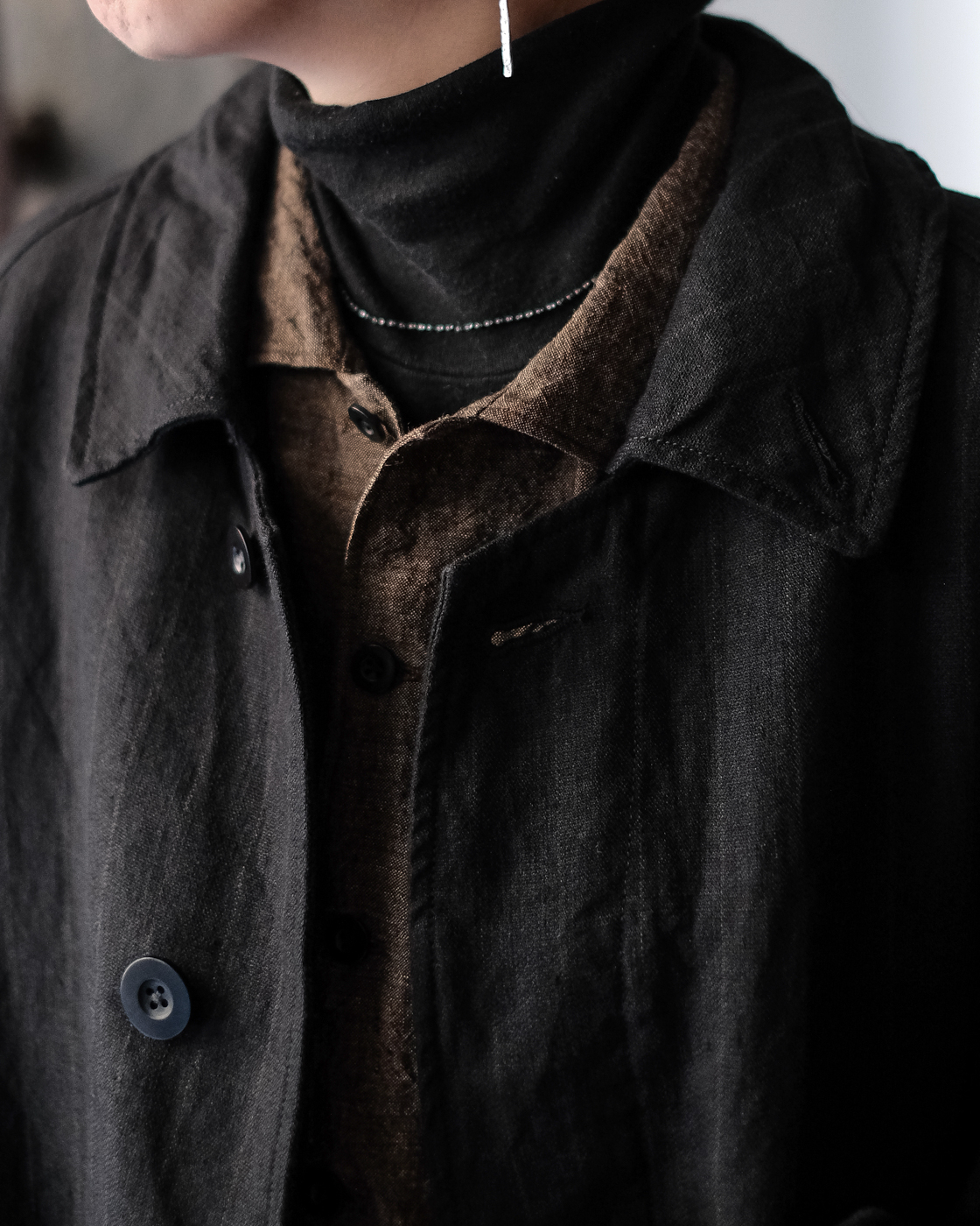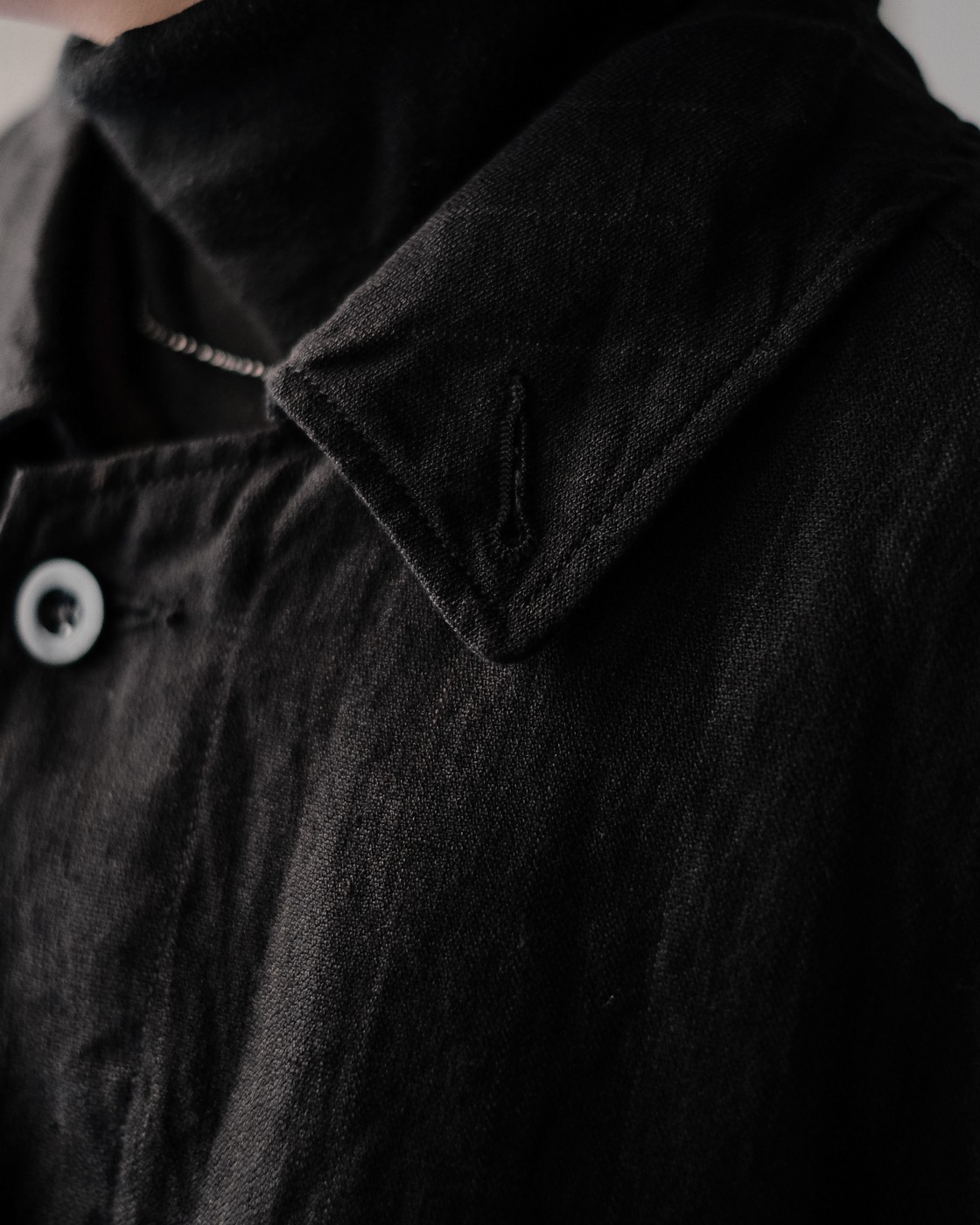 首元に沿うような襟元から、比翼ボタンのフロント部分。