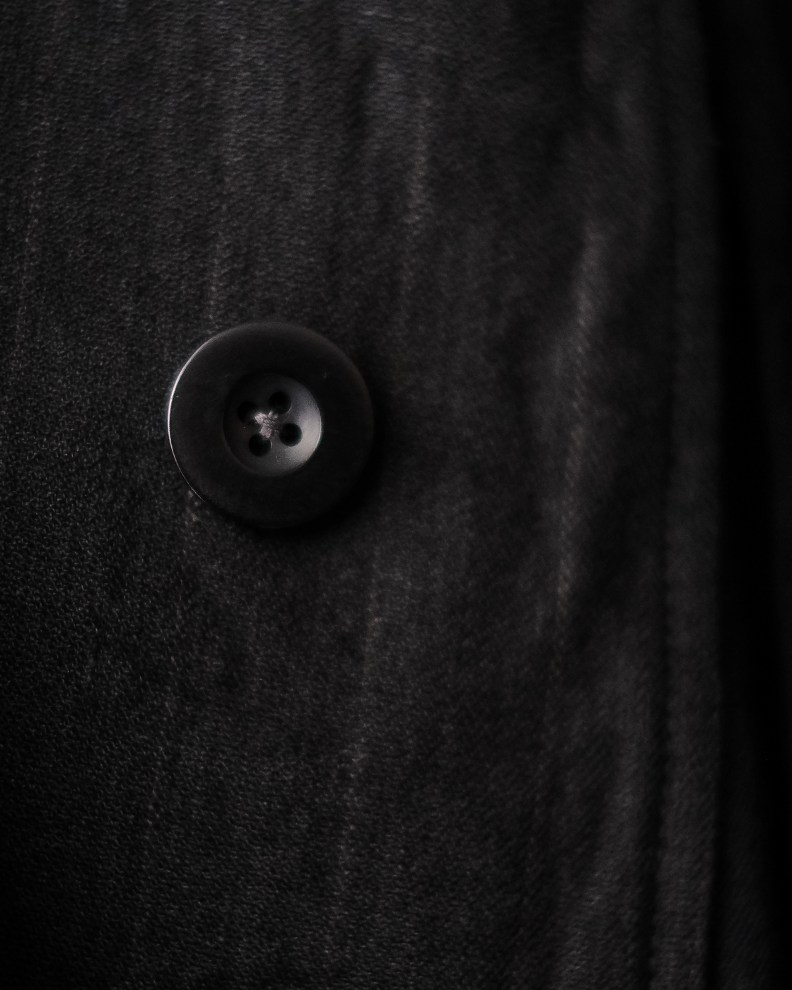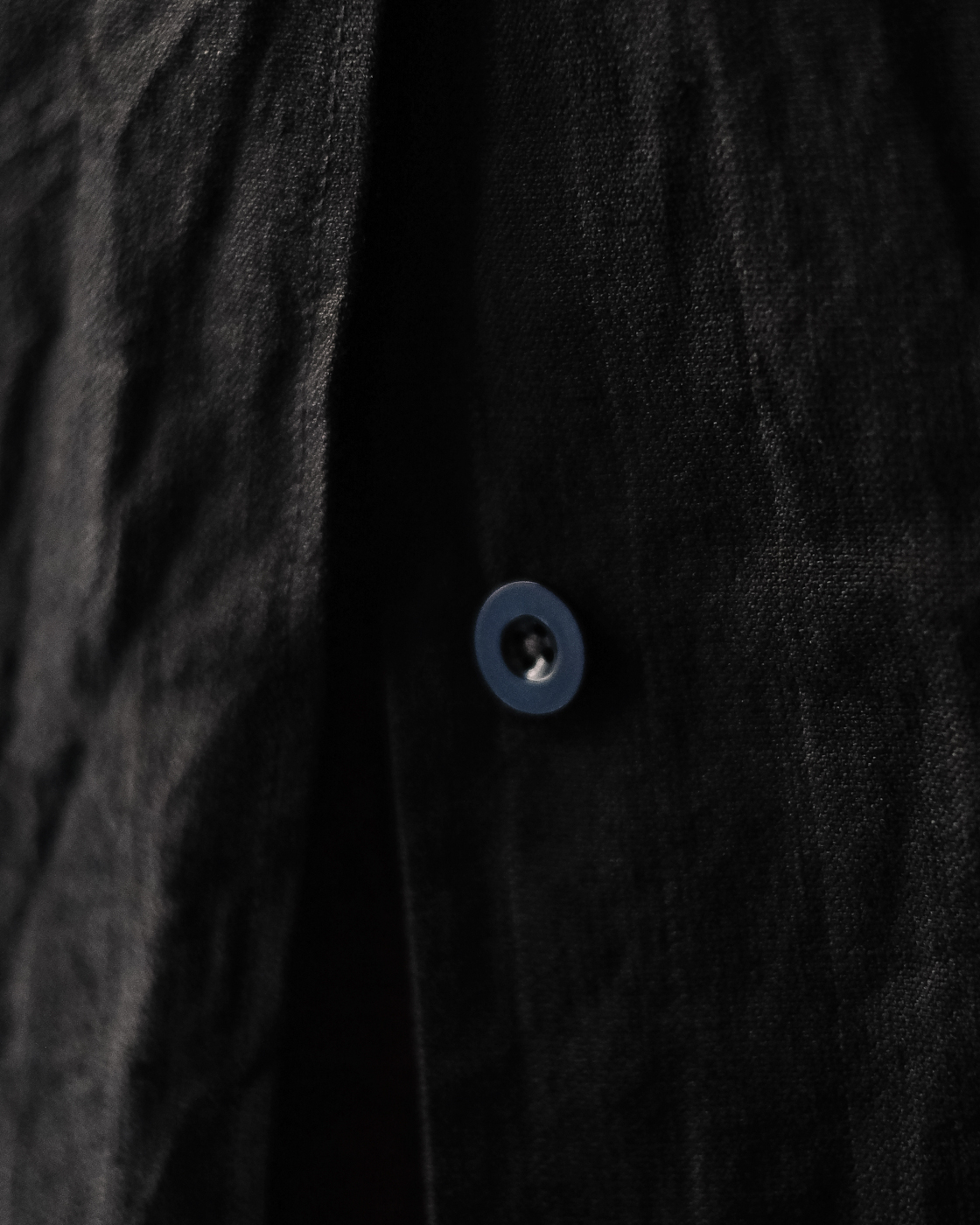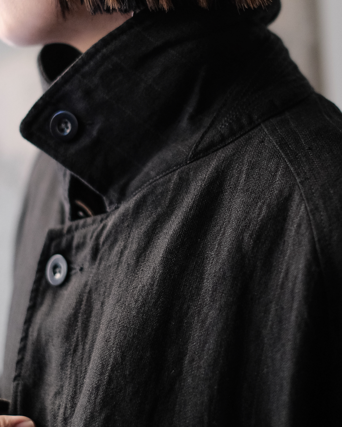 首元に沿うような襟元から、比翼ボタンのフロント部分。