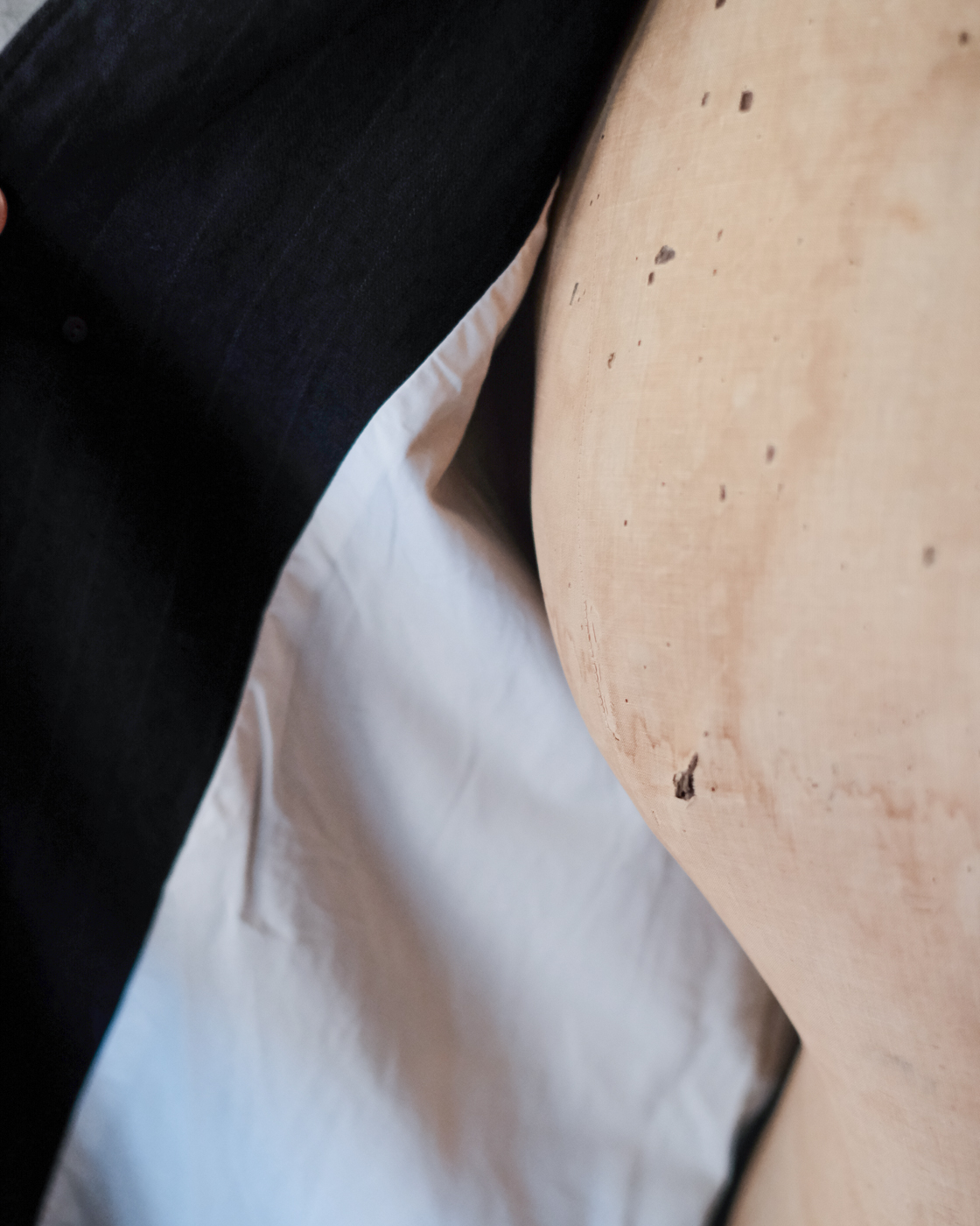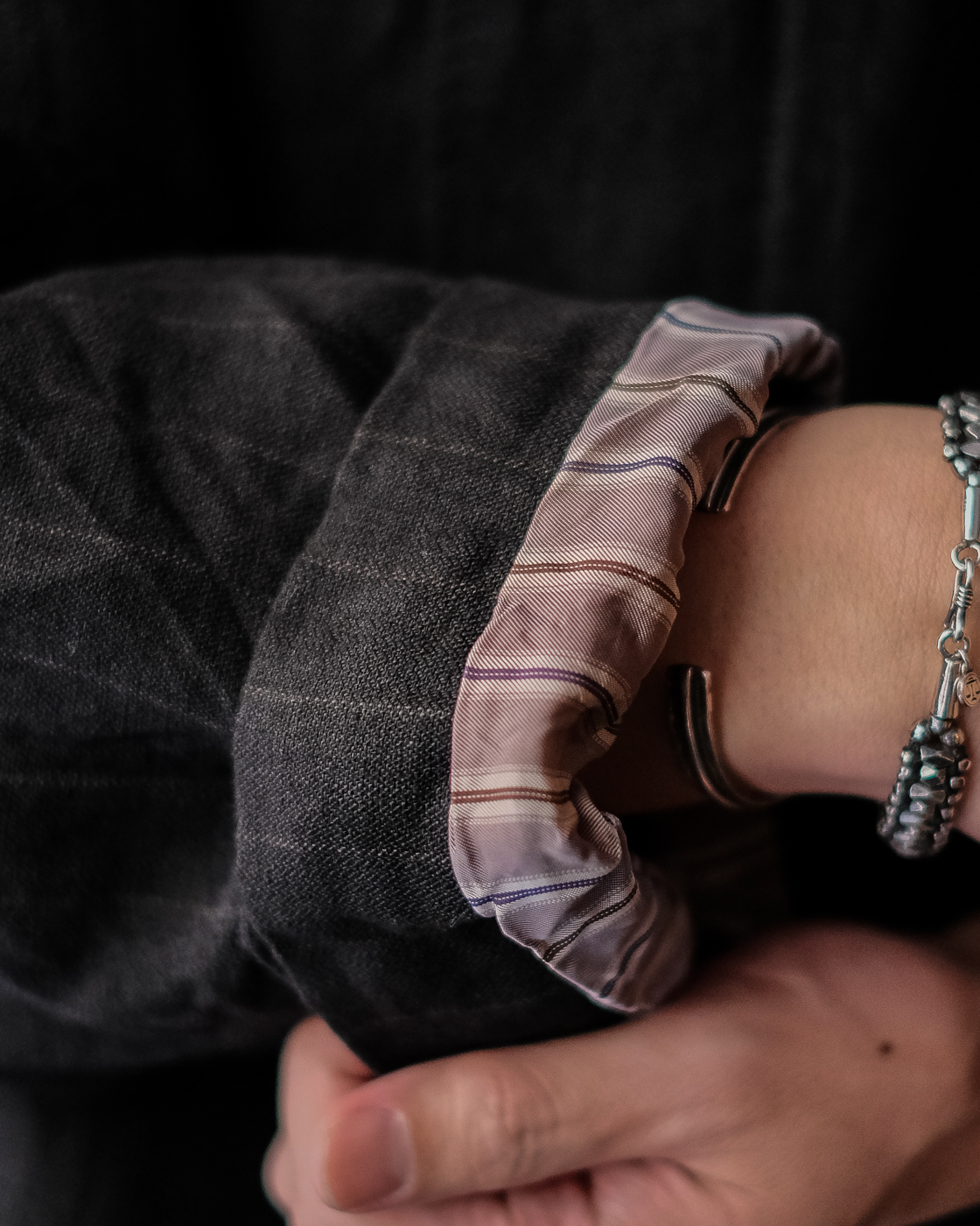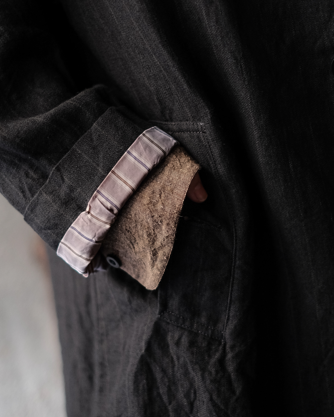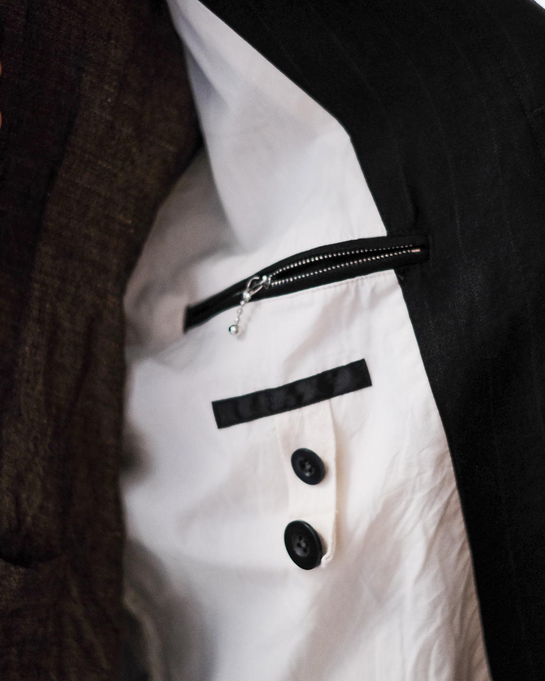 左側内ポケットに、お袖はストライプのキュプラ素材。袖通しが良く、お袖をちょっとロールアップした時に裏地が覗くのもアクセントに。