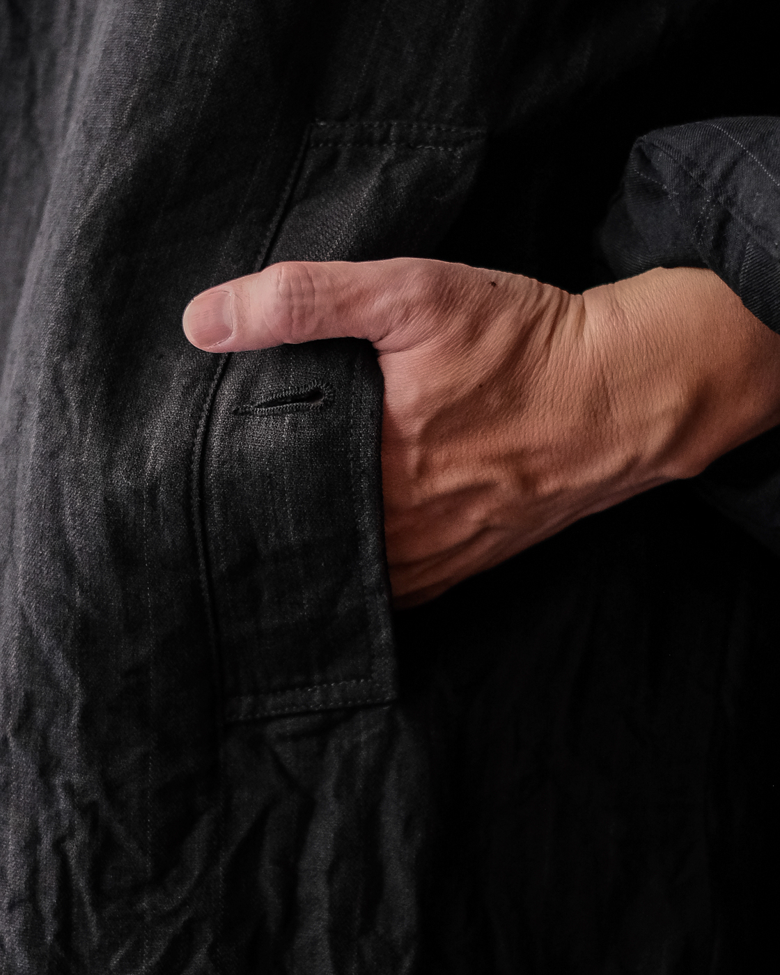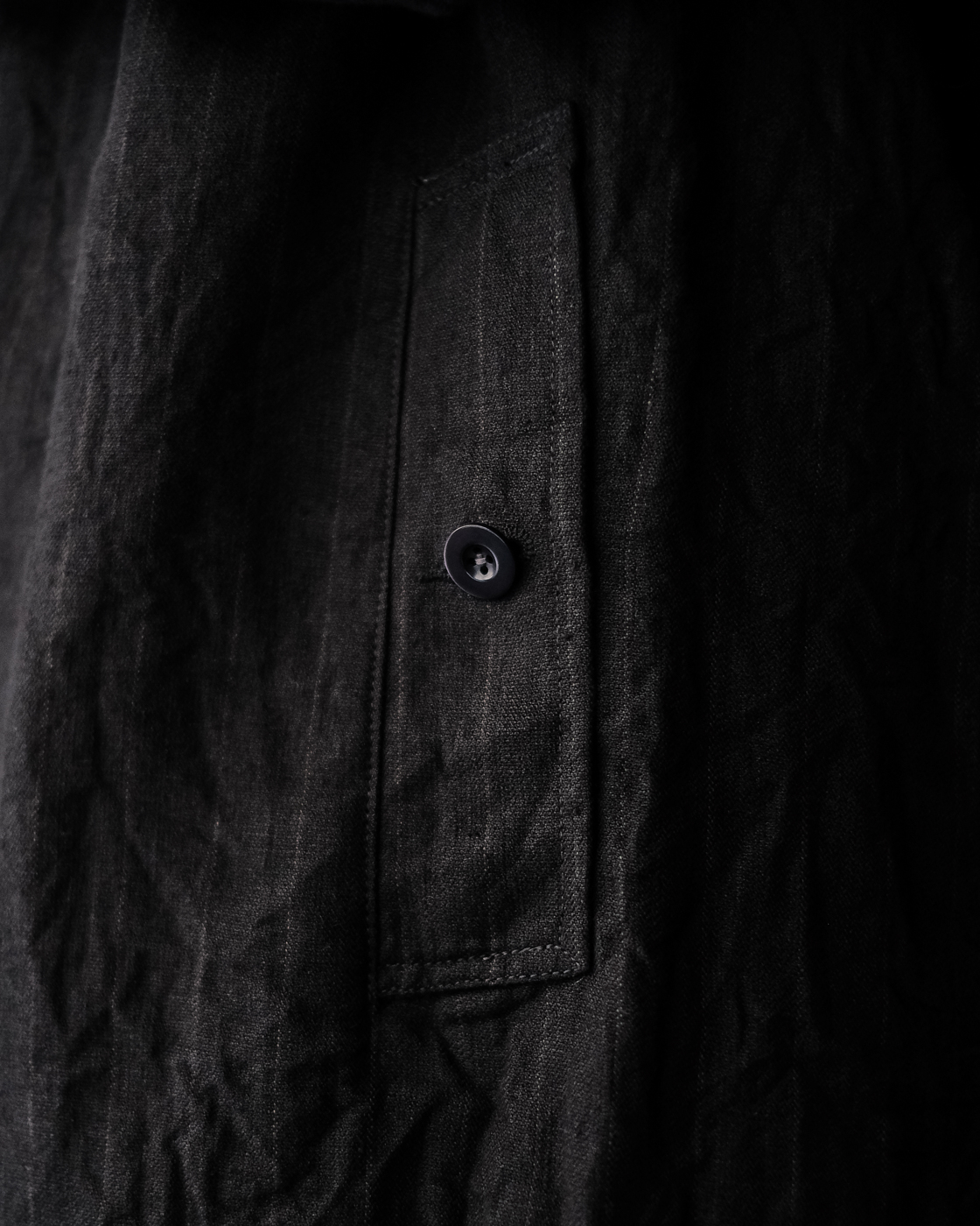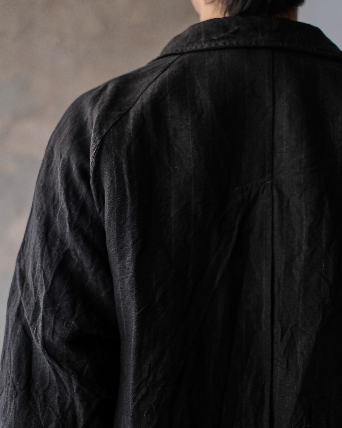 上質なリネンを使用し、経に40番手の強撚糸、緯に40番手の3/3ヘリンボン組織で素材感を強く仕上げた底深い色調のストライプリネン素材が大変魅力的。