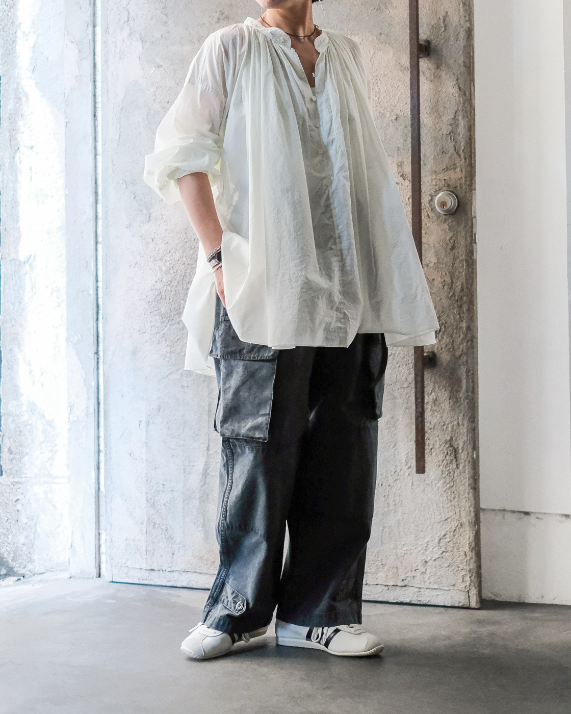 ヴィンテージのスモックを思わせるディテールを随所に取り入れながら、現代のスタイルにすっと馴染むシルエットの美しさを追求して製作されていることを随所に感じます。