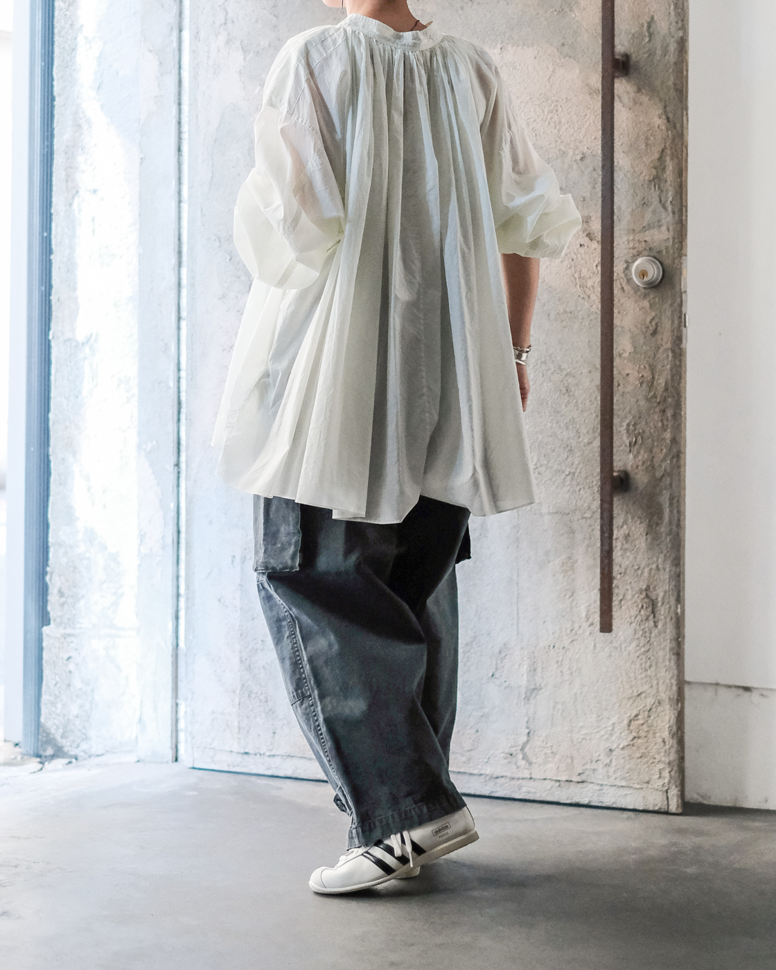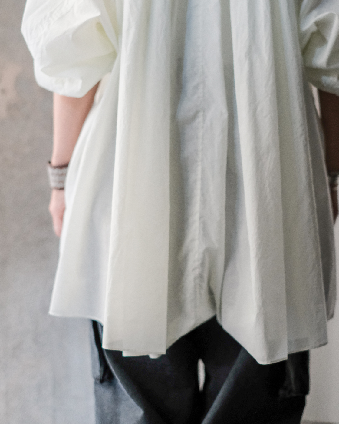 やや落ちた肩、袖口に施されたギャザーがふんわりと立体的に見せ、柔らかな雰囲気と女性らしさが。