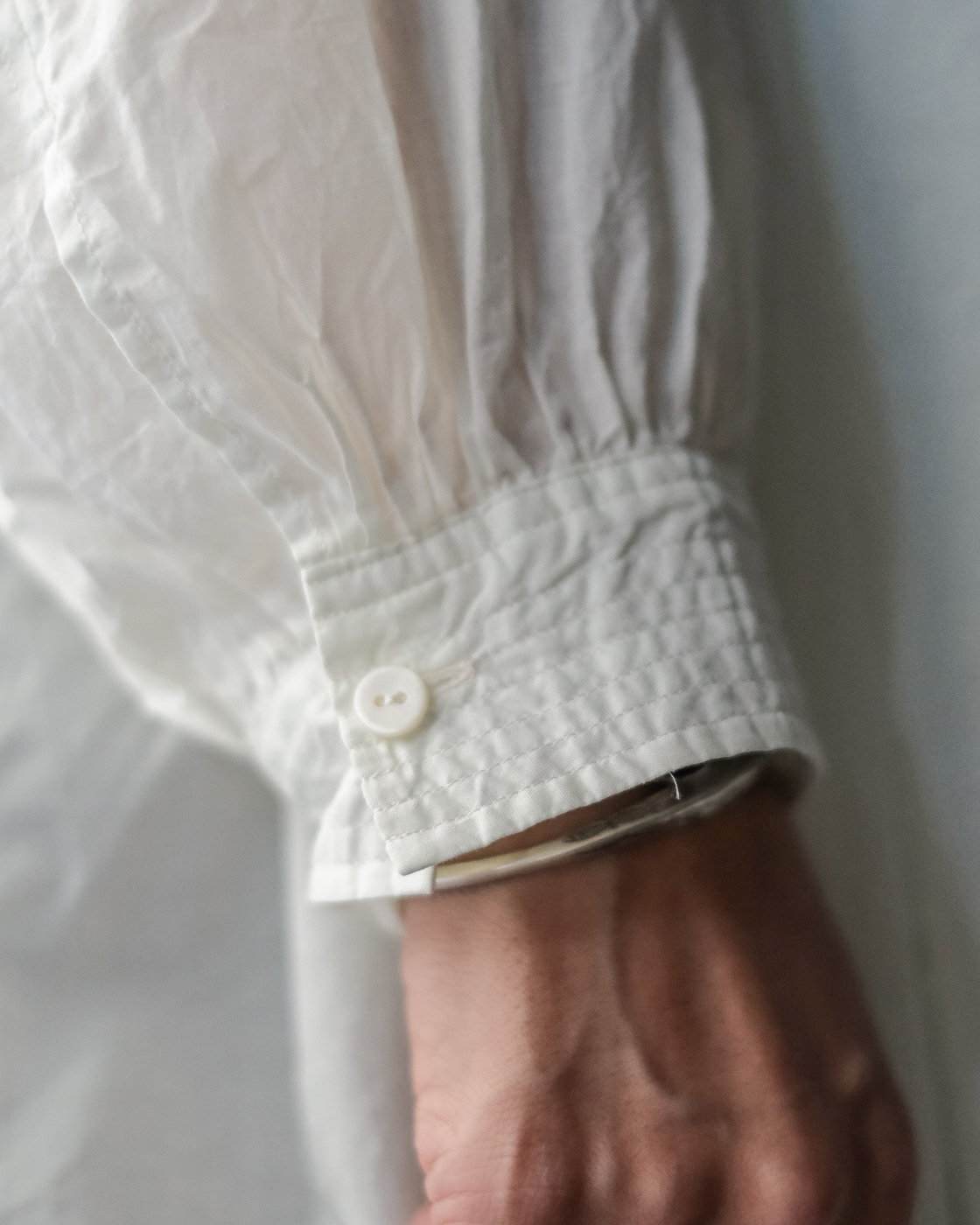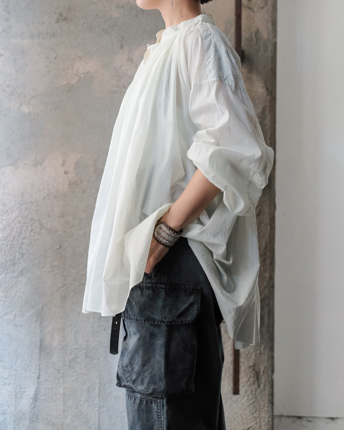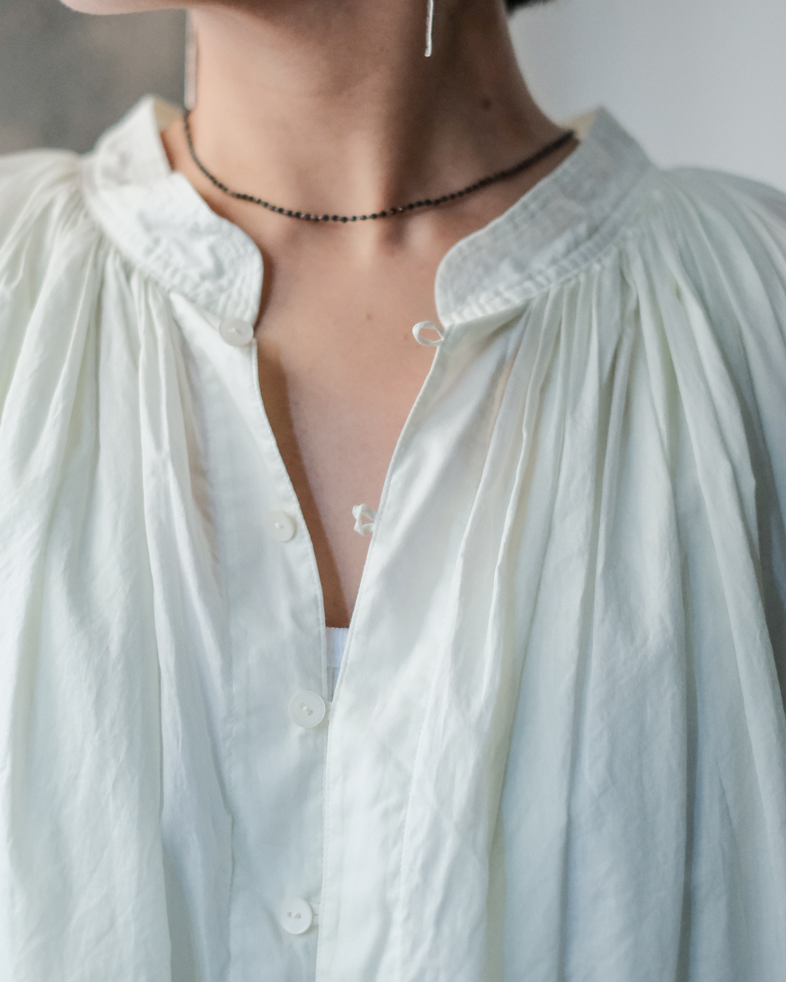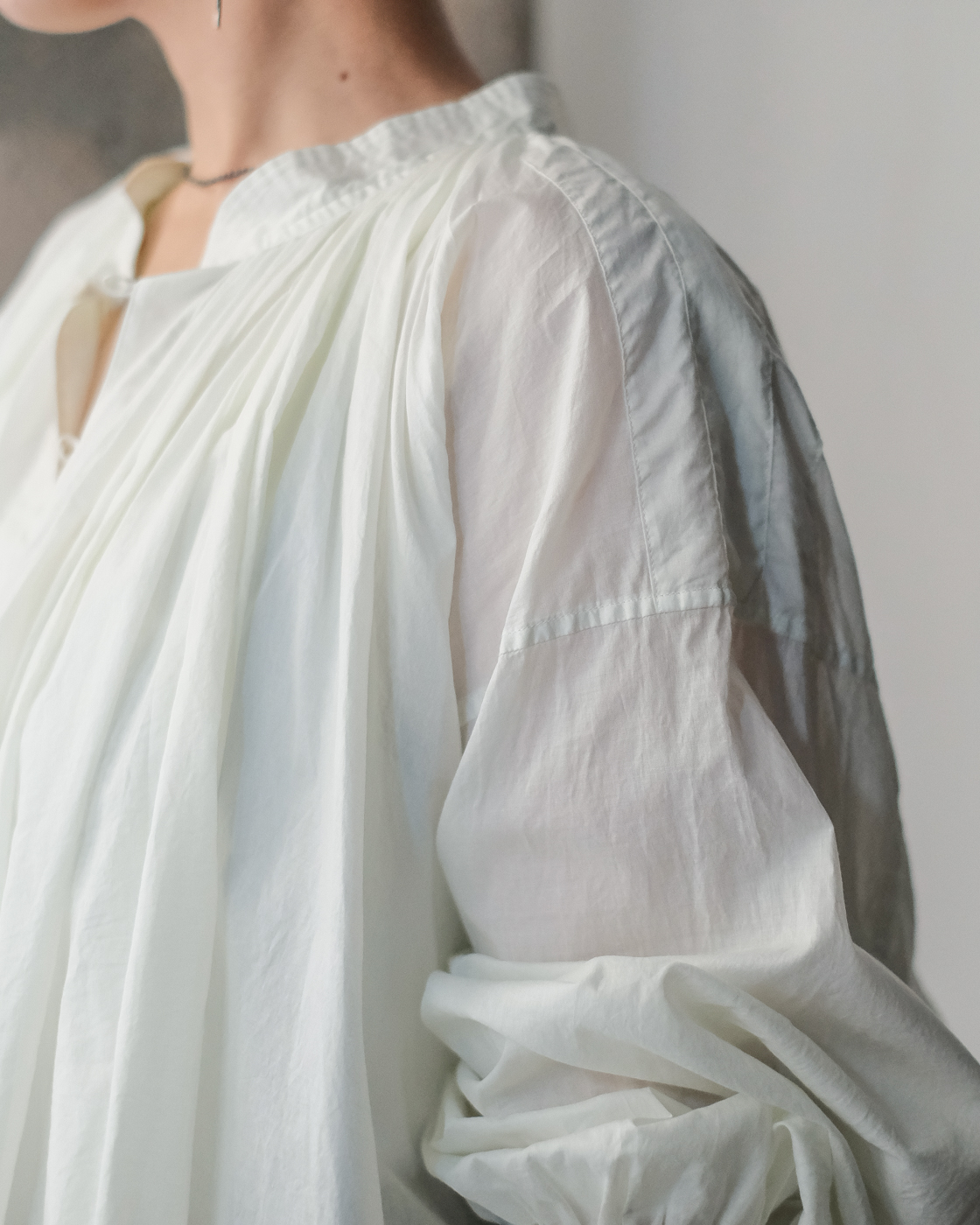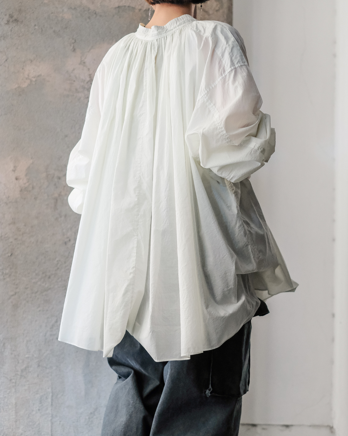 19世紀の古いスモックをベースに製作された細やかなギャザーに丁寧な縫製に思わず目が止まる、存在感のあるブラウス。