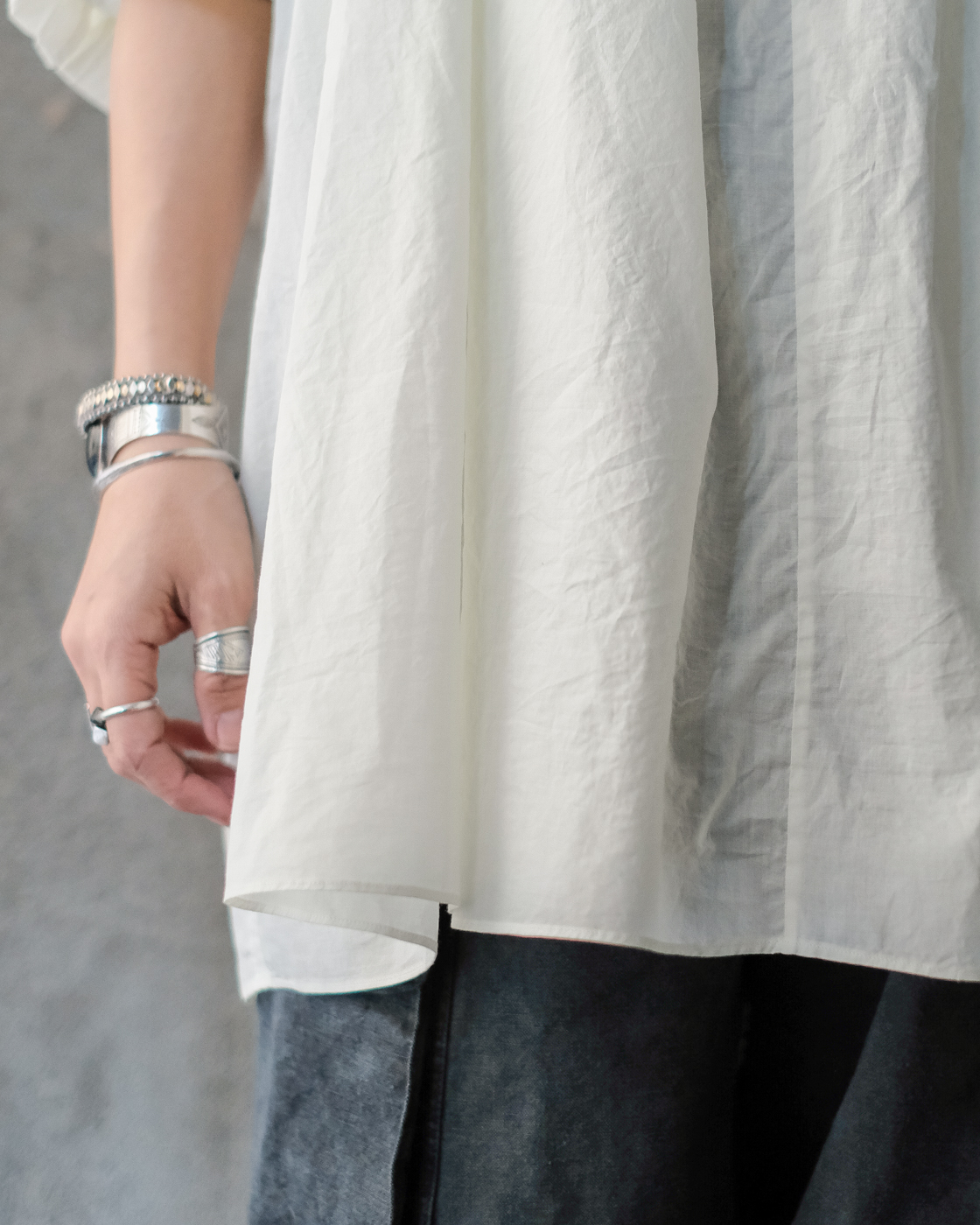 着用するとゆったりとした着心地に、裾にかけて自然と落ち感があり緩やかに広がるシルエット。