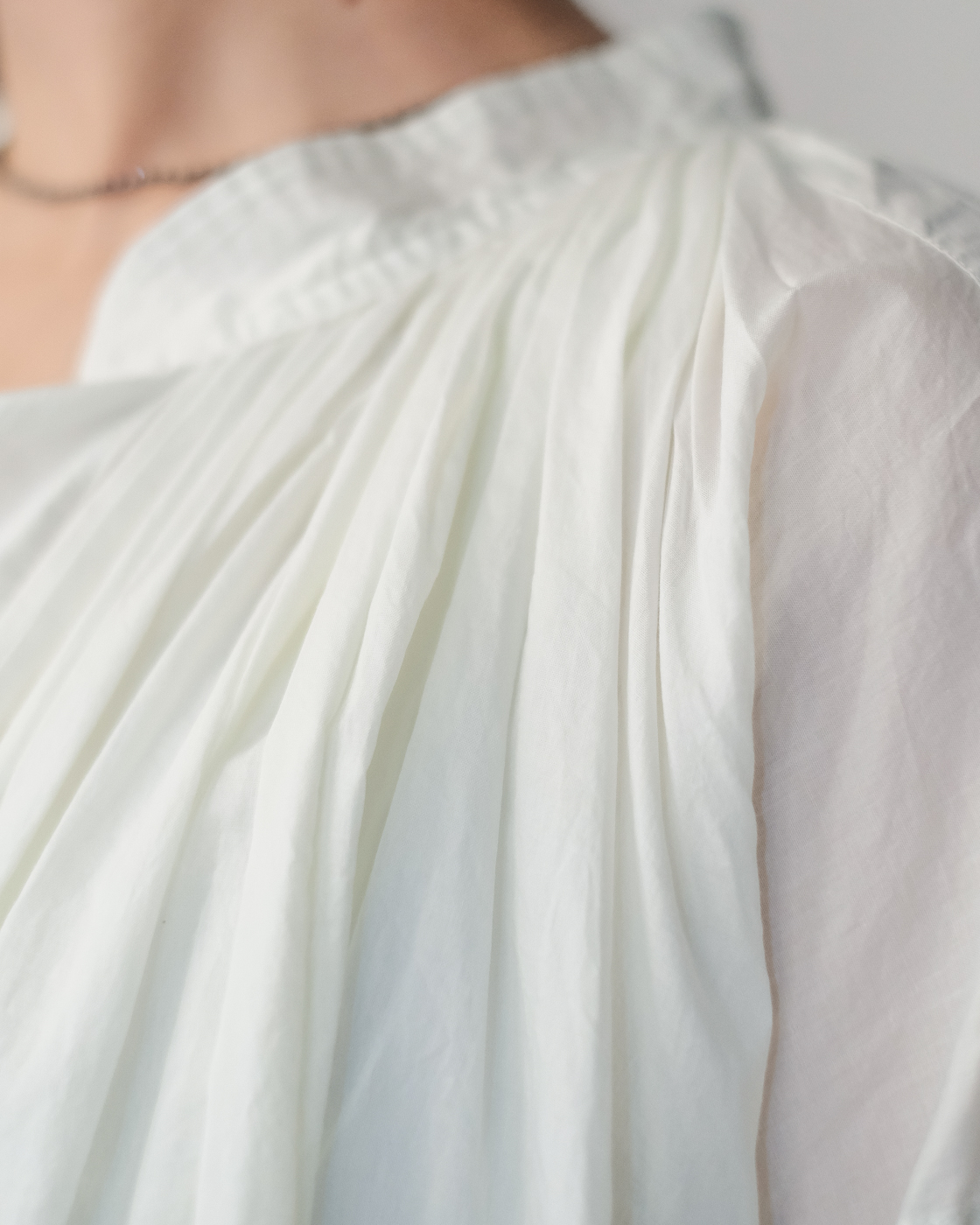 肩の直線的なパターンや脇下のガゼット、首周りに施された細やかで繊細なギャザーなど