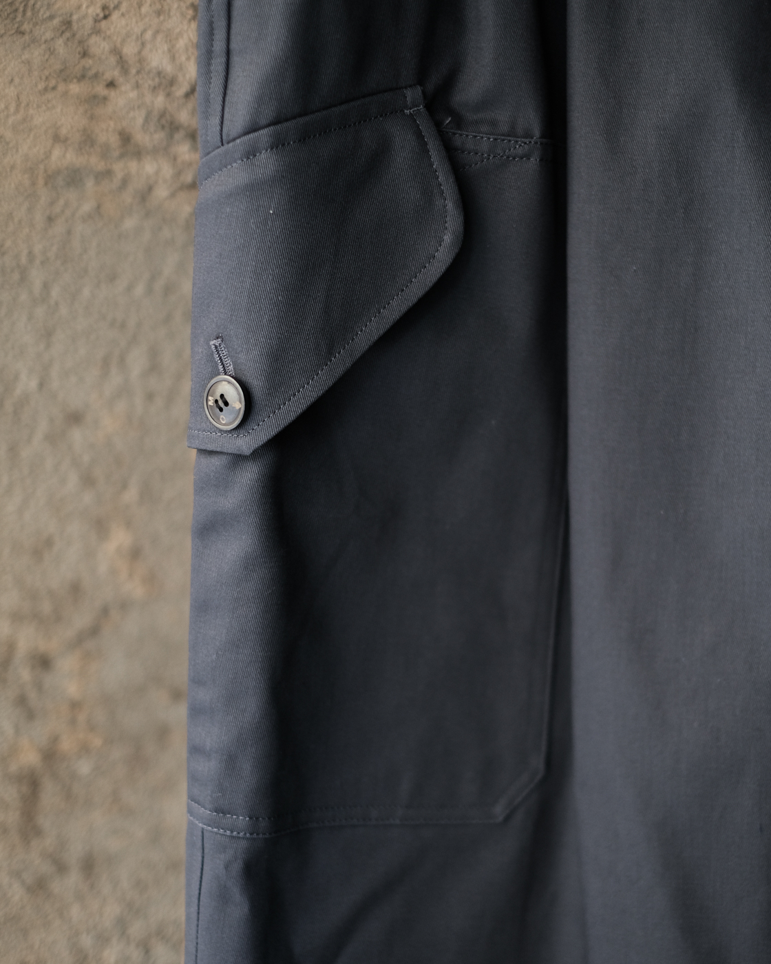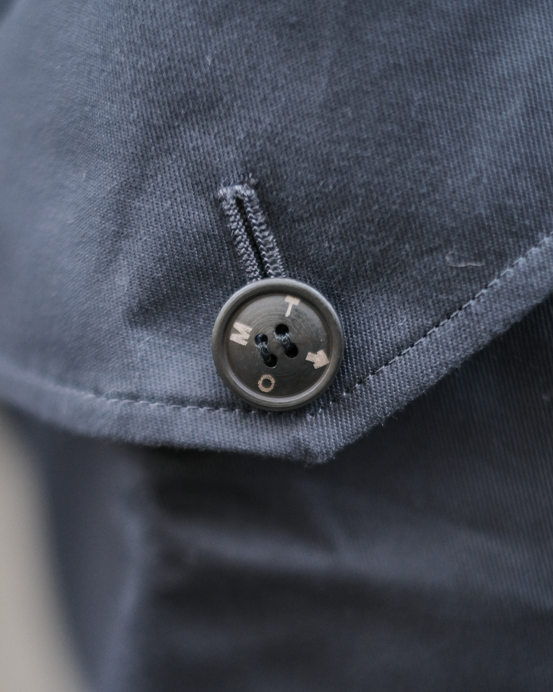 ポケットに対して斜めに付いたフラップが特徴的。ボタン部分もOLDMAN’S TAILORオリジナルのボタンがアクセントに。