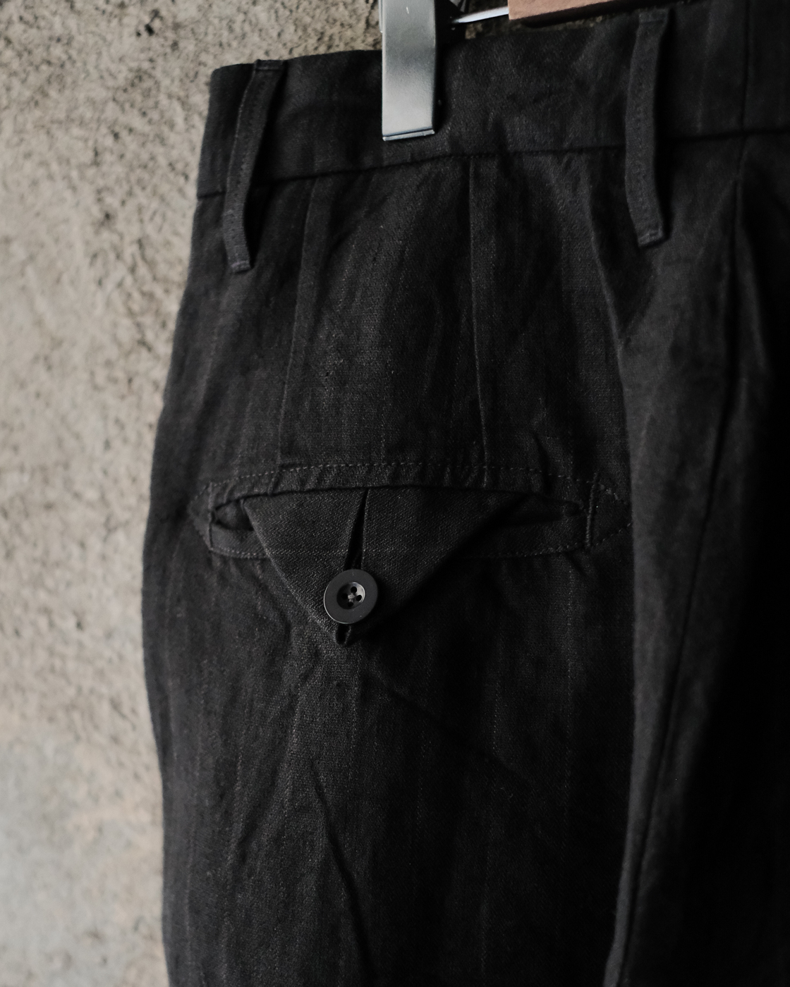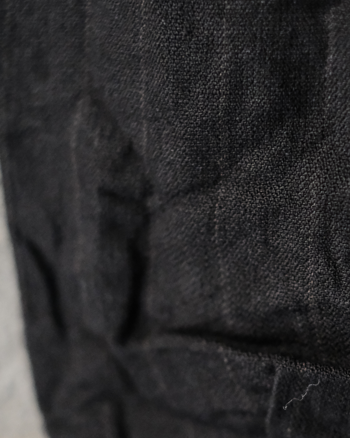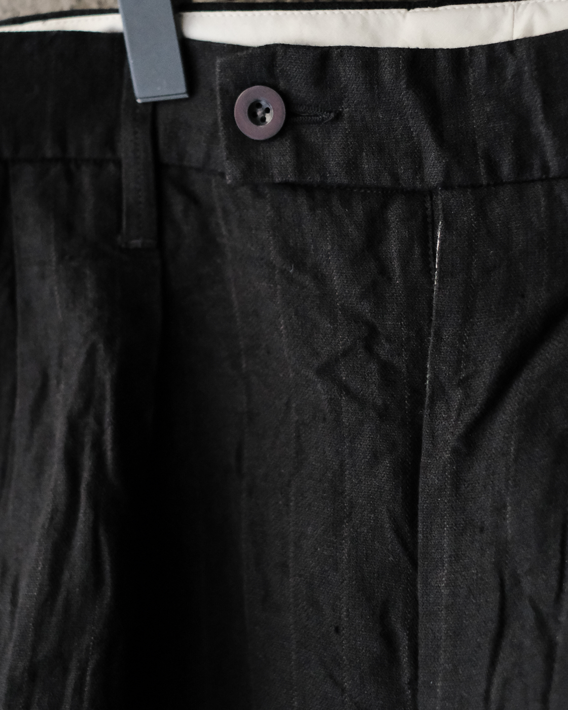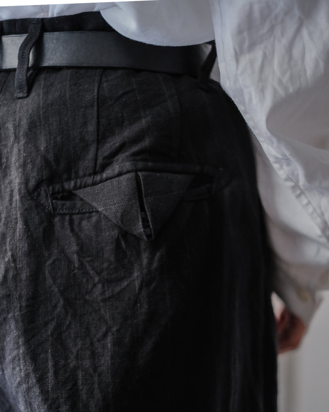 上質なリネンを使用し、経に40番手の強撚糸、緯に40番手の3/3ヘリンボン組織で素材感を強く仕上げた底深い色調のストライプリネン素材が大変魅力的。