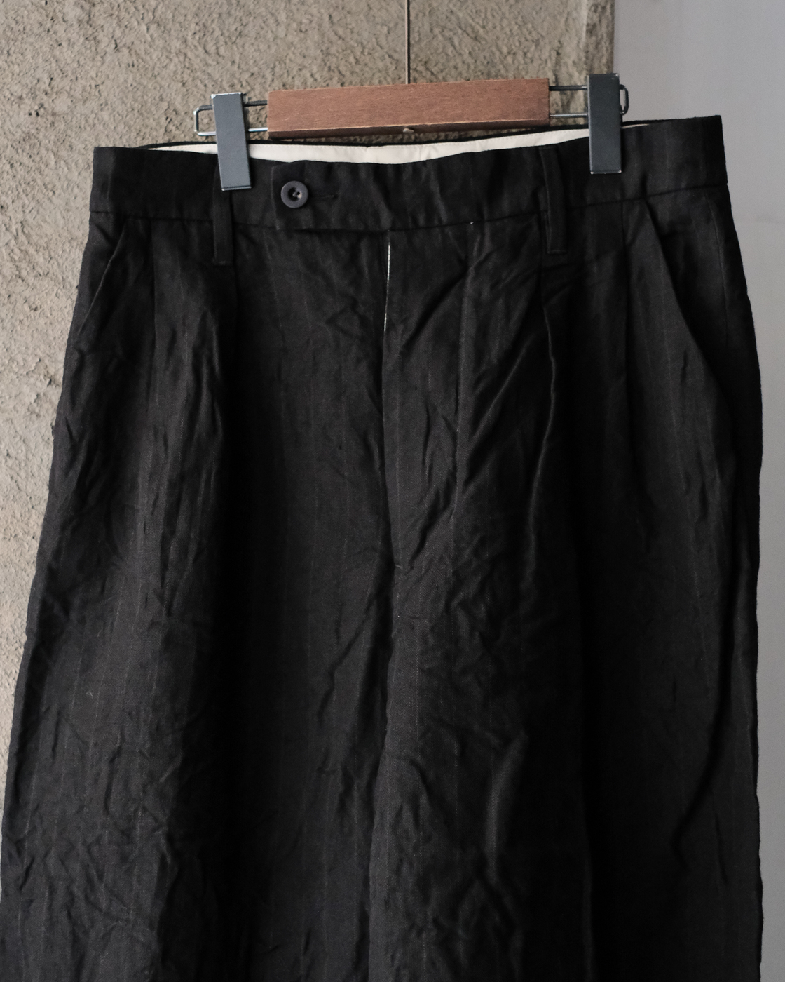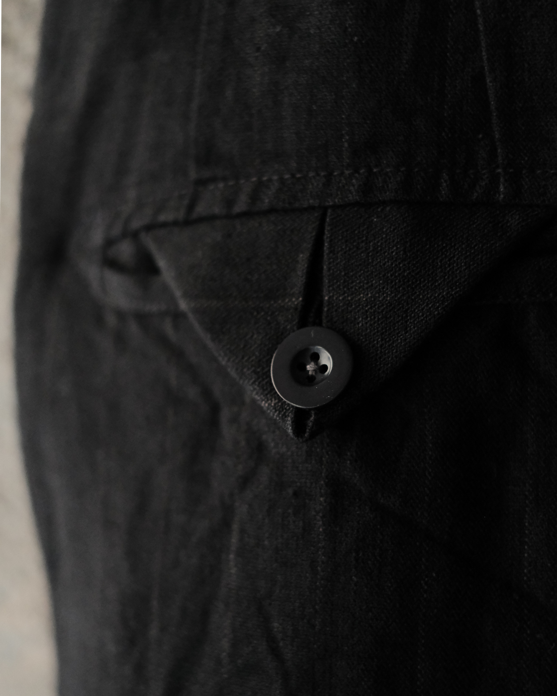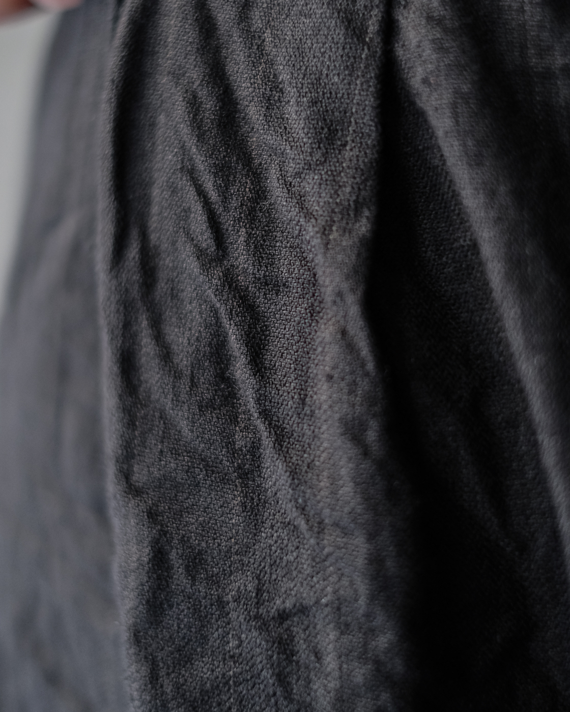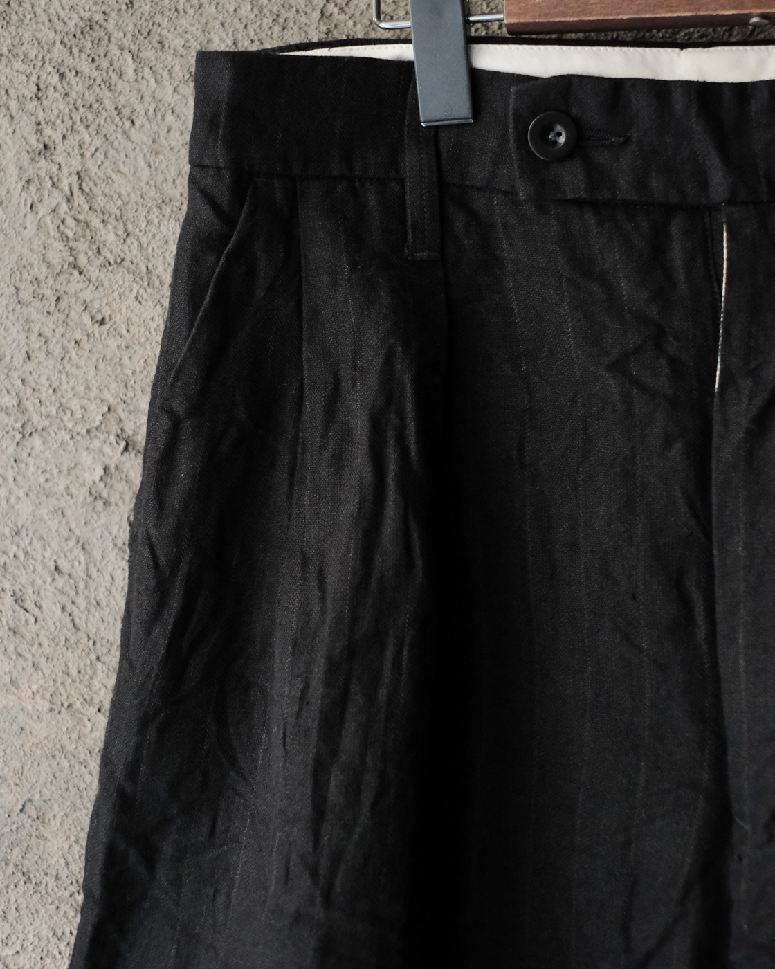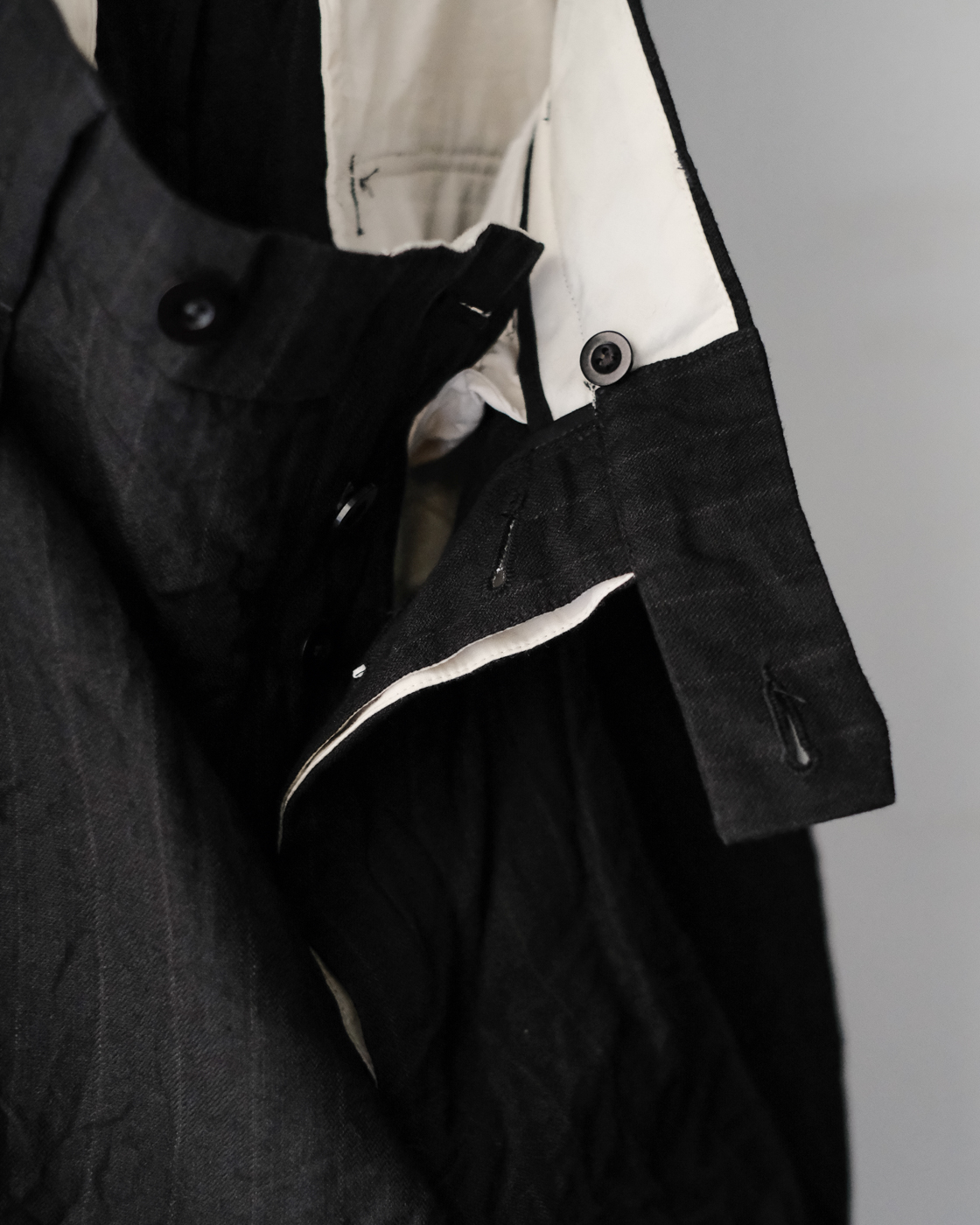 上質なリネンを使用し、経に40番手の強撚糸、緯に40番手の3/3ヘリンボン組織で素材感を強く仕上げた底深い色調のストライプリネン素材が大変魅力的。