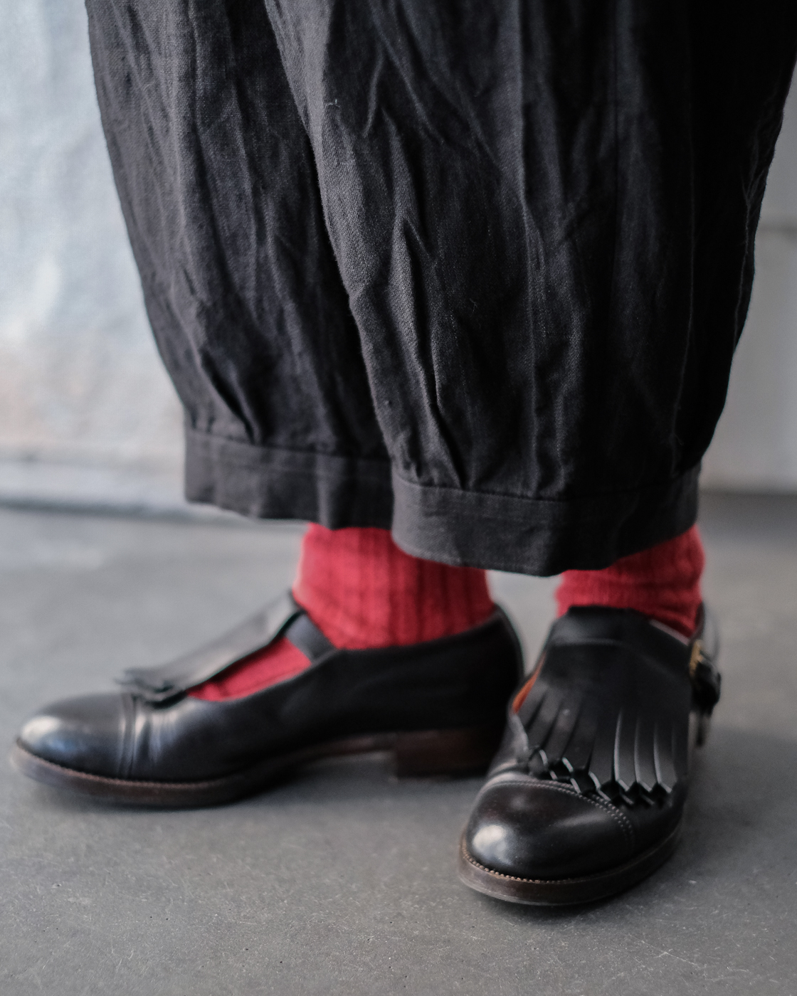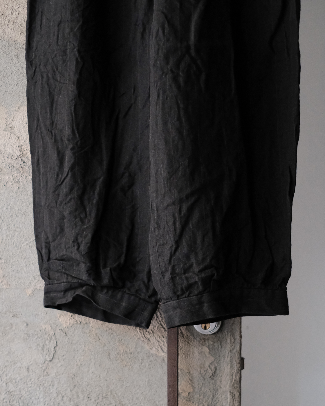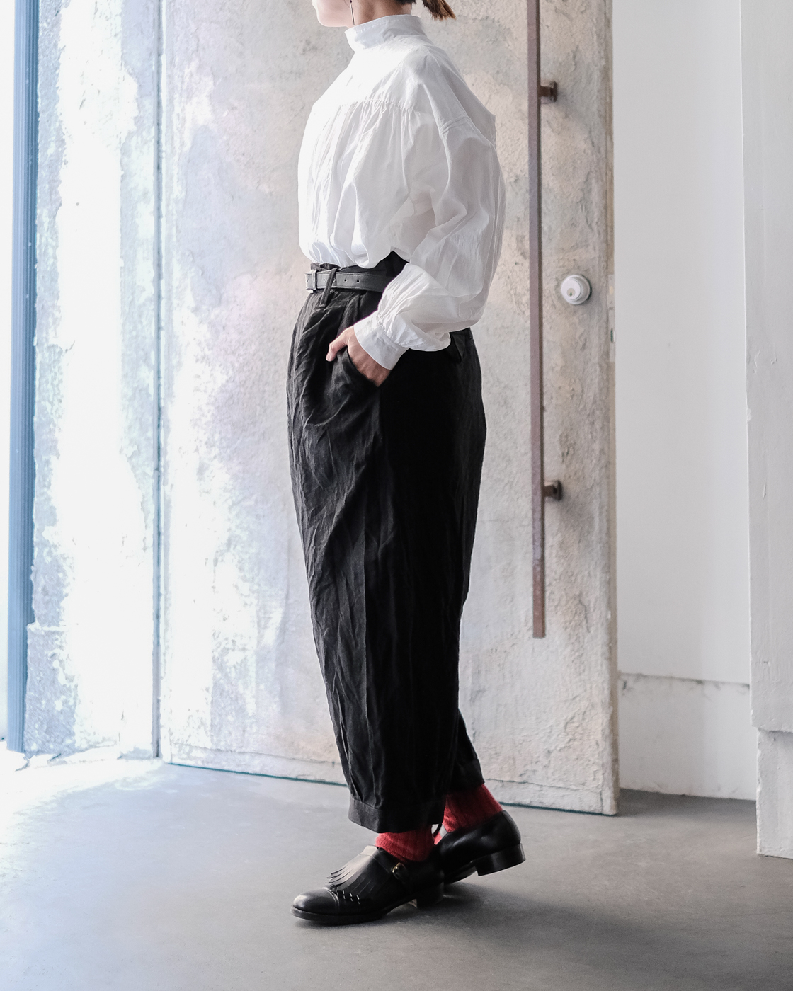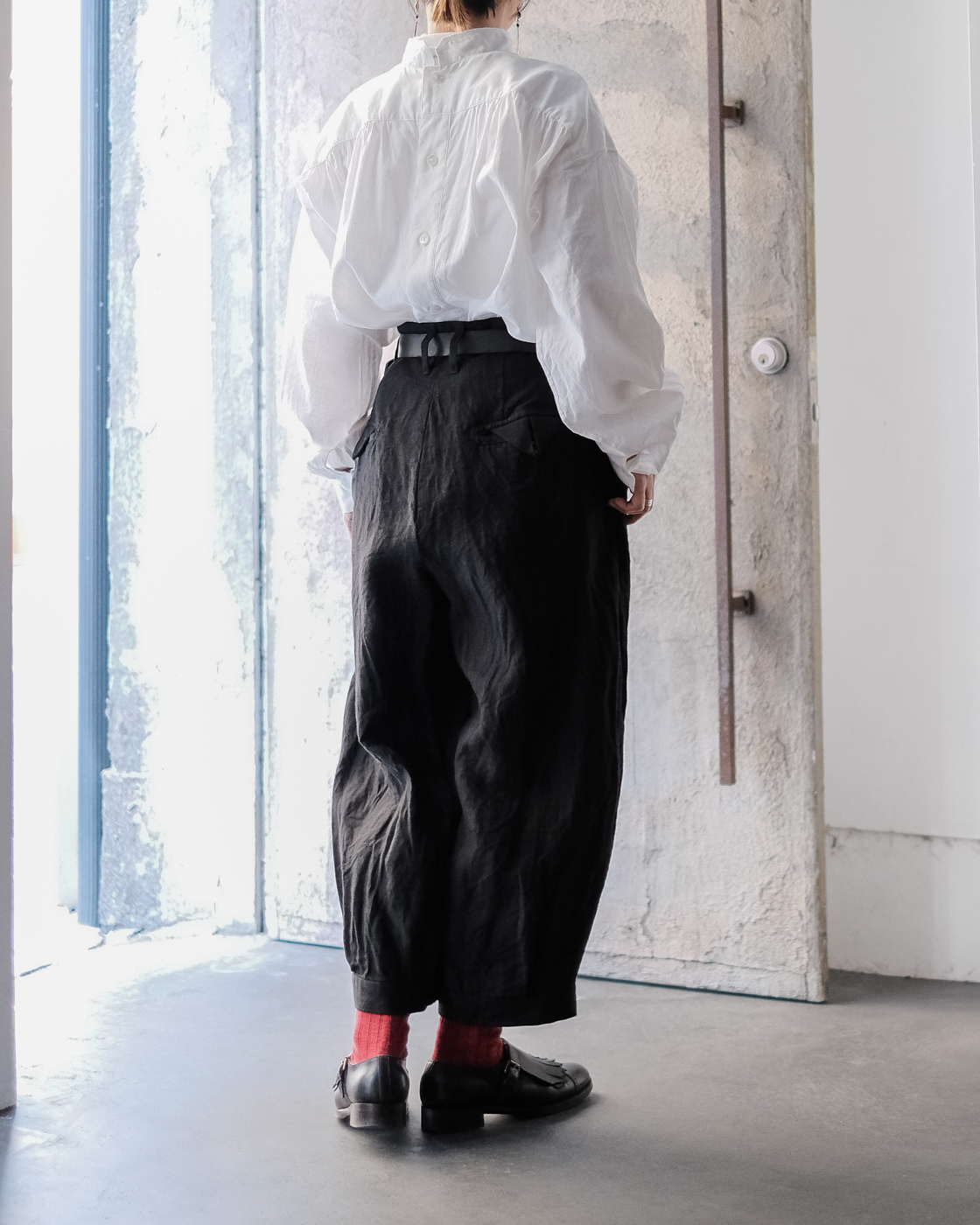 一見シンプルに見えながら、ウエスト、裾部分2タックを計算しており、タックが入る事で生み出される独特なシルエット。