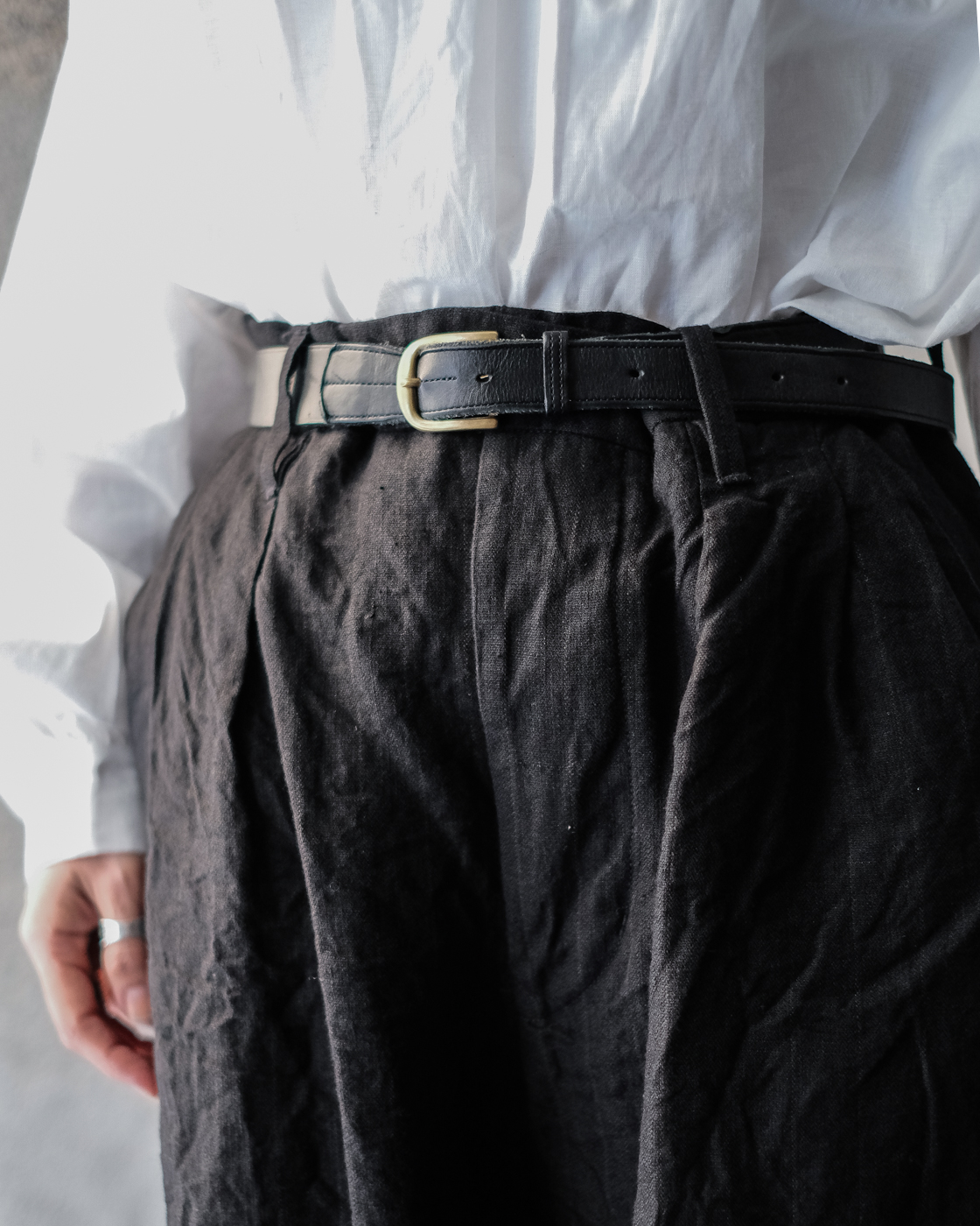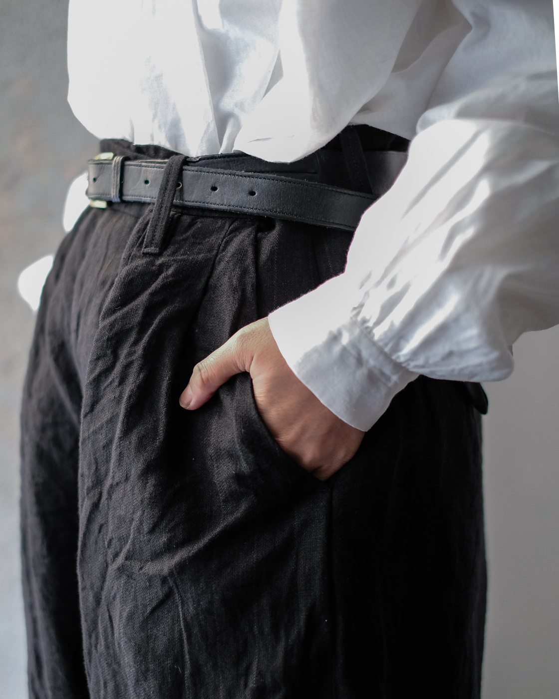 ウエストをベルトでぎゅっと絞って8分丈のバランスで着用していただいたり、腰で落としてご着用頂くとワイドパンツのようにも。