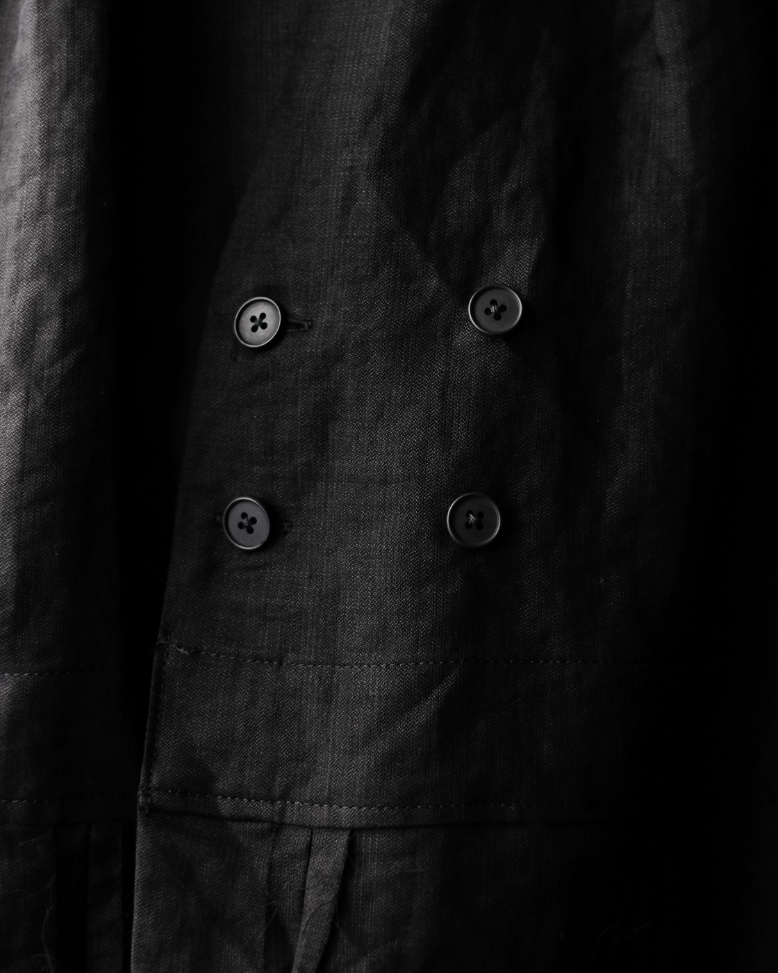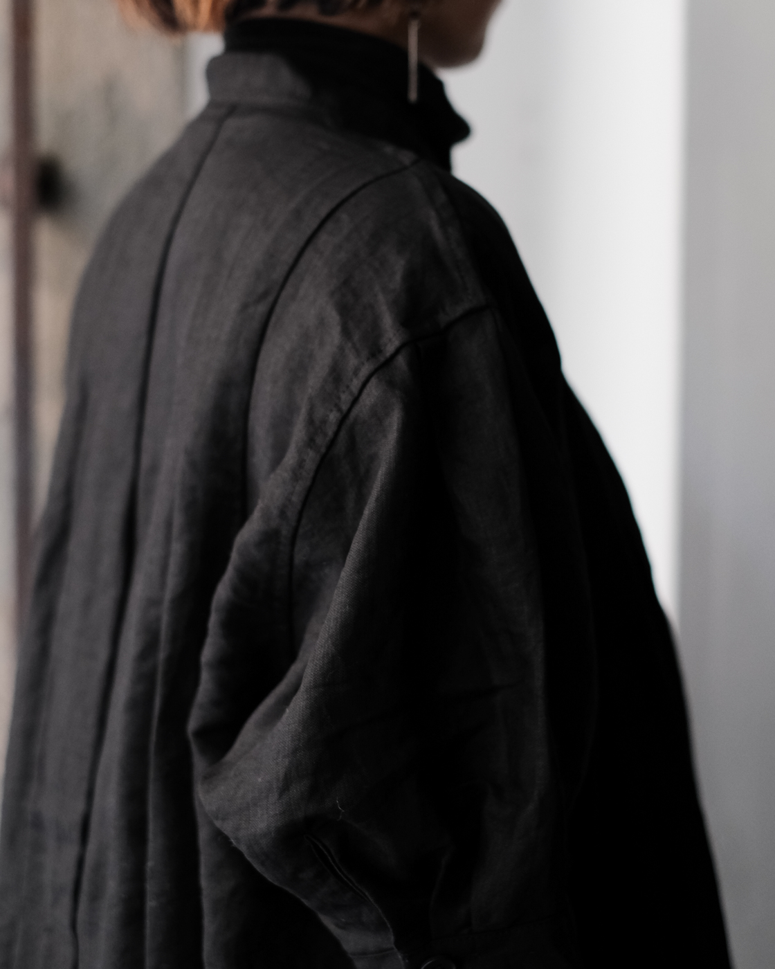 緯に強撚綿糸、経にラミーを打ち込んだテクスチャーの強いドビーをさらに引き締める加工を足して製作された生地。
